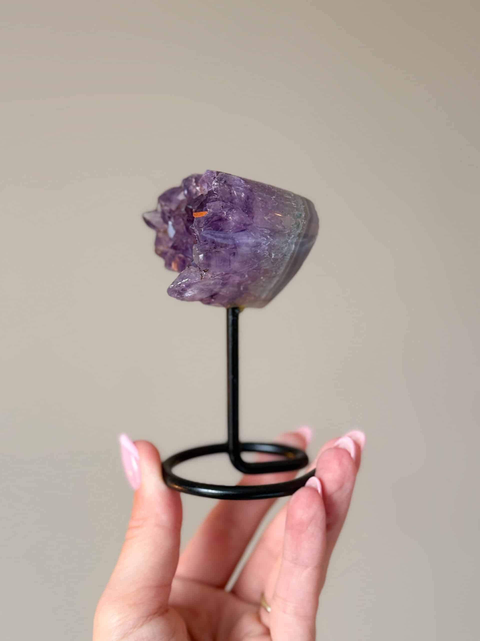 De amethist staat bekend om zijn kalmerende en beschermende werking op de geest. Het bevordert innerlijke rust, vermindert stress en angst, en kan helpen bij slapeloosheid en hoofdpijn. Daarnaast wordt de steen geassocieerd met spirituele groei en intuïtie, en kan het ondersteuning bieden bij meditatie.
