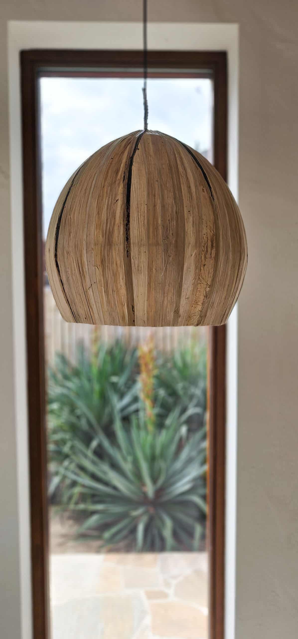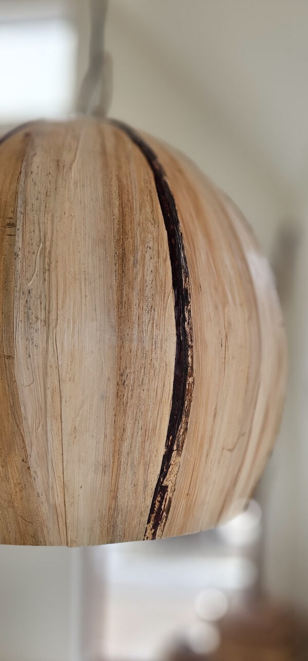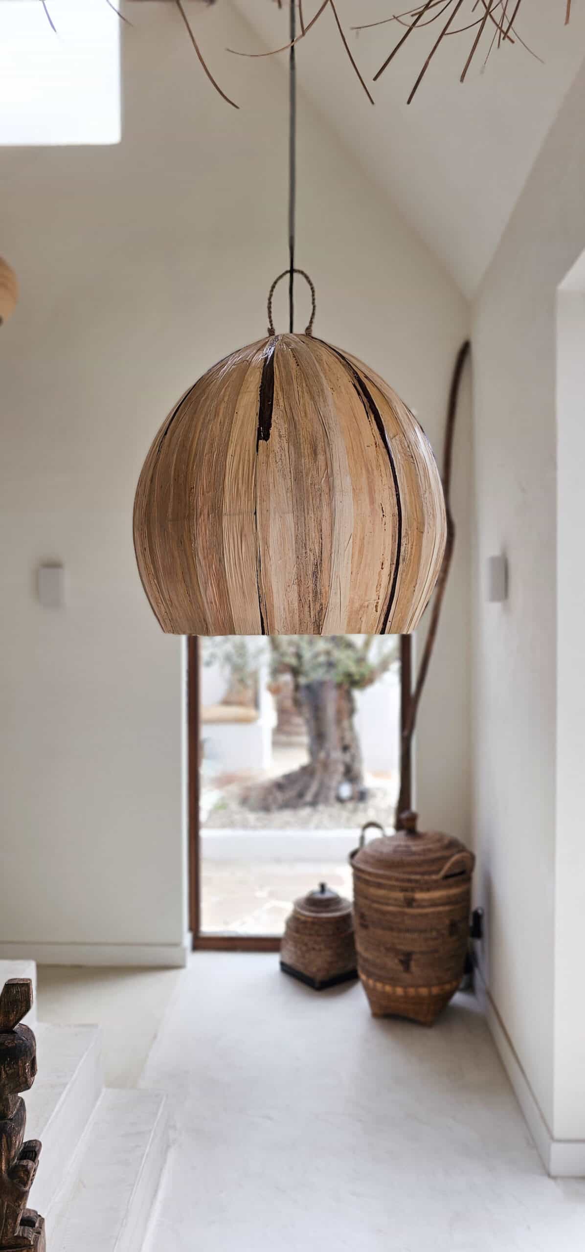 Een elegante bolvormige hanglamp, vervaardigd uit lichtgekleurd bananenblad, die een warme en natuurlijke sfeer in je interieur brengt. De lamp verspreidt een zacht en diffuus licht, ideaal voor een gezellige en rustieke uitstraling. De lichte tinten en organische textuur maken deze lamp perfect voor een bohemian, Scandinavisch of tropisch interieur. Een stijlvolle en duurzame keuze die zowel karakter als warmte toevoegt aan elke ruimte.