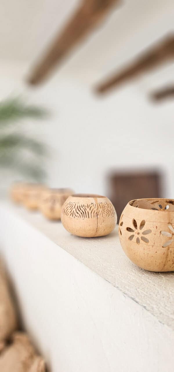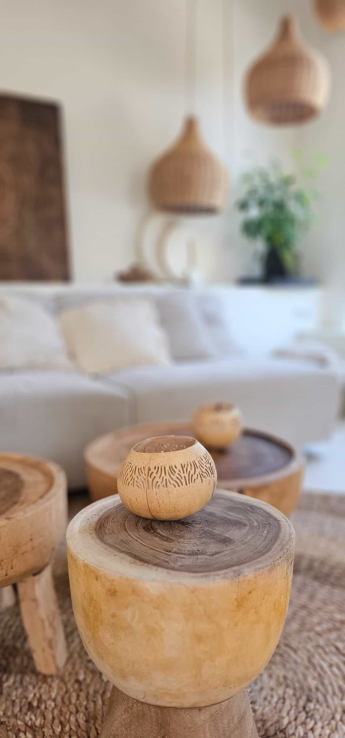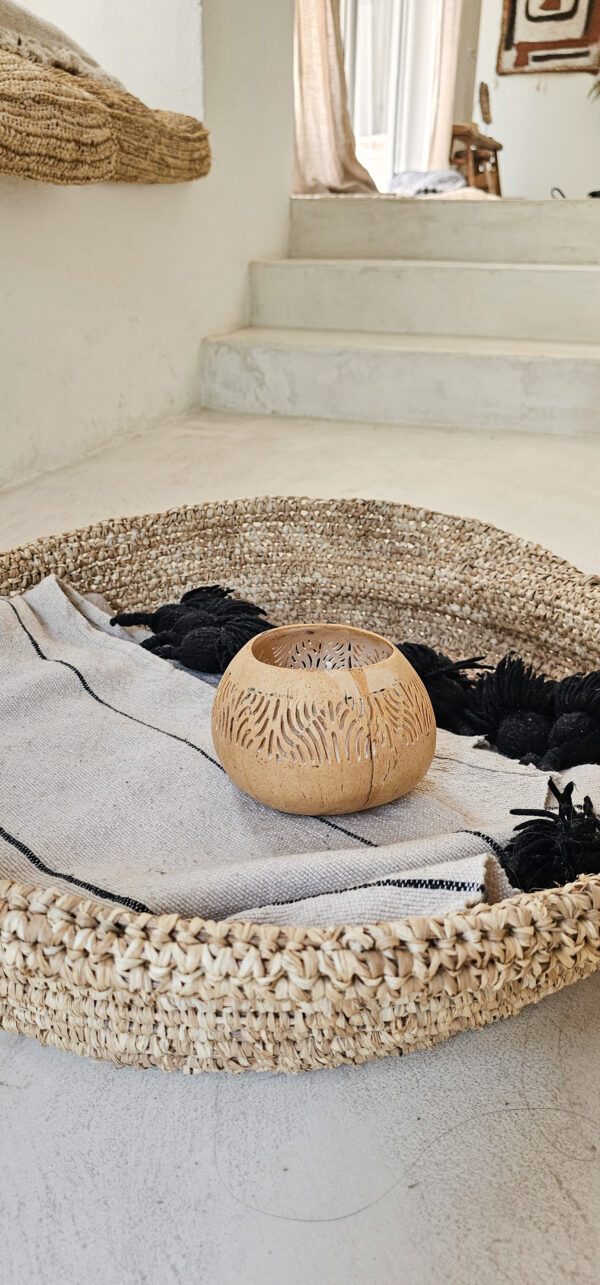Een uniek kokos bakje met schubben, waarin een geurloze kaars is verwerkt. Dit natuurlijke en decoratieve stuk straalt warmte en authenticiteit uit, dankzij het bijzondere patroon van de bladnerven het organische karakter van de kokosnoot. Ideaal voor sfeervolle verlichting in verschillende ruimtes, zoals de woonkamer, badkamer of terras. De neutrale uitstraling maakt het gemakkelijk te combineren met diverse interieurstijlen, van bohemian tot rustiek.