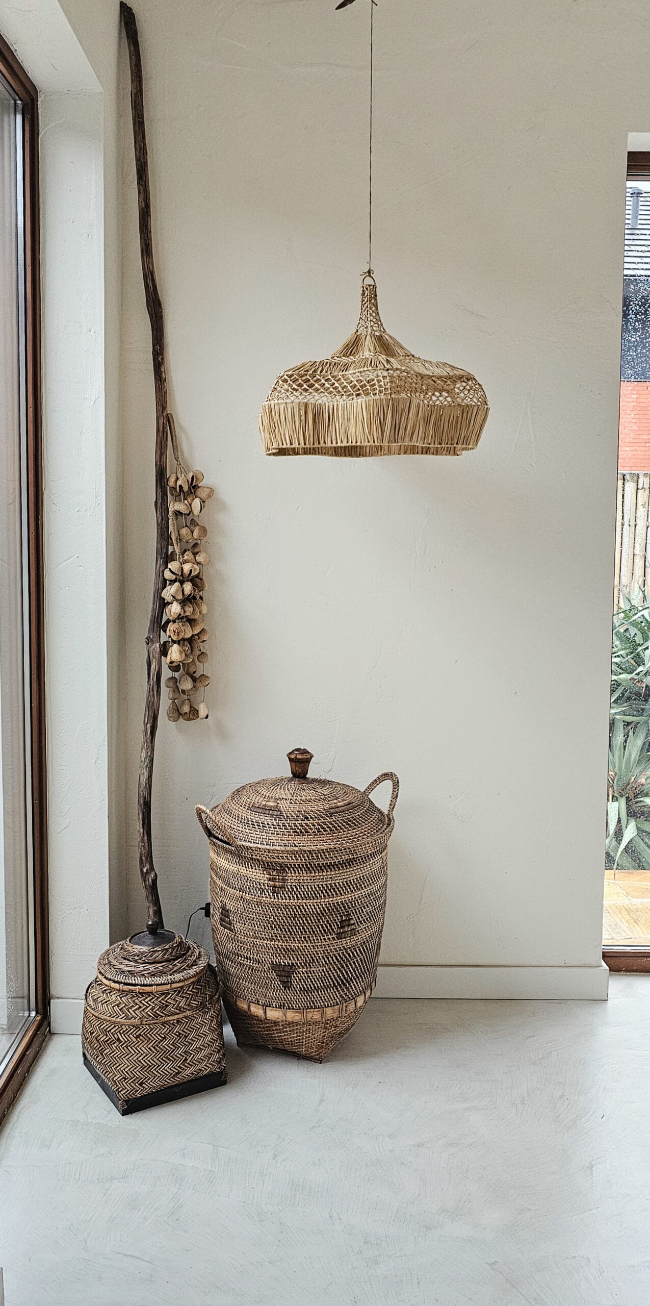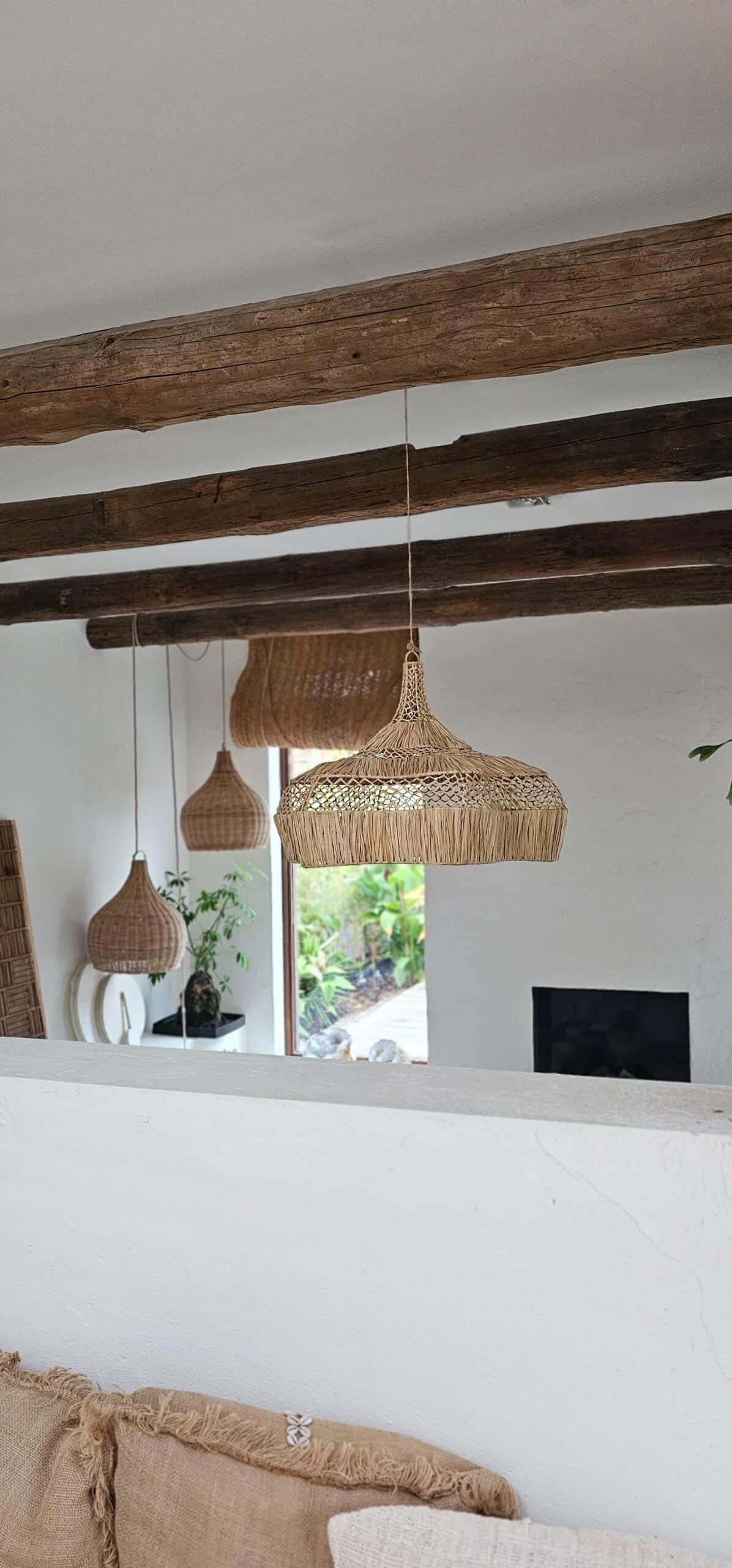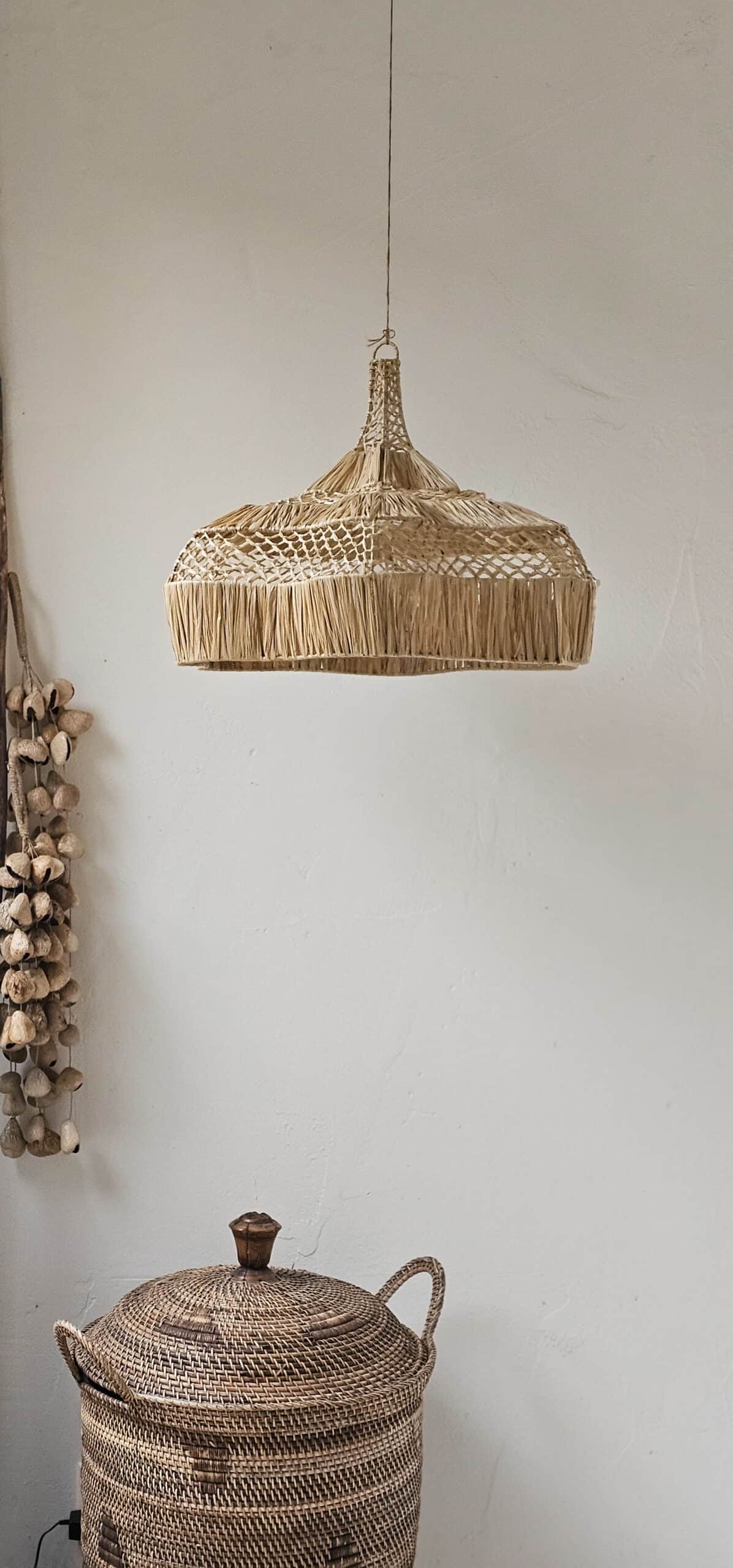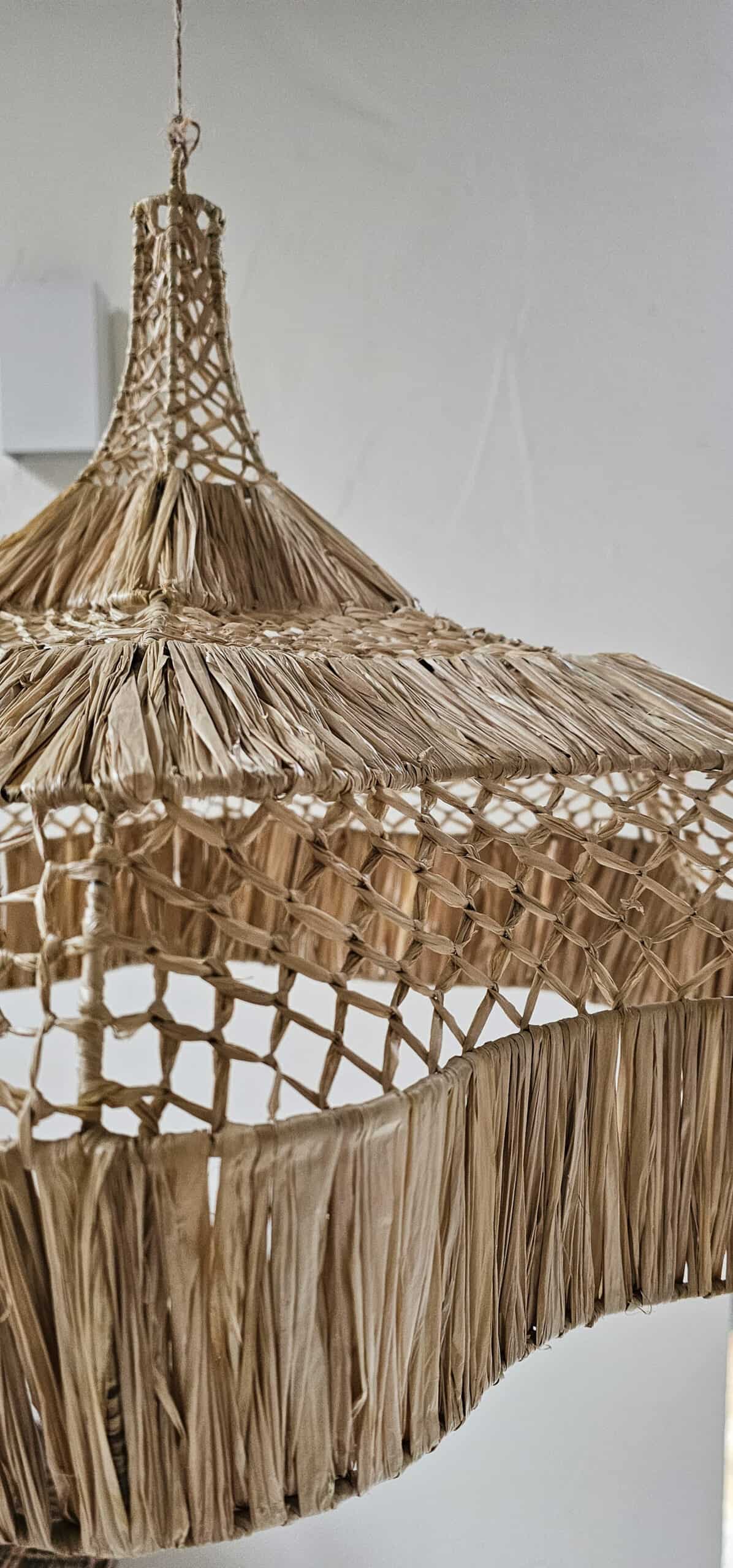 Deze unieke hanglamp is een ode aan Balinese vakmanschap. Met de hand gevlochten uit natuurlijke raffiavezels, vormt ze een levendige textuur en een warme gloed in elke ruimte. Perfect voor liefhebbers van natuurlijke materialen en karaktervolle details.