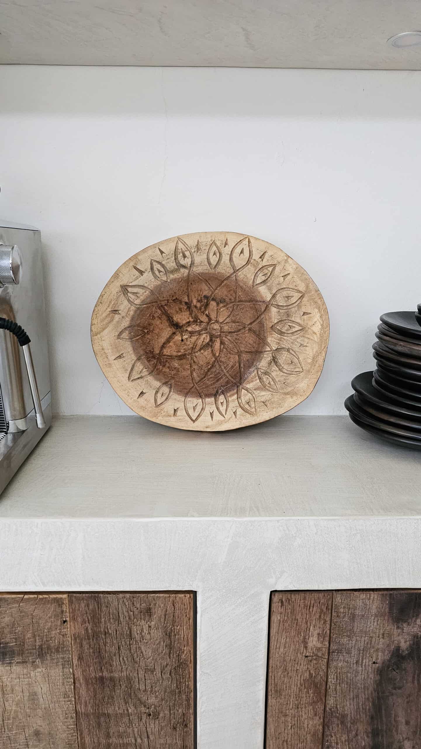 Een mooi bohemian houten blad met geweldige motieven erin gecarved. Natuurlijk al supermooi om gewoon neer te zetten. Ook is het leuk om de plank rechtop neer te zetten tegen de muur, bijv. in de keuken. Of op een plank.