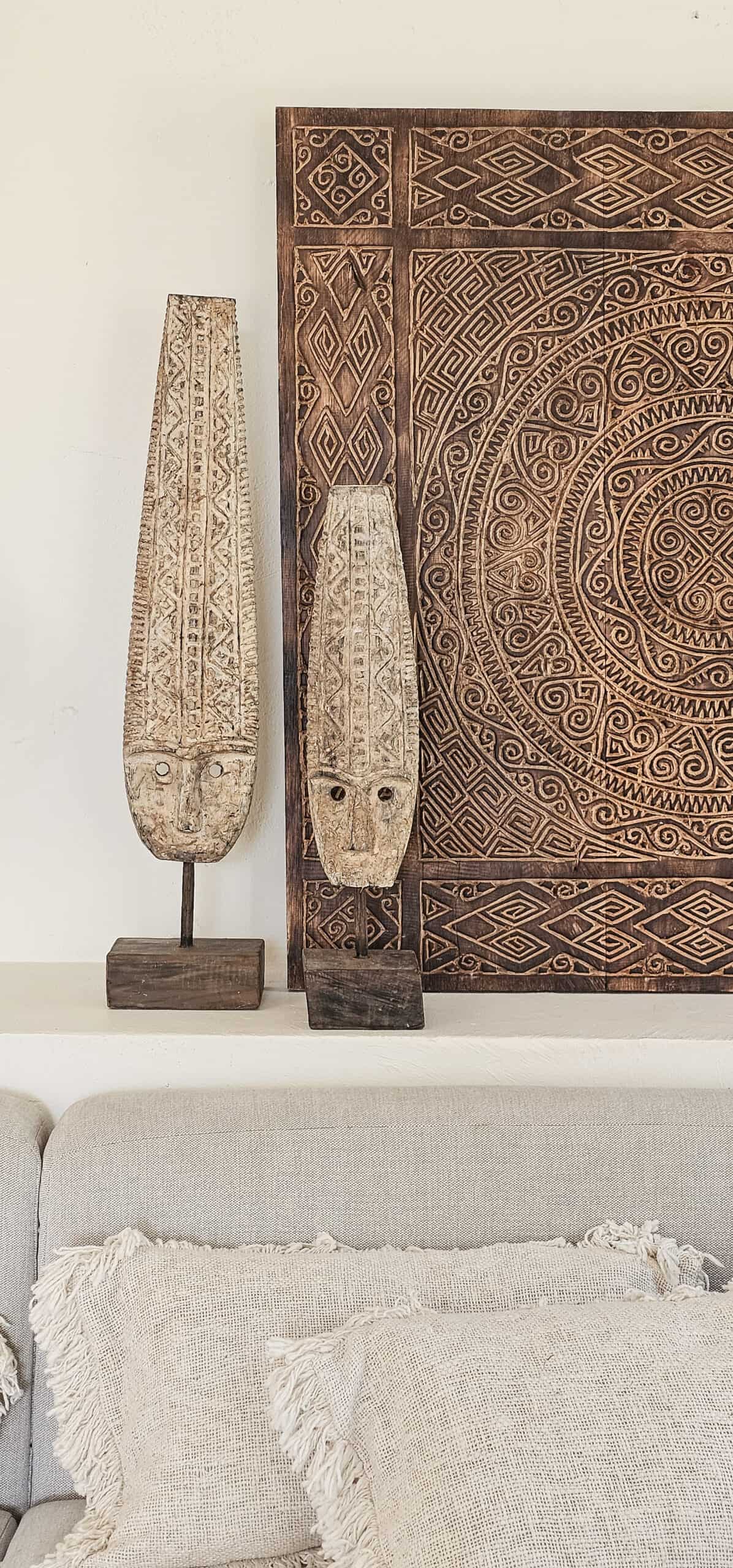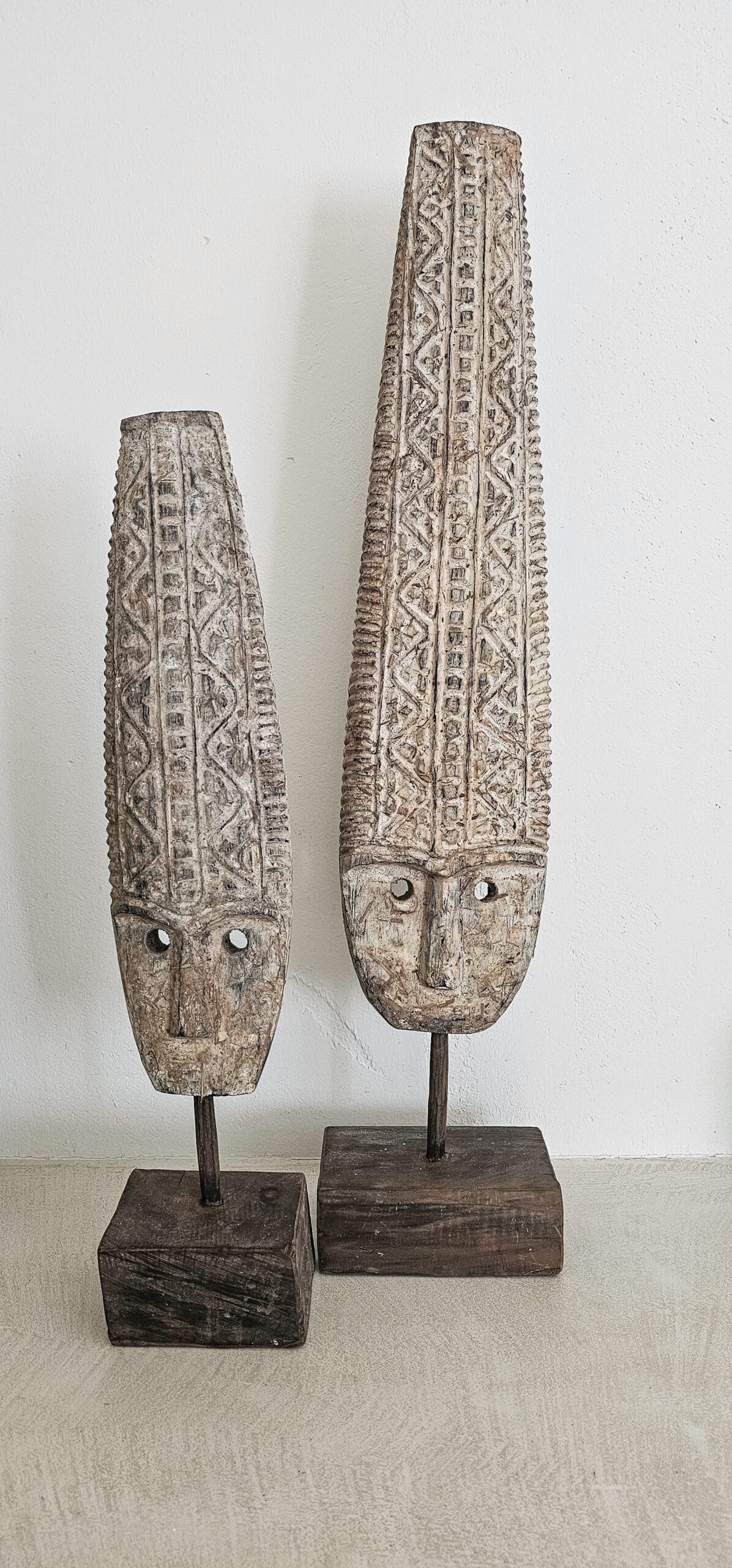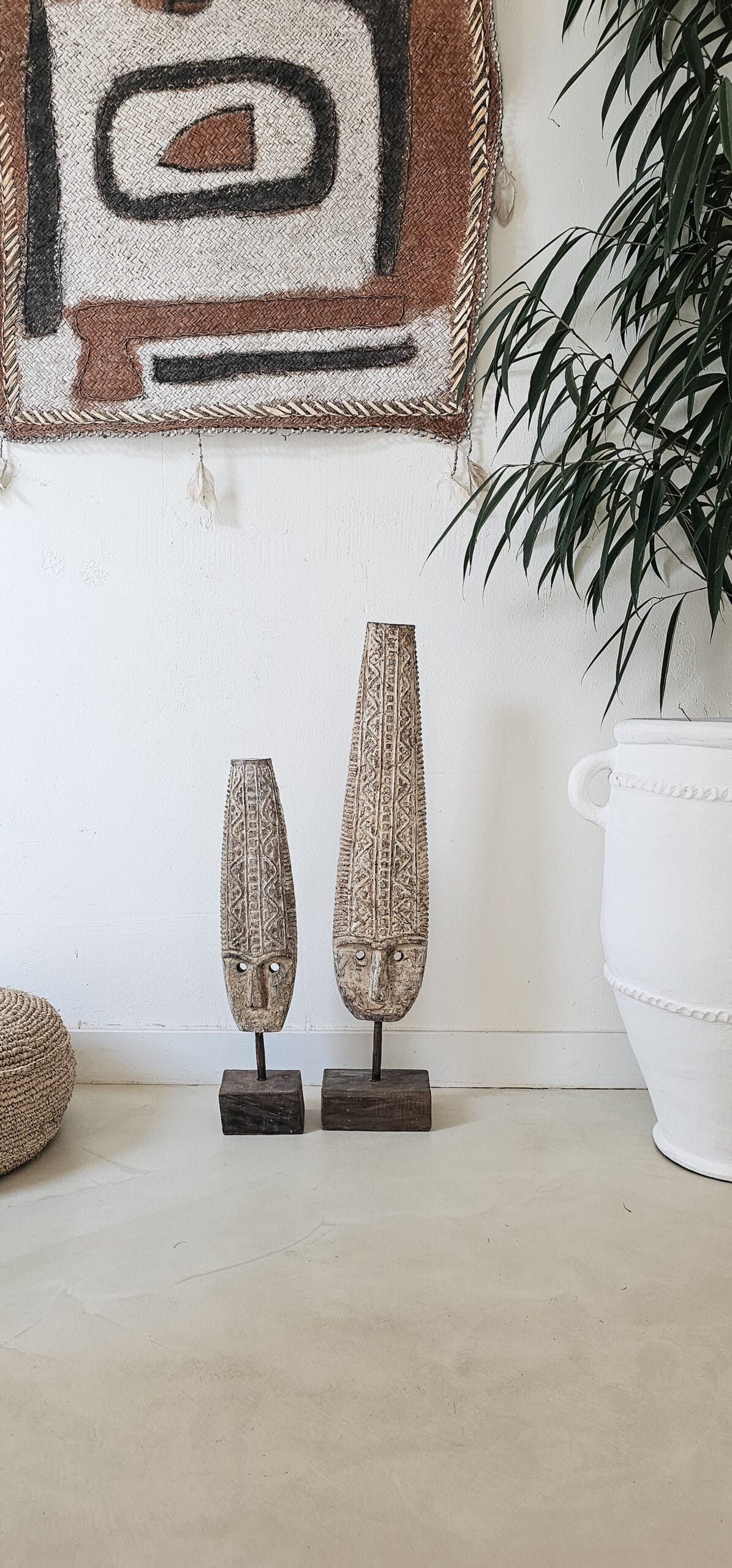 Een elegant en eenvoudig handgemaakt beeldje met verfijnde gecarved hoofdtooi die doet denken aan ceremoniële hoeden van balinese priesters of dansers. Dit ambachtelijke kunstwerk straalt authenticiteit en vakmanschap uit, waarbij traditionele Balinese snijtechnieken worden gecombineerd met een minimalistisch ontwerp. De subtiele details en natuurlijke uitstraling maken het een tijdloos decoratief stuk dat harmonie brengt in elke ruimte