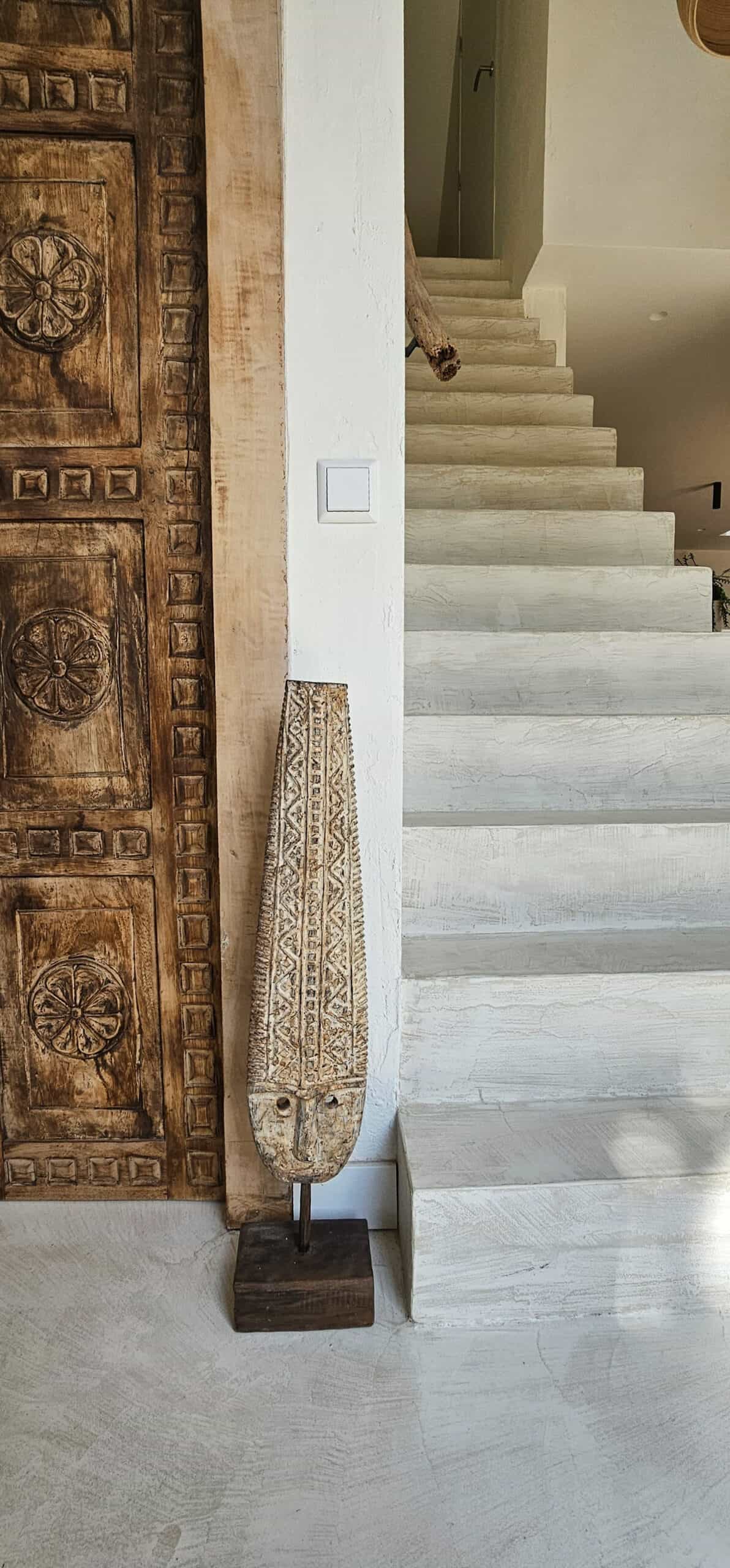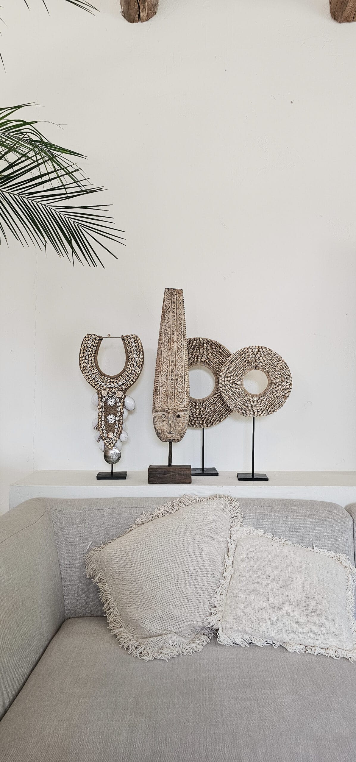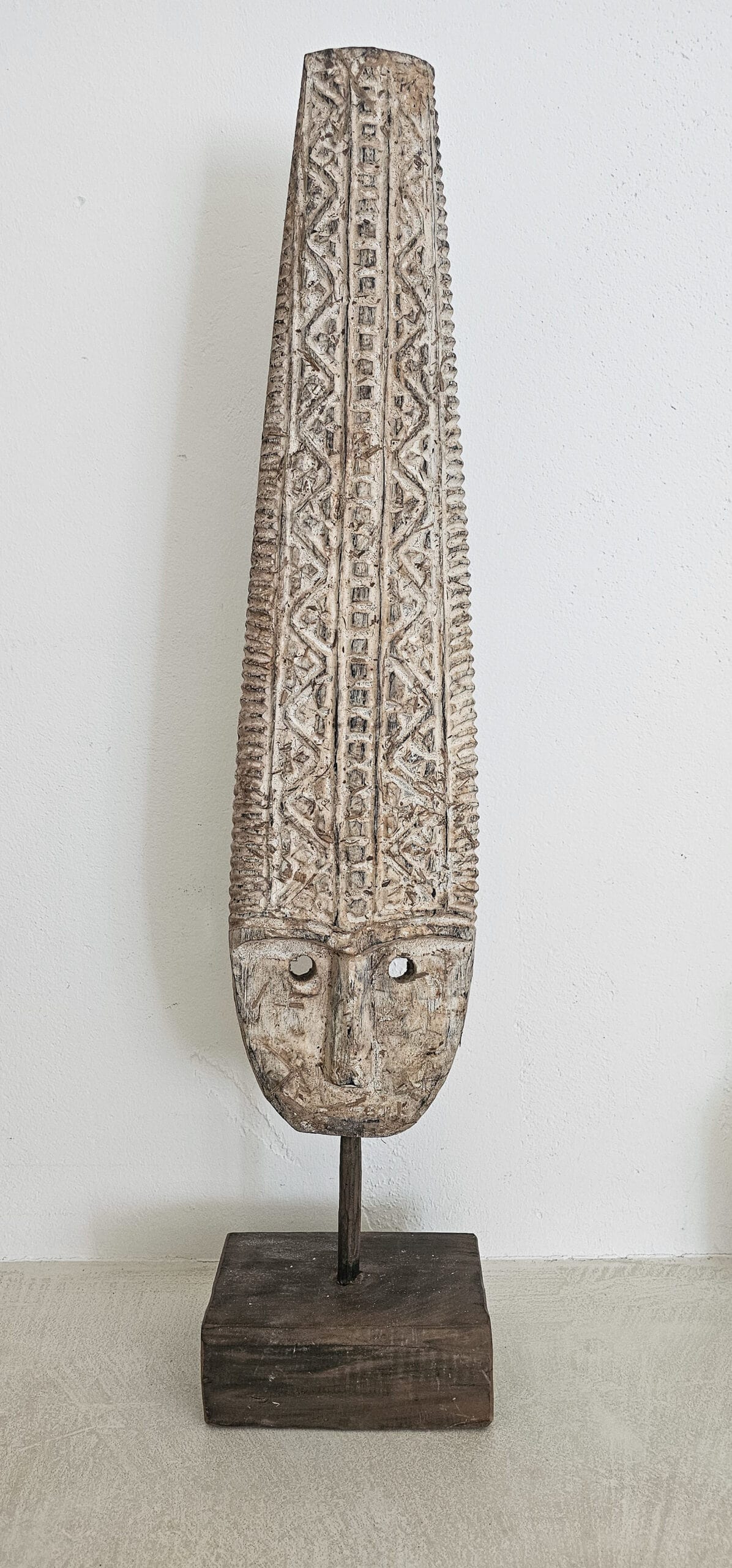 Een elegant en eenvoudig handgemaakt beeldje met verfijnde gecarved hoofdtooi die doet denken aan ceremoniële hoeden van balinese priesters of dansers. Dit ambachtelijke kunstwerk straalt authenticiteit en vakmanschap uit, waarbij traditionele Balinese snijtechnieken worden gecombineerd met een minimalistisch ontwerp. De subtiele details en natuurlijke uitstraling maken het een tijdloos decoratief stuk dat harmonie brengt in elke ruimte