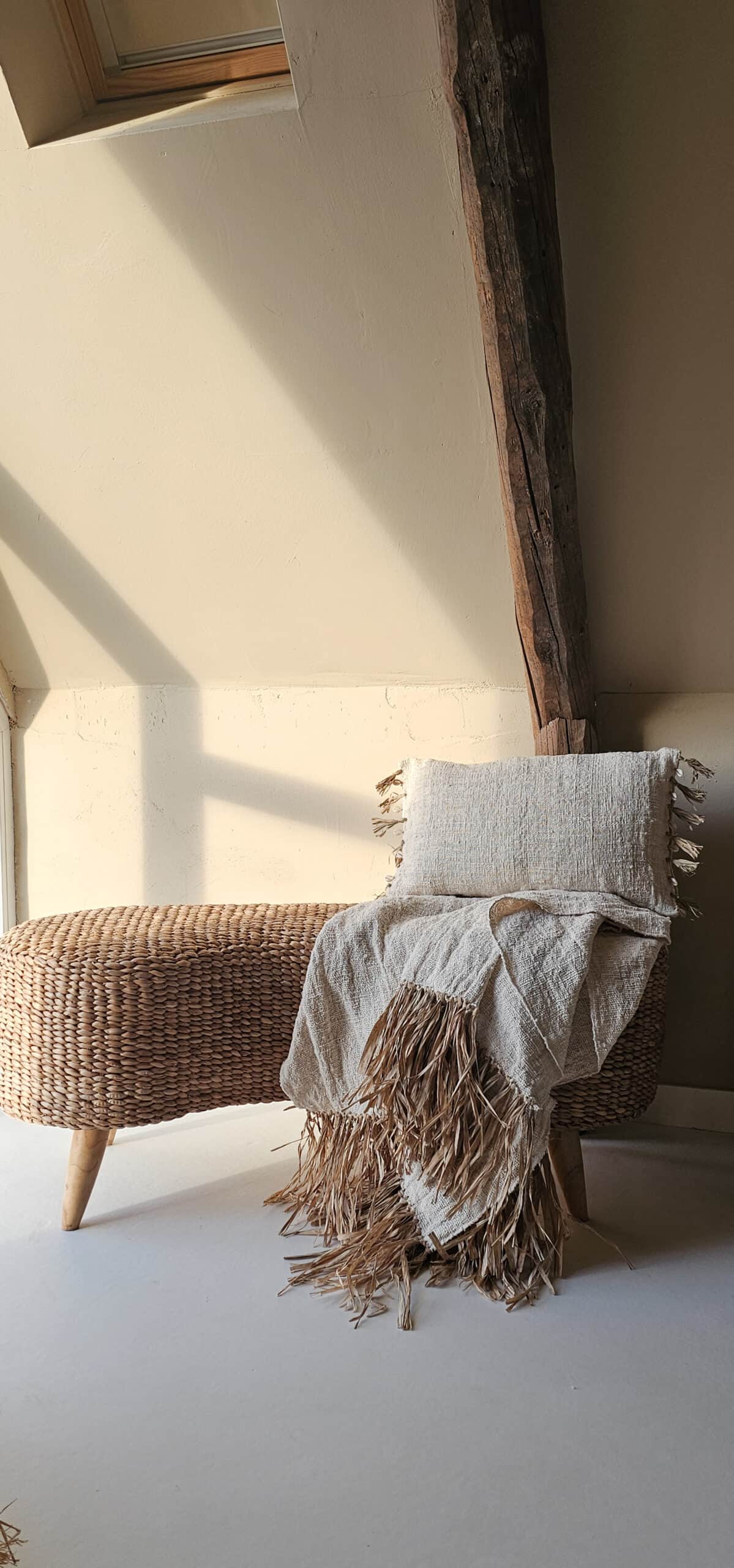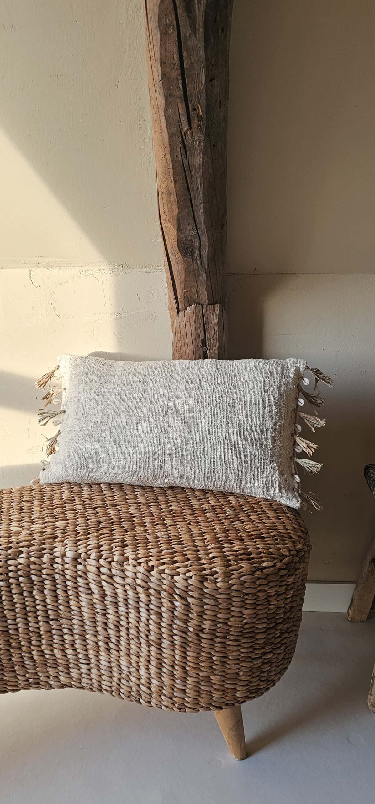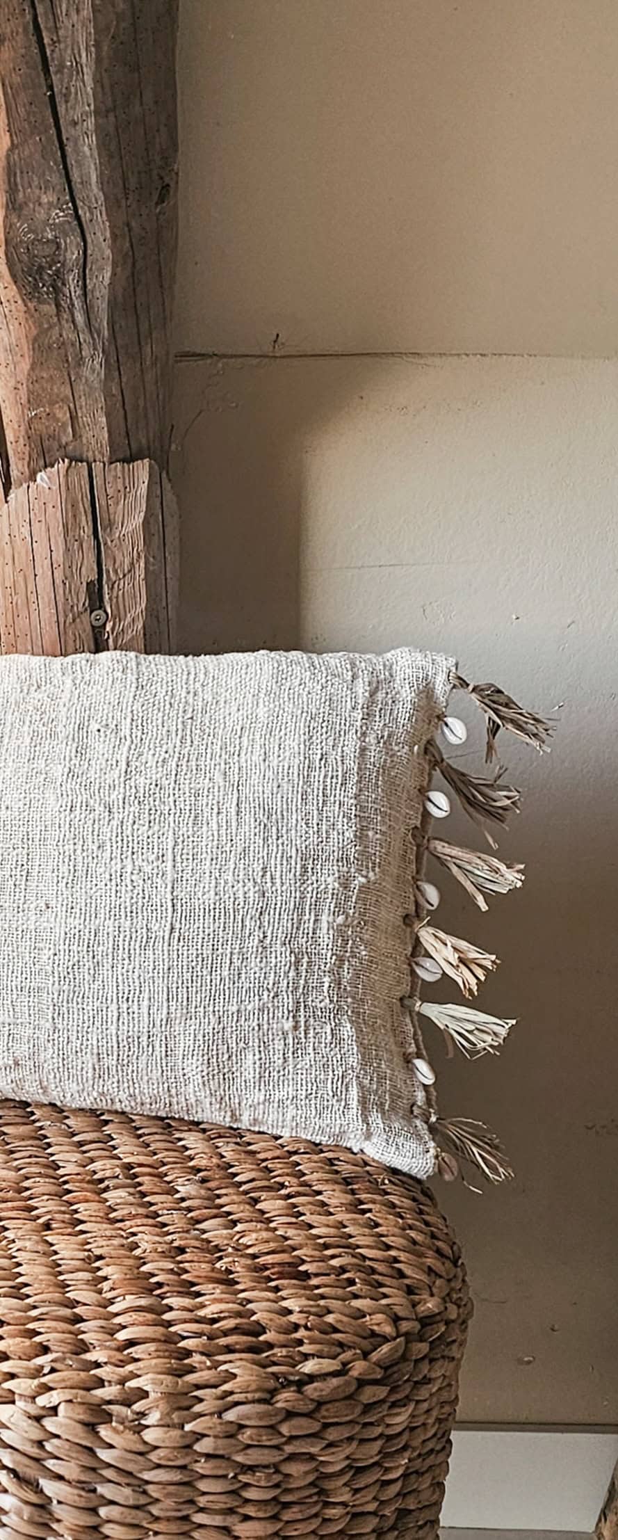 Linnen kussen met raffia kwastjes en kauri 35x60cm