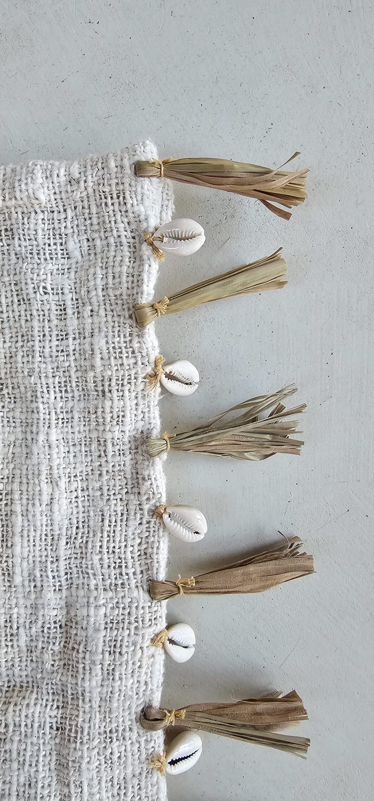Dit prachtige kussen uit Bali is met de hand gemaakt. De natuurlijke kleur, zachte linnen textuur en speelse raffia kwastjes met kauri schelpjes geven direct warmte en rust aan je interieur.