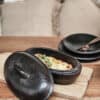 Gemaakt van klei, wat gevormd wordt en gebrand wordt zodat de zwarte kleur ontstaat. Hierdoor is de zwarte kleur niet altijd egaal en is er hier en daar een gevlamd effect te zien. Dit maakt ze robuust en authentiek!