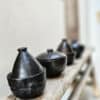 Gemaakt van klei, wat gevormd wordt en gebrand wordt zodat de zwarte kleur ontstaat. Hierdoor is de zwarte kleur niet altijd egaal en is er hier en daar een gevlamd effect te zien. Dit maakt ze robuust en authentiek!