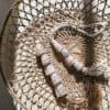 Deze wat langere schelpenketting is leuk om aan de (kast)deur te hangen als decoratie. Mooie grote schelpen met een raffia kwast.