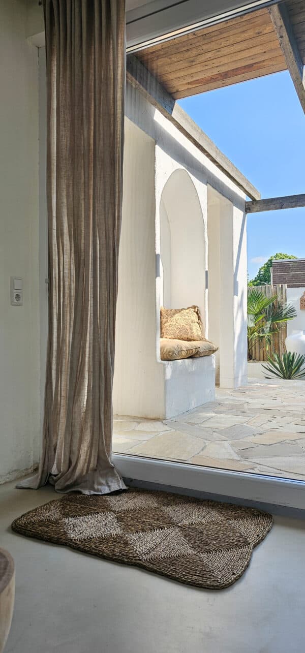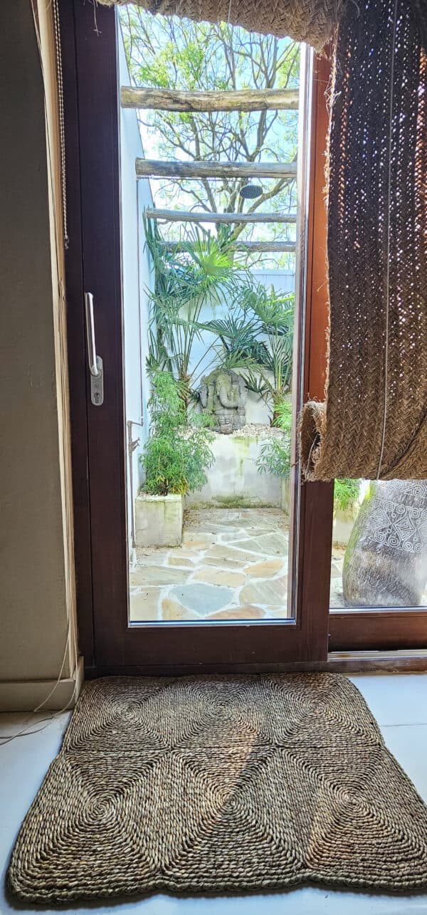 Een handgemaakte deurmat van mendonggras, zorgvuldig vervaardigd in Java met traditionele technieken. Dit stevige en duurzame materiaal zorgt voor een natuurlijke uitstraling en effectieve bescherming tegen vuil. De fijn geweven structuur voegt een authentiek en rustiek karakter toe aan je entree, terwijl de mat functioneel en stijlvol blijft.