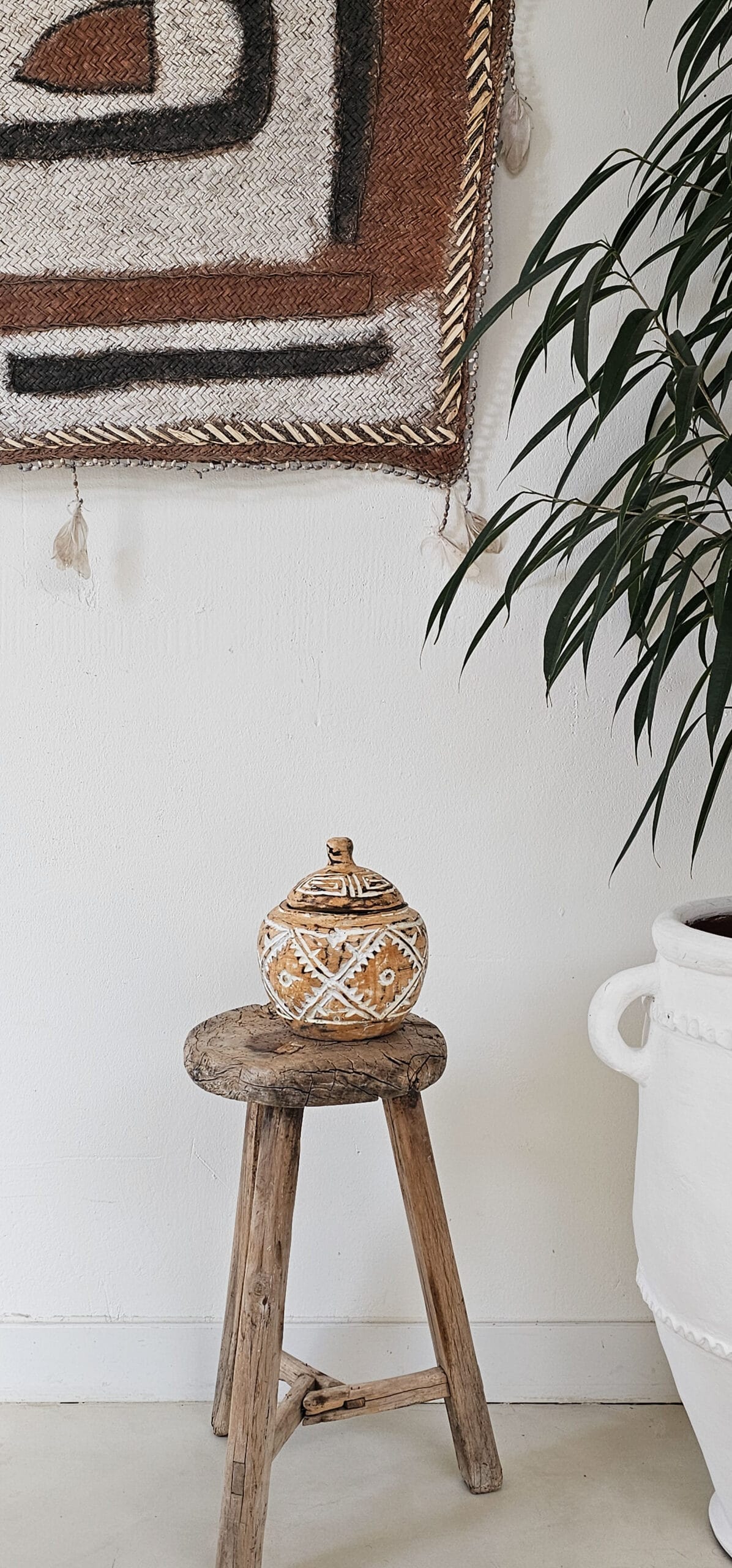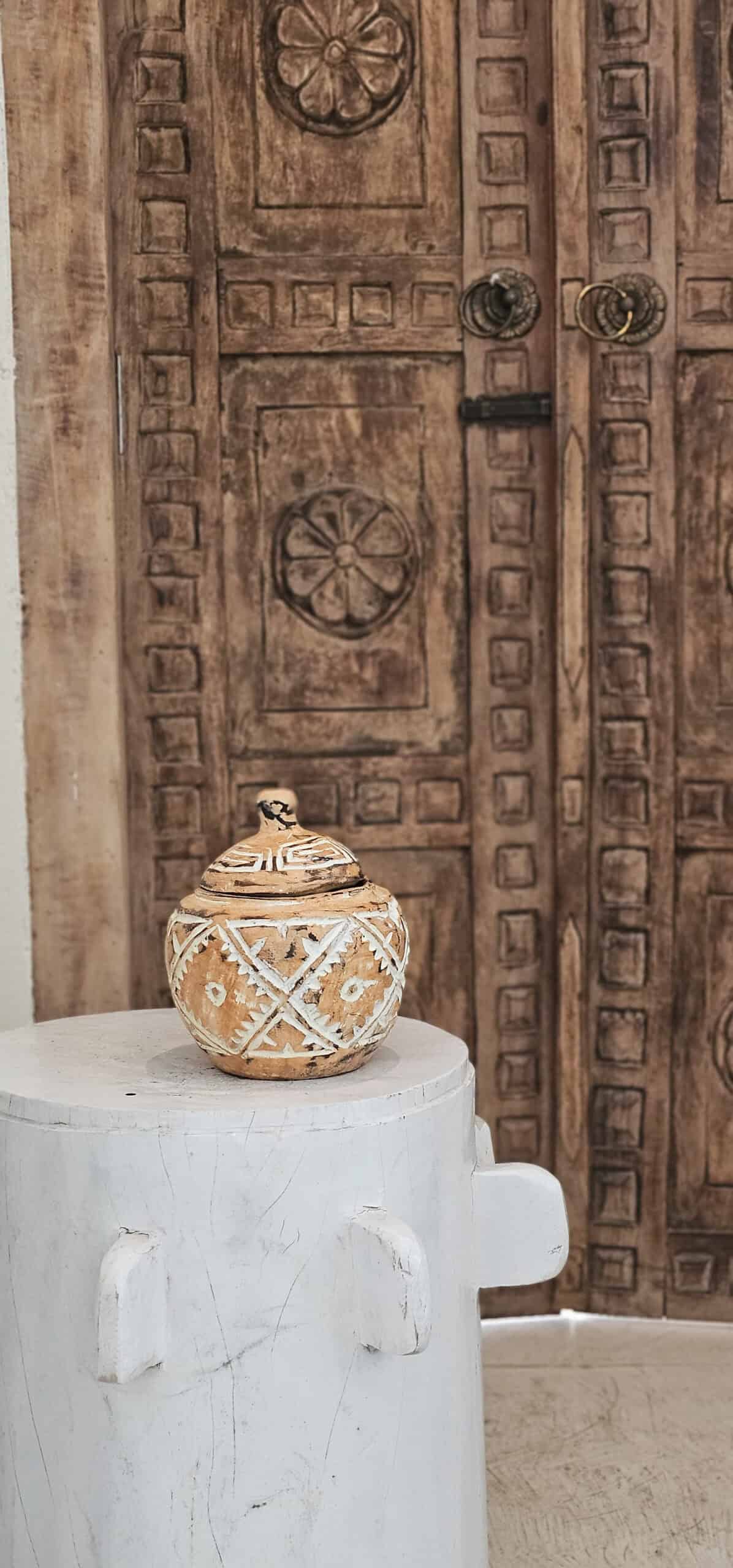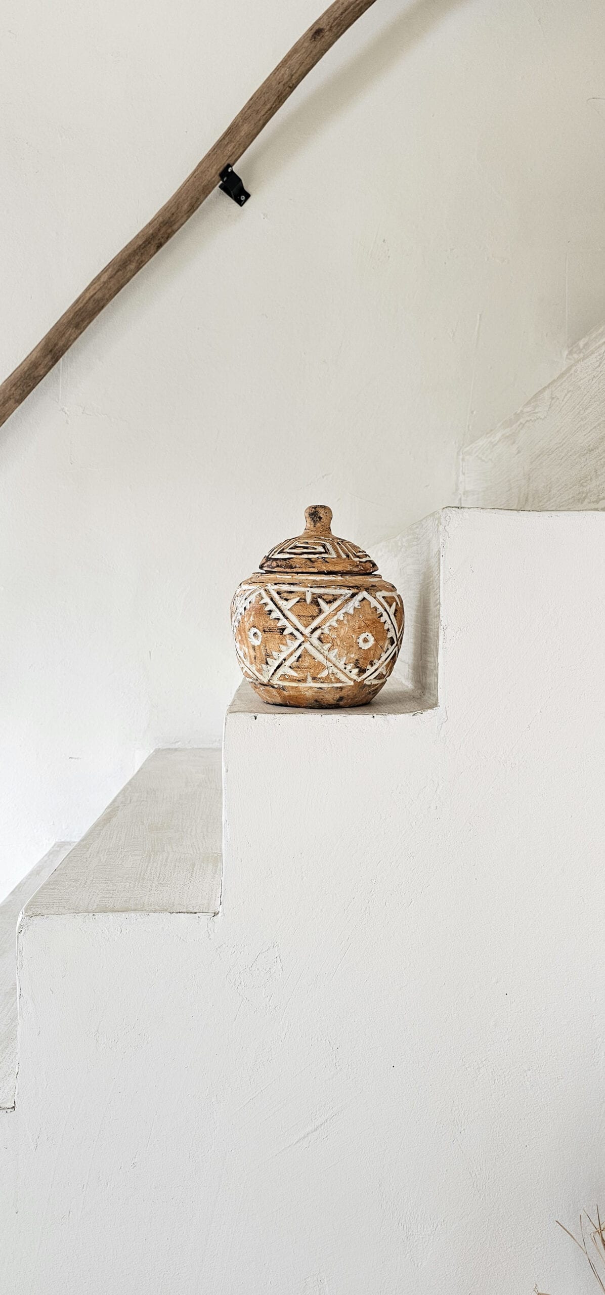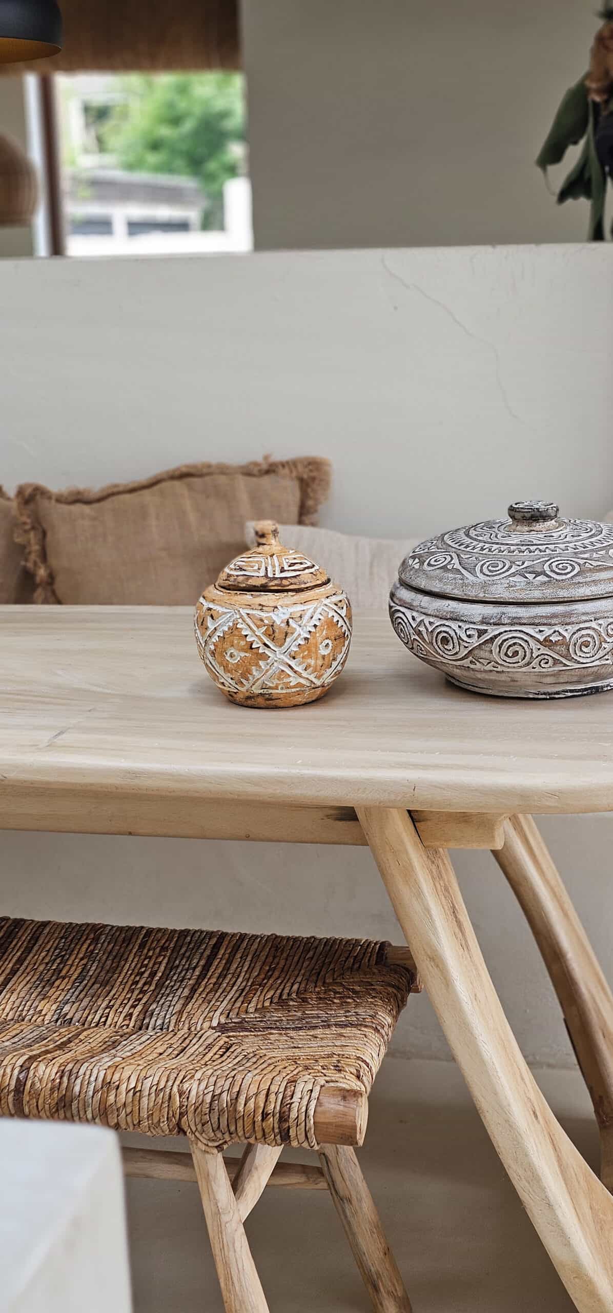 Dit prachtig handgesneden potje met deksel, gemaakt van duurzaam palmhout, straalt vakmanschap en authenticiteit uit. Geïnspireerd door Balinese tradities, heeft dit potje verfijnde gravures die een exotische en warme uitstraling geven.