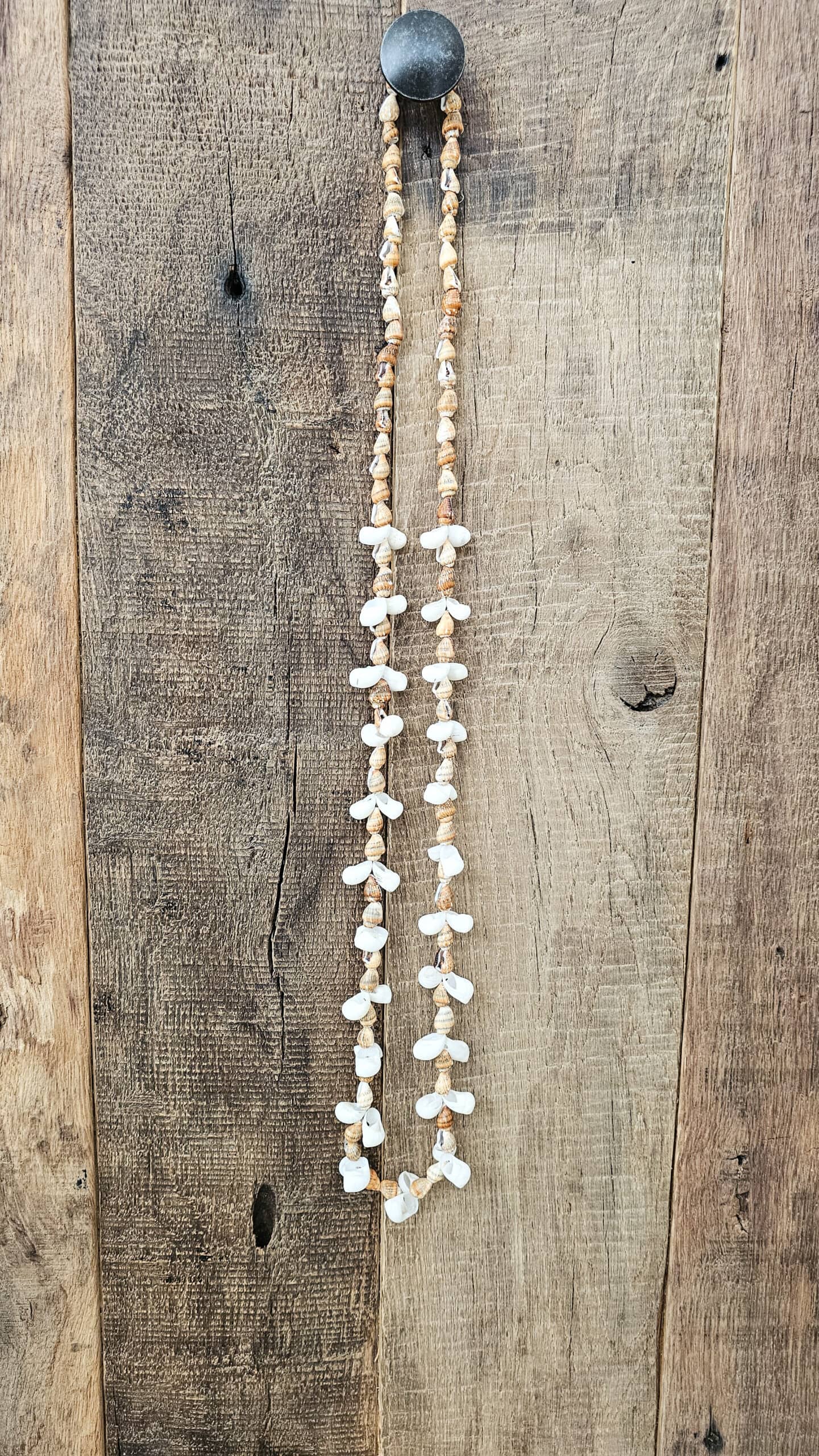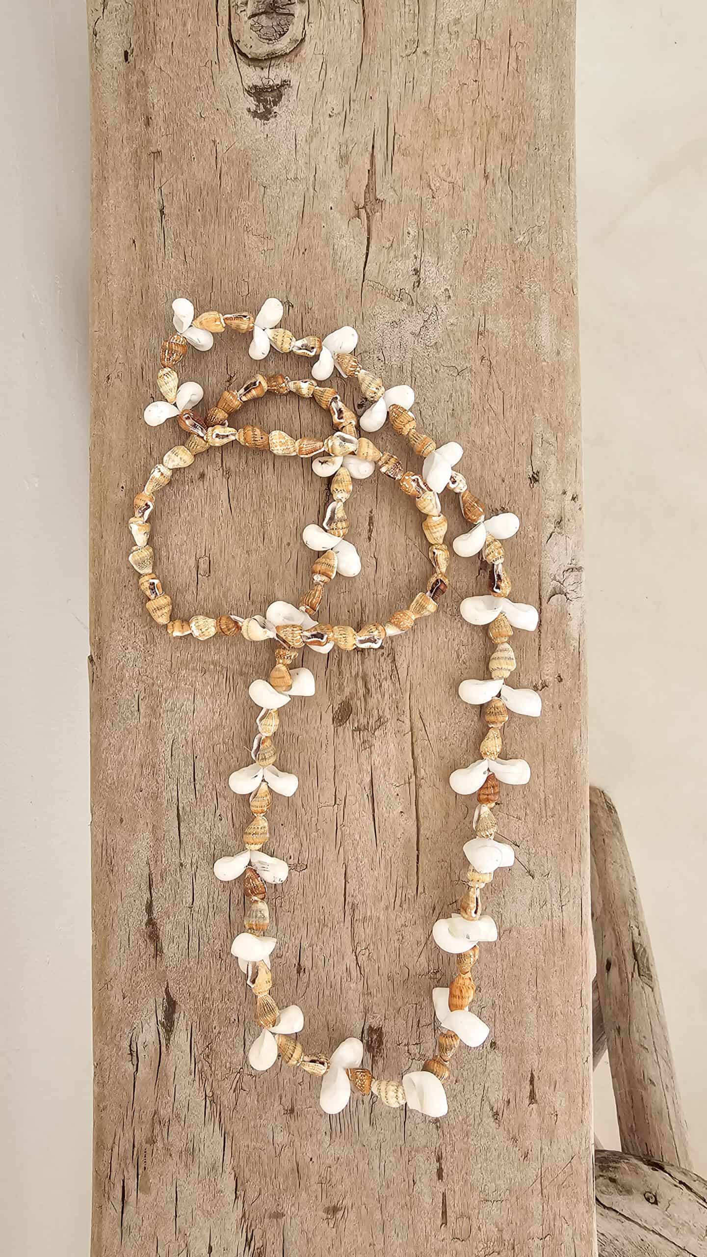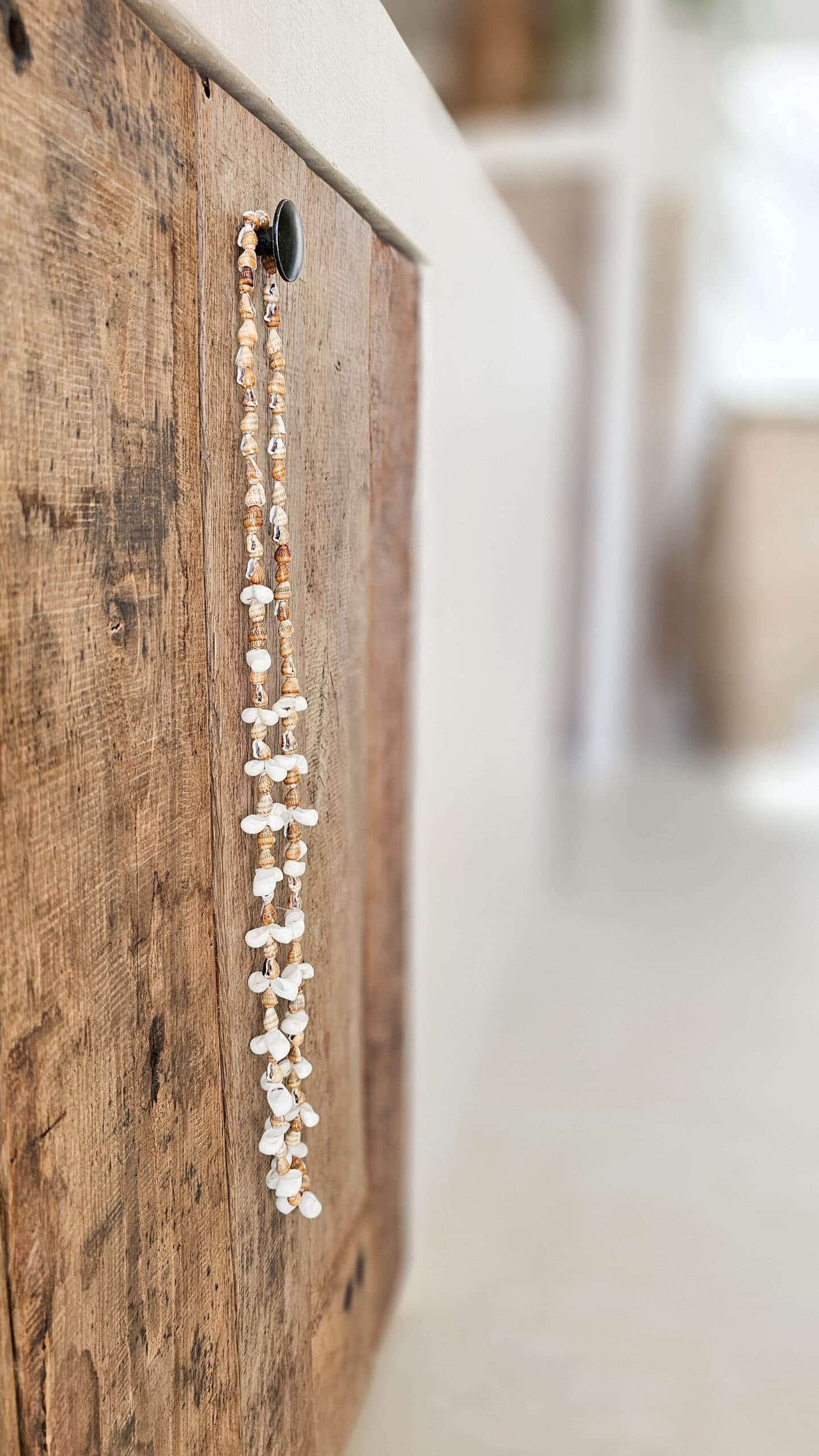 Een verfijnde smalle woonketting gemaakt van kleine schelpjes, perfect om een natuurlijke en decoratieve touch aan je interieur te geven. De subtiele vorm en organische materialen zorgen voor een lichte en ontspannen sfeer, ideaal voor een bohemian, kust- of landelijke stijl. Hang de ketting aan een kastdeur, leg hem decoratief op een tafel of combineer hem met andere natuurlijke accessoires voor een harmonieus geheel.