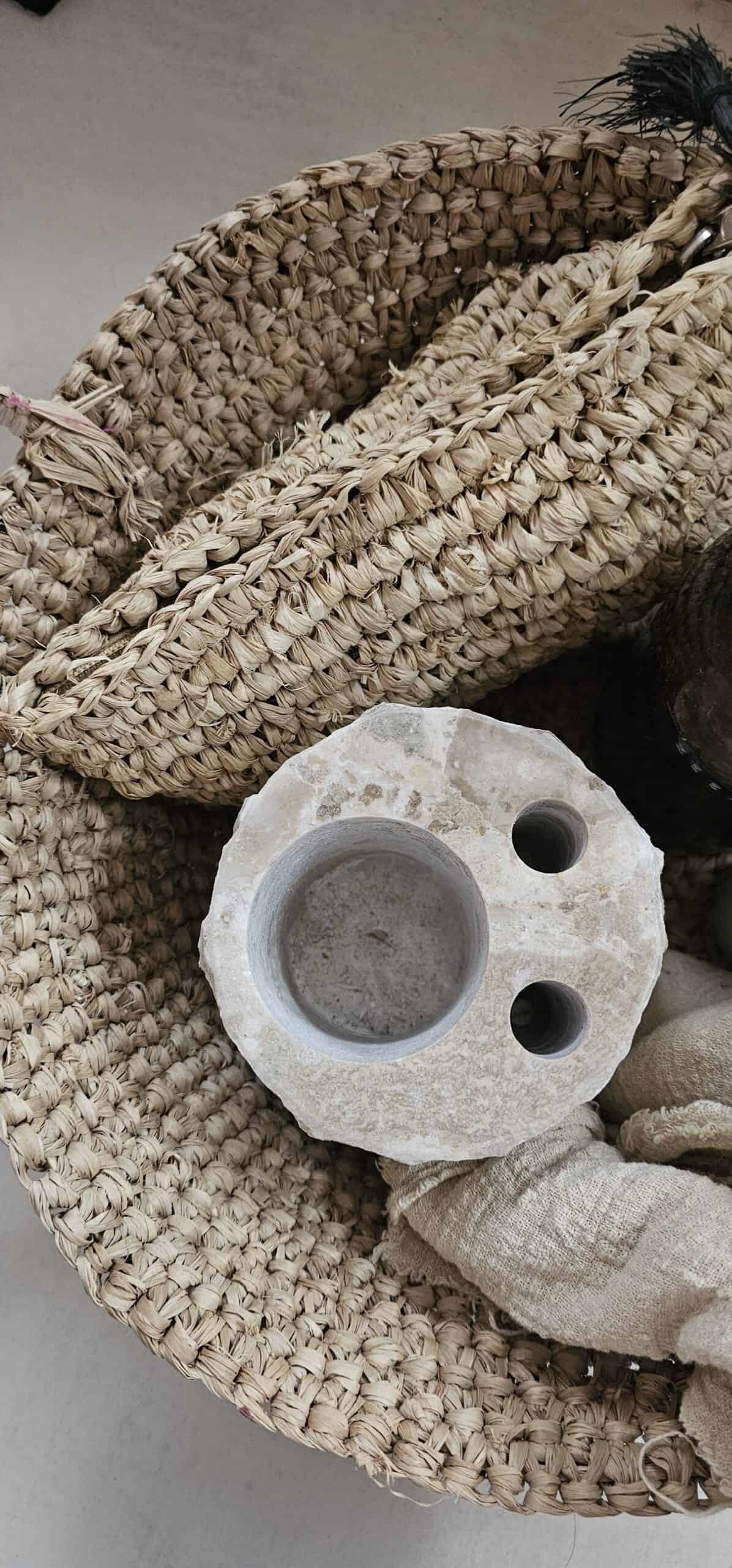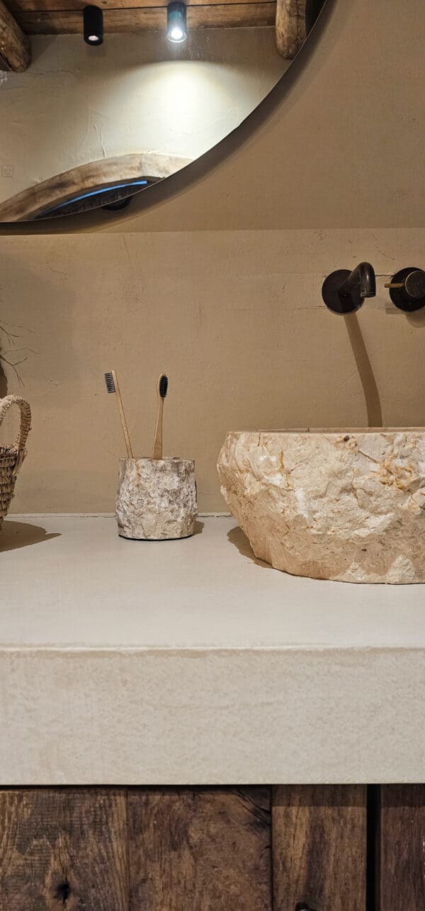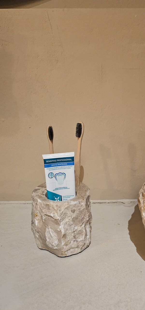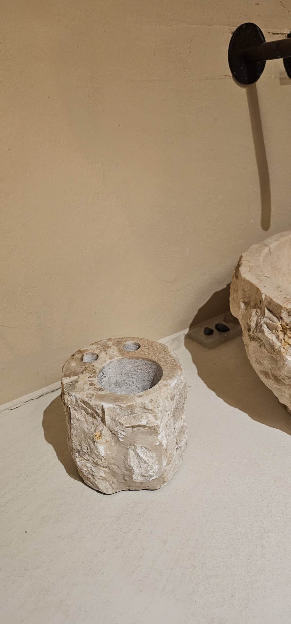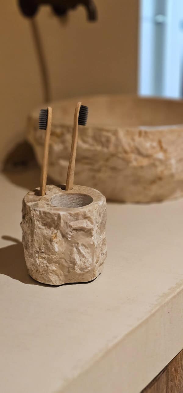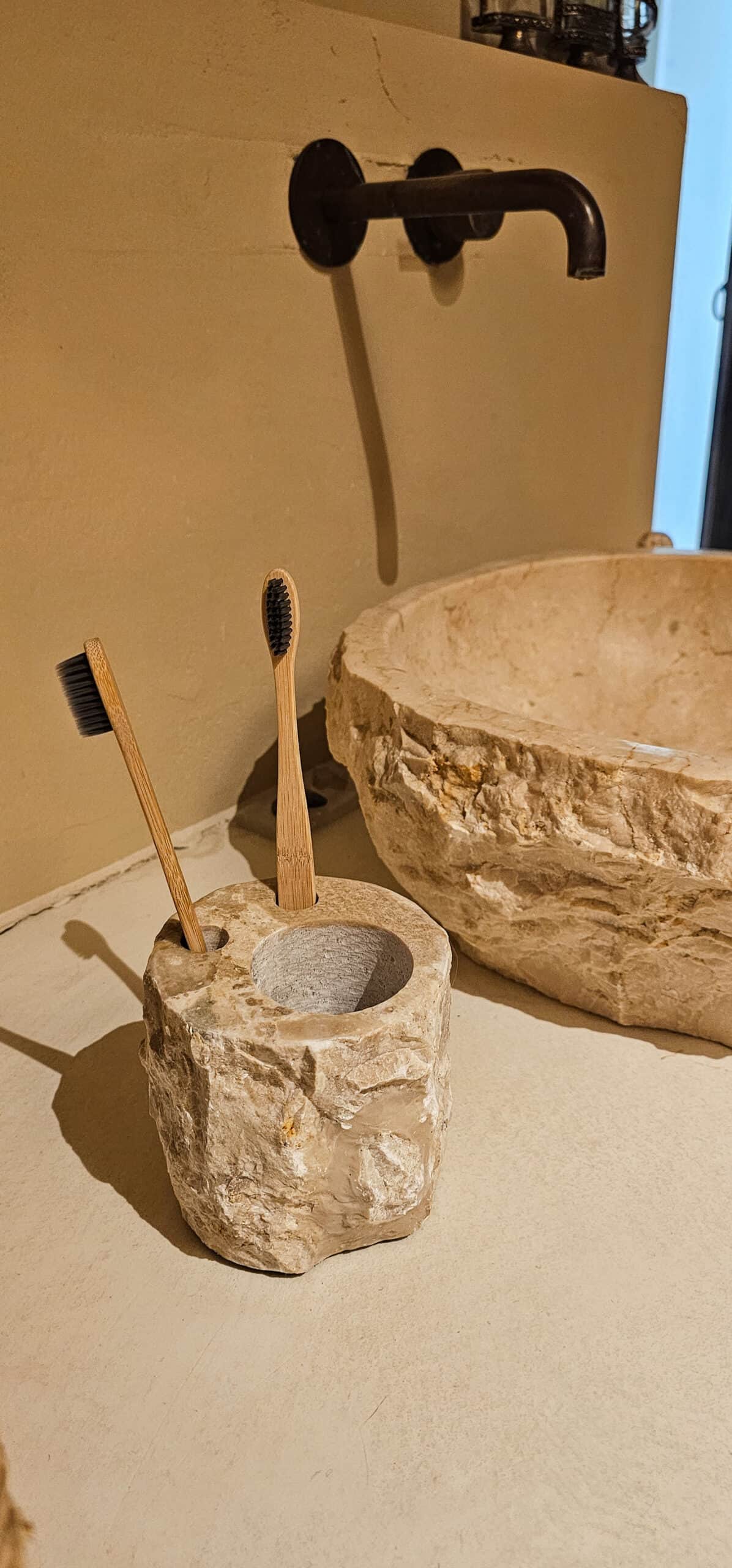 Voeg een vleugje natuurlijke elegantie toe aan je badkamer met deze robuuste tandenborstelhouder van grof marmer.