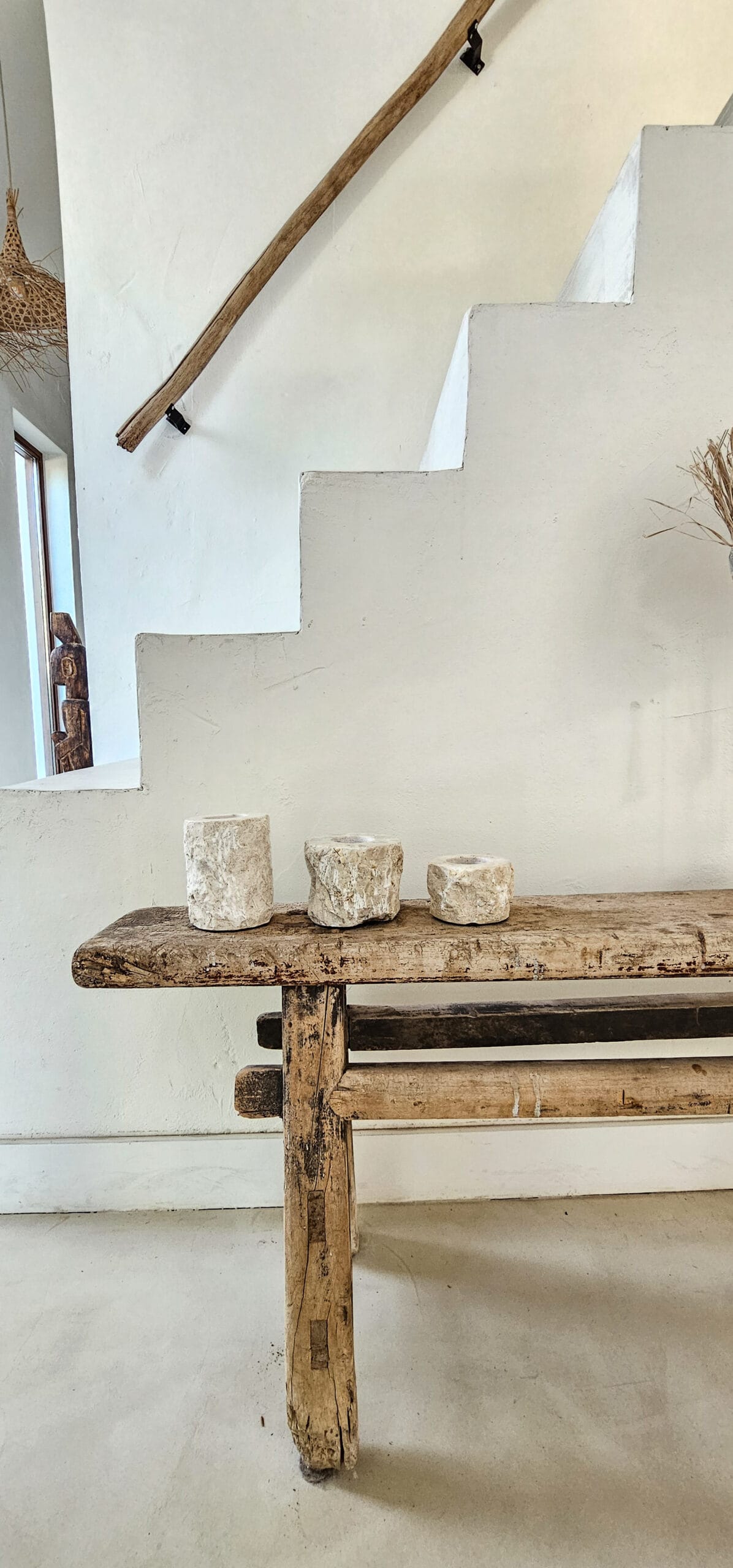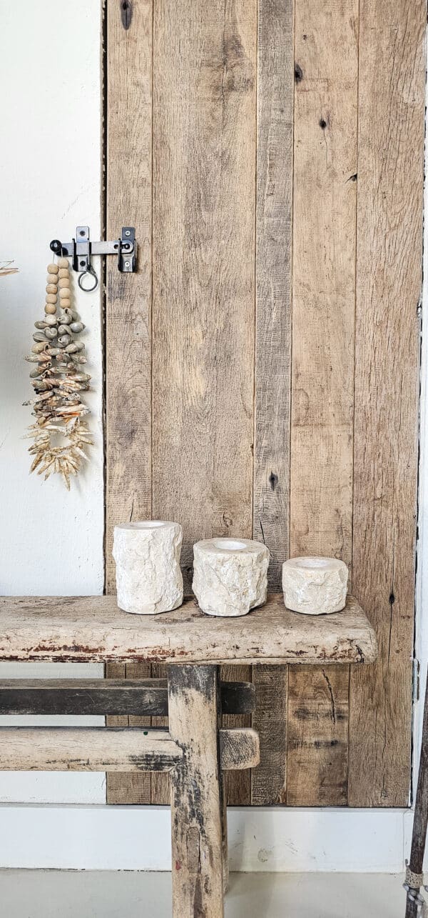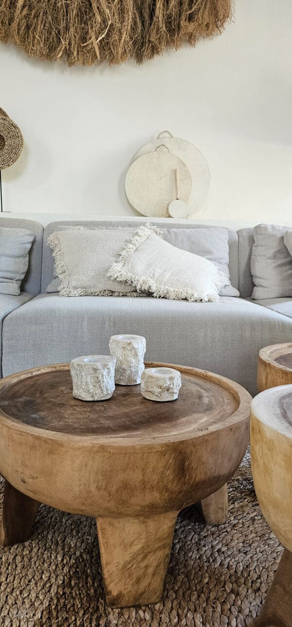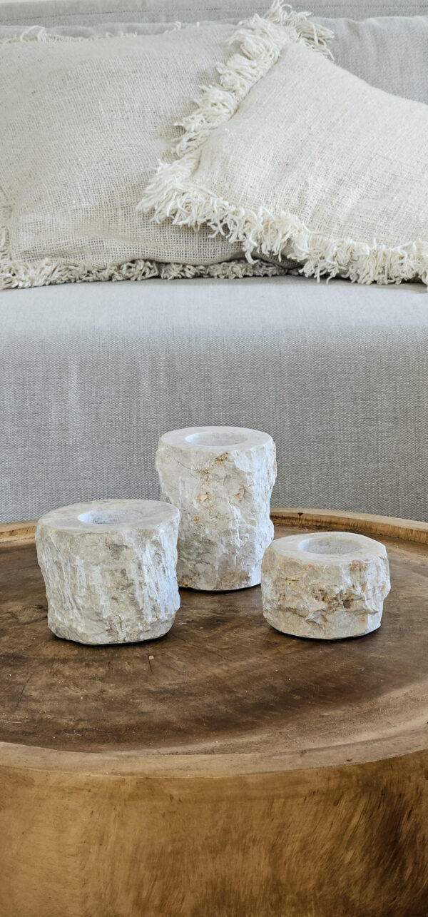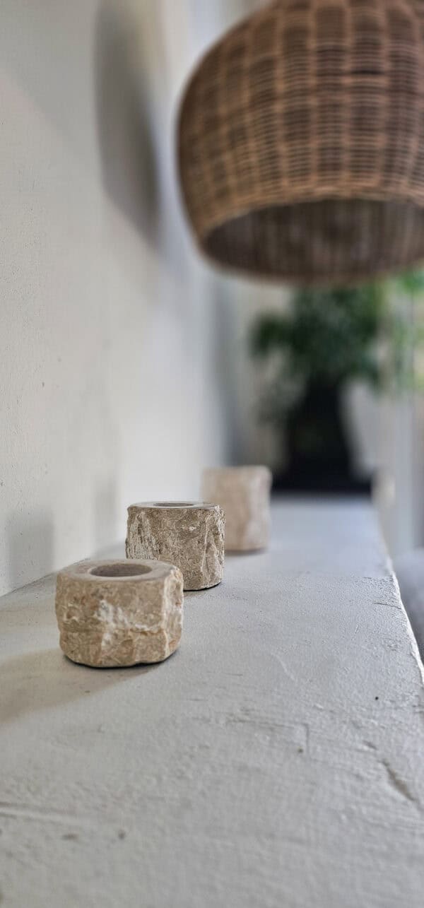 Een robuuste set van drie waxinelichthouders, vervaardigd uit grof marmer en uitgevoerd in drie verschillende hoogtes. Dankzij de ruwe textuur van het marmer heeft elke houder een unieke uitstraling. De variatie in hoogte zorgt voor een dynamisch en speels effect, ideaal als sfeervolle decoratie op een tafel, kast of bij een gezellige zithoek. Perfect voor het creëren van een warme en uitnodigende ambiance, in ieder interieur.