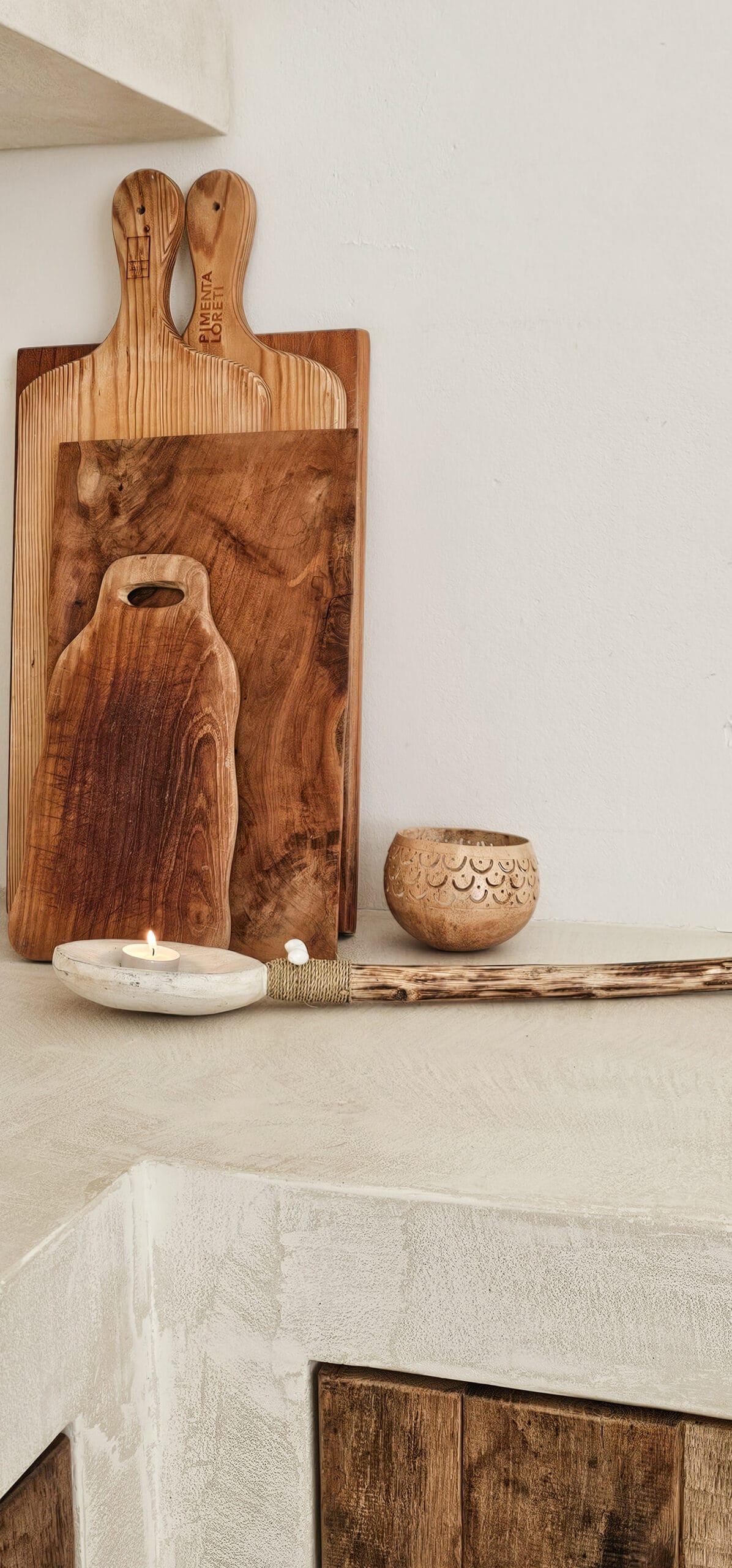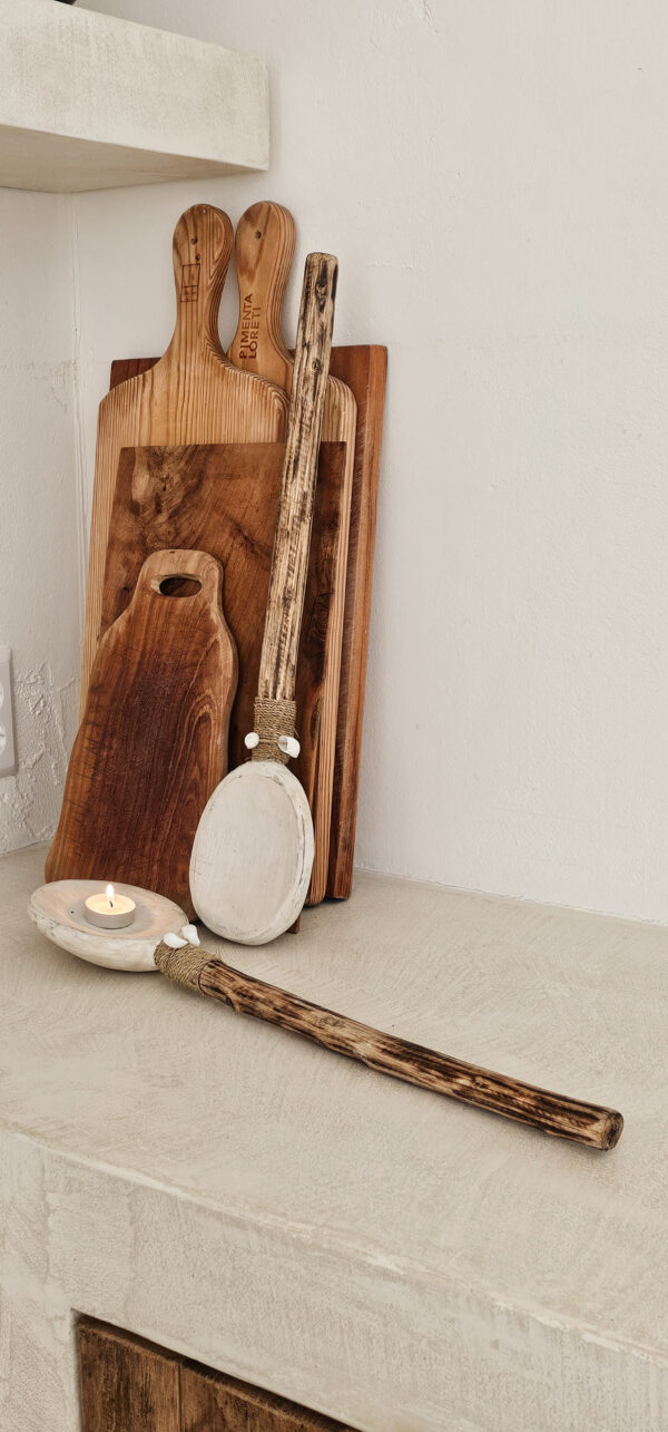 Een grote houten lepel als unieke en sfeervolle decoratie.