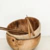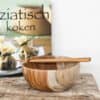 Een mooie diepe kom van teakhout waar de eetstokjes in gestoken kunnen worden. Ik vind ze zo mooi dat ik ze ter decoratie in mijn keuken gezet heb, natuurlijk klaar voor gebruik.