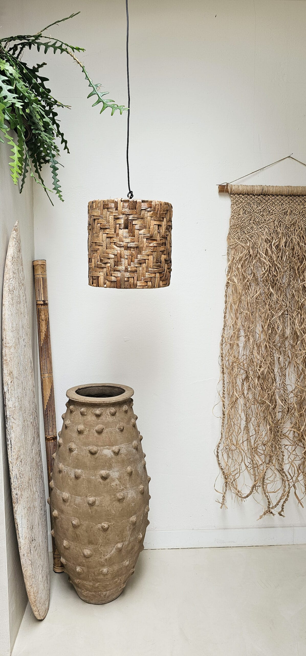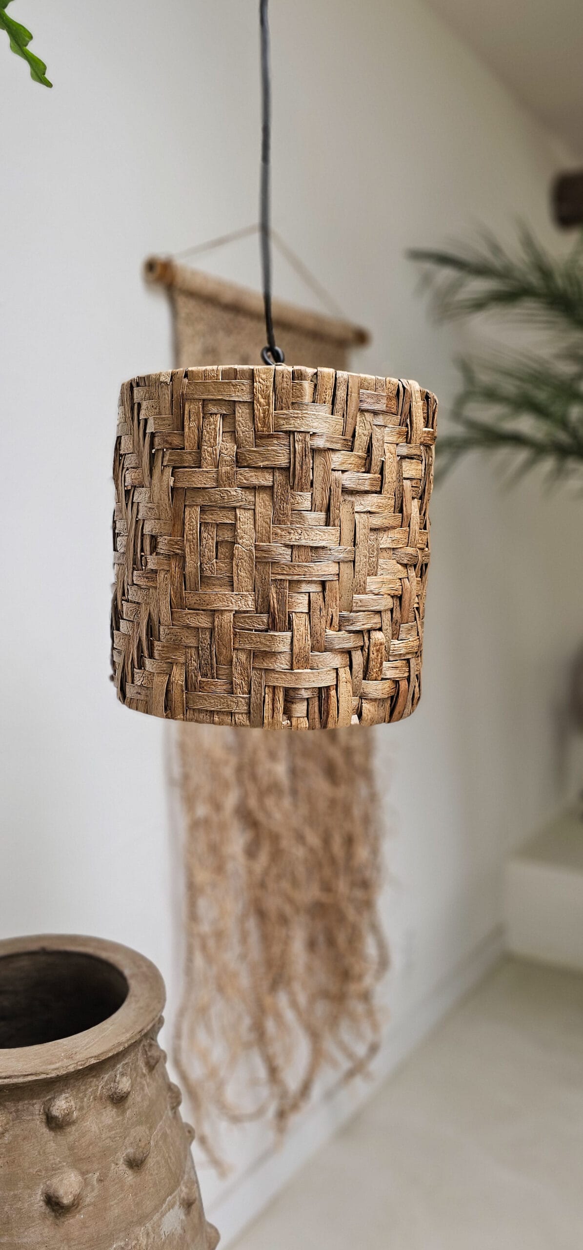 Een prachtige hanglamp uit Java, gemaakt van waterhyacint en vormgegeven als een klassieke lampenkap. Het natuurlijke materiaal geeft de lamp een warme en organische uitstraling, perfect voor een sfeervol en stijlvol interieur. De geweven structuur brengt een rustieke charme in elke ruimte, van woonkamers tot eetkamers. Dankzij het duurzame en lichte materiaal is de lamp eenvoudig op te hangen en een unieke toevoeging aan diverse interieurstijlen.