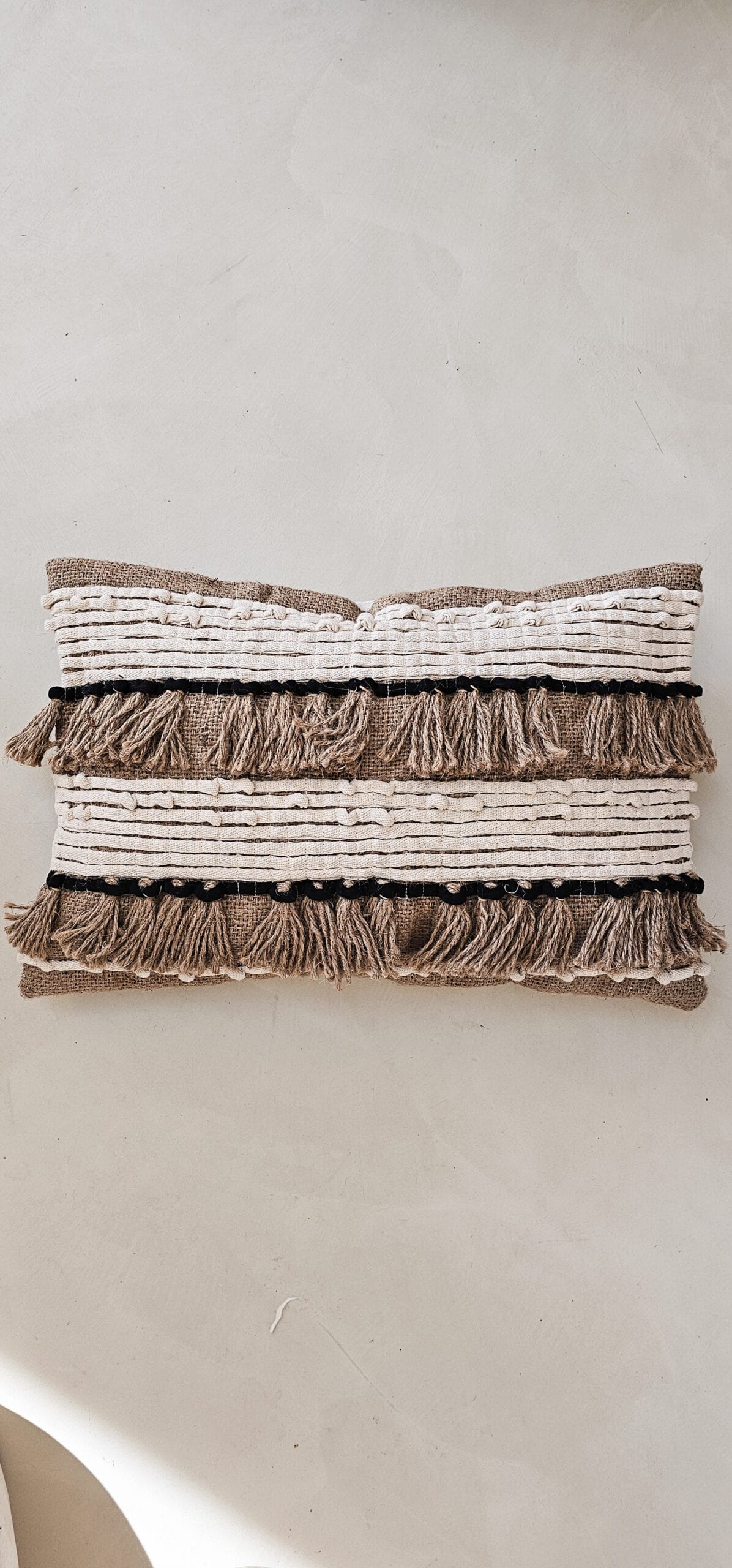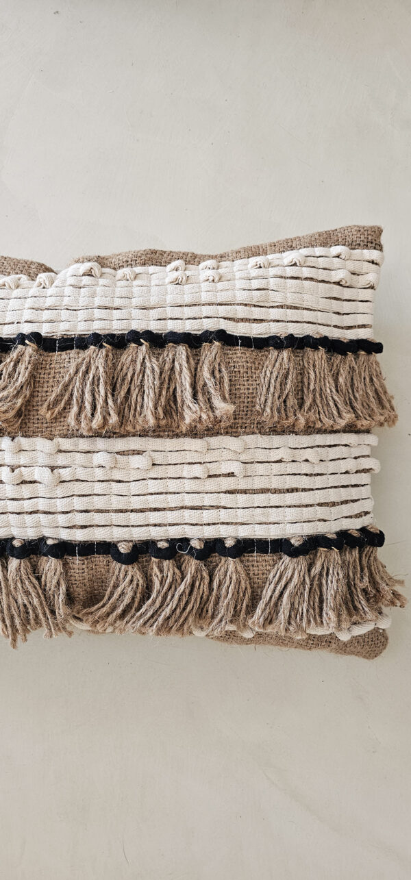 Breng warmte en karakter in je interieur met dit rechthoekige kussen. De combinatie van aardetinten en contrasterende horizontale strepen in gebroken wit en zwart geeft een rustieke uitstraling.