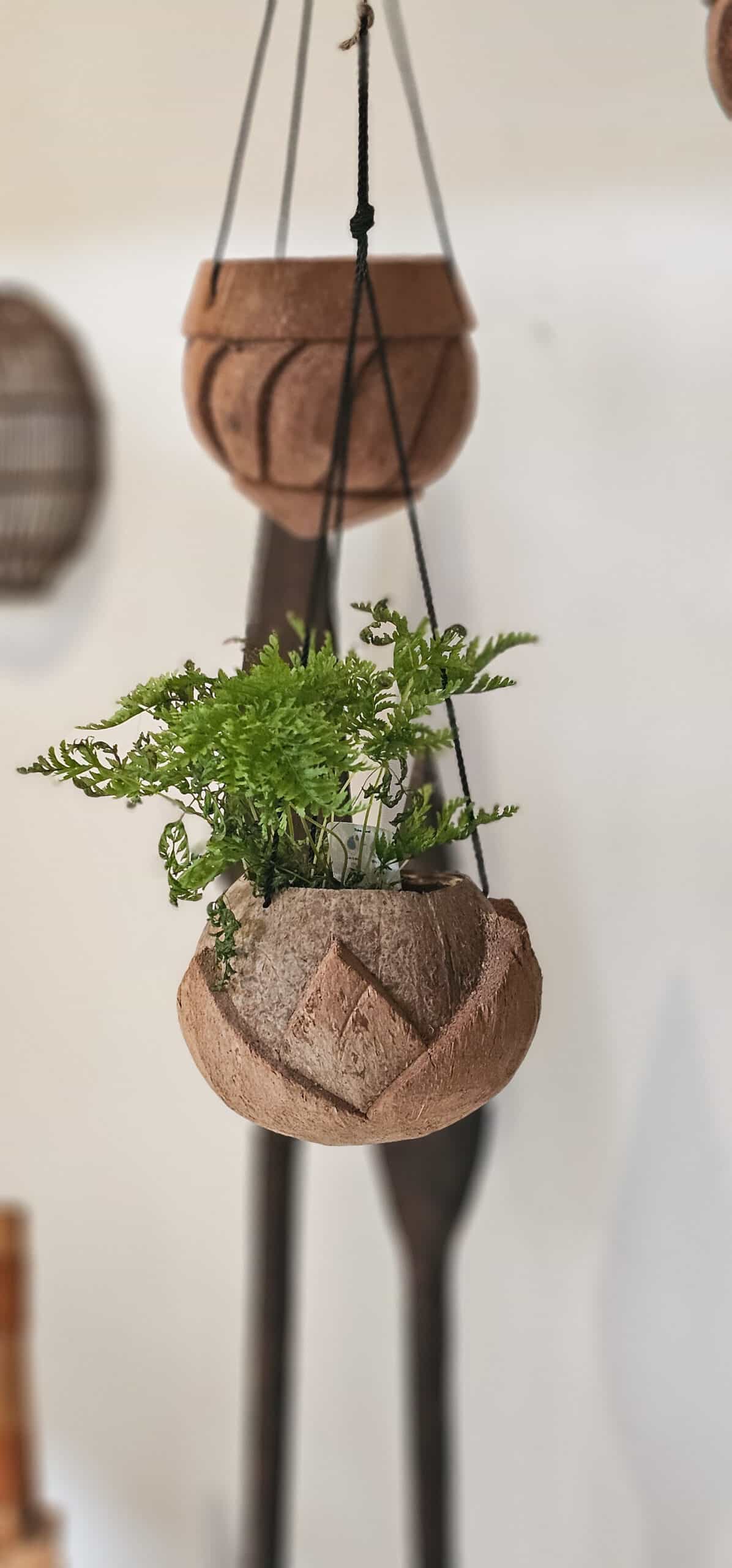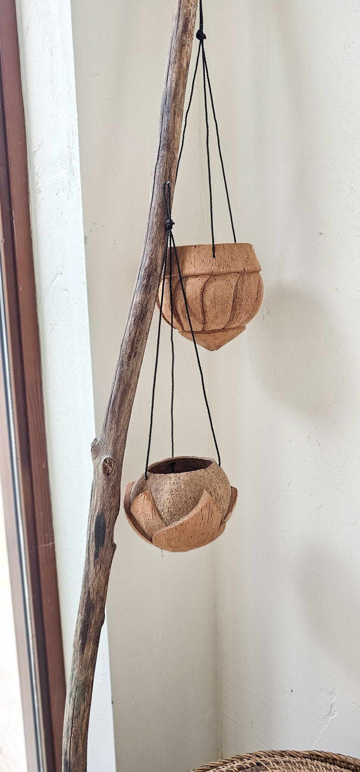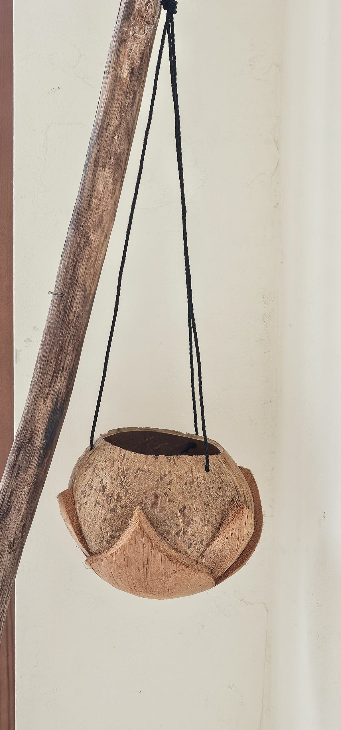 Een uniek hangpotje gemaakt van een grove kokosnoot, dat een natuurlijke en speelse uitstraling aan je interieur of tuin geeft. Dankzij de robuuste textuur van de kokosnoot en de verfijnde afwerking die op een lotus lijkt, combineert dit potje een stoere en organische look met een stijlvolle uitstraling. Ideaal voor het ophangen van kleine planten, kruiden of decoratieve elementen, en perfect voor een bohemian, tropische of rustieke setting.