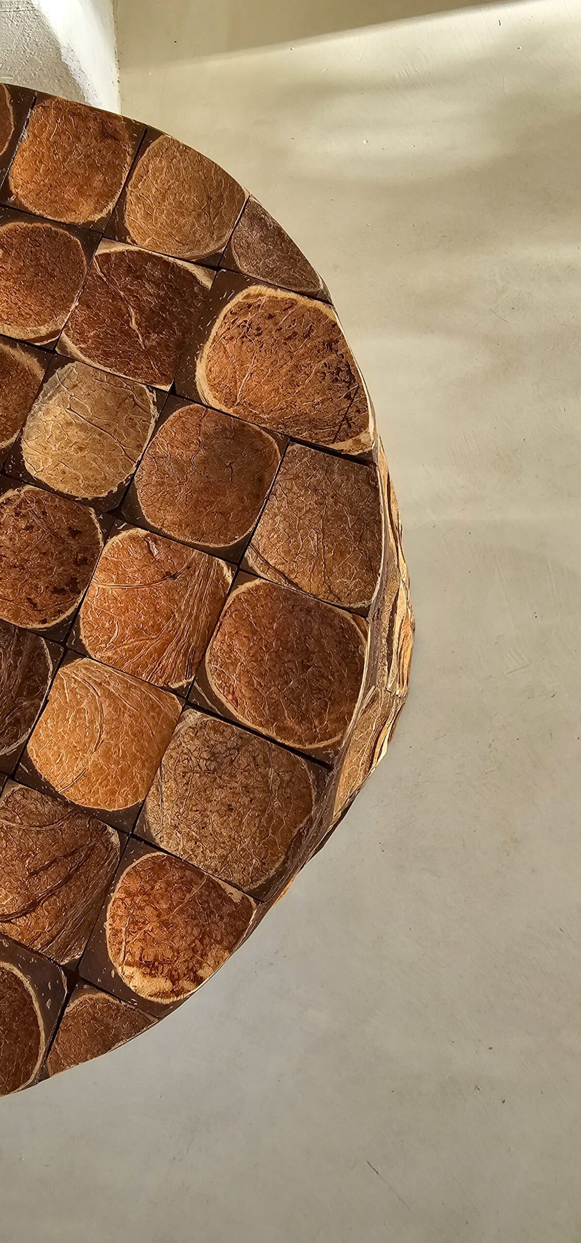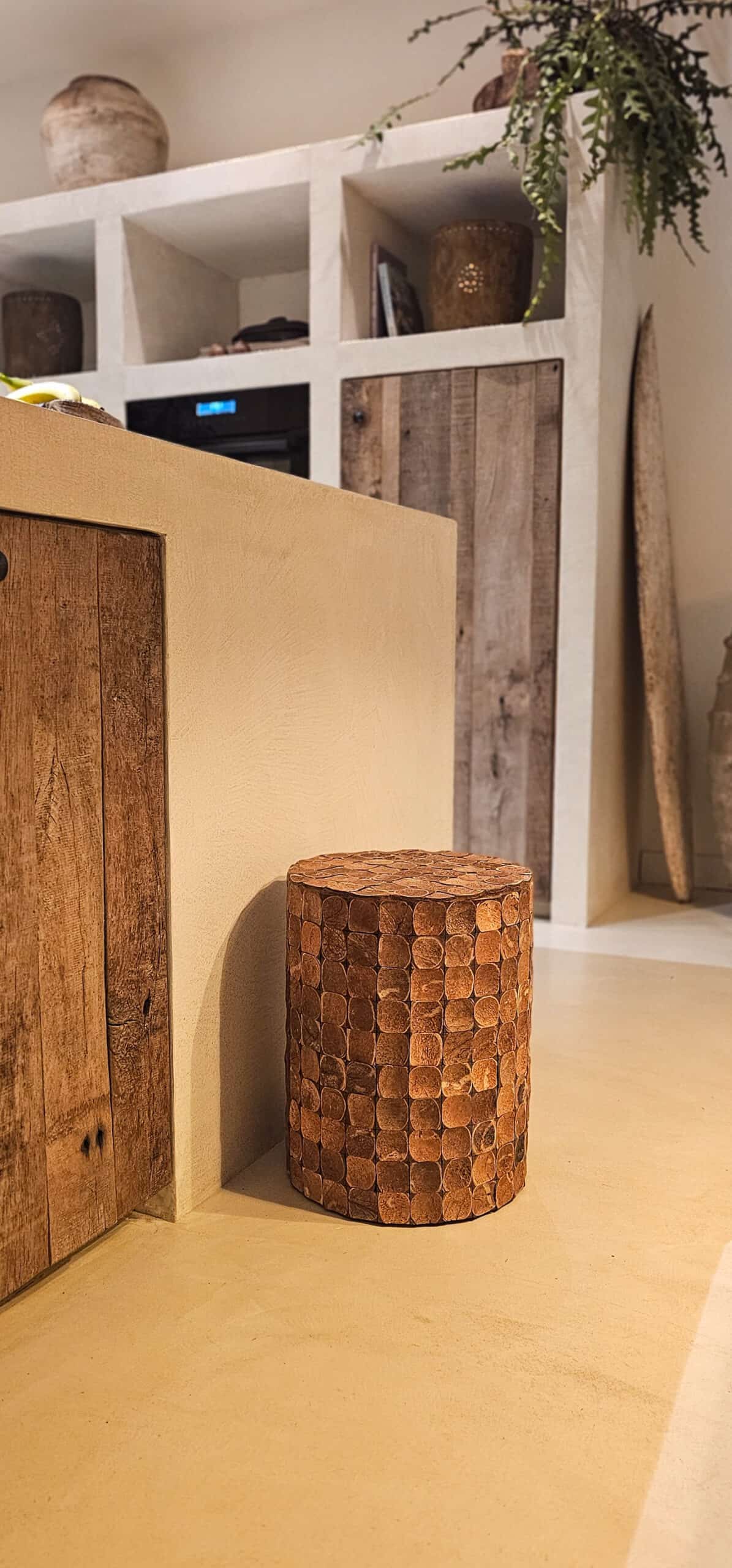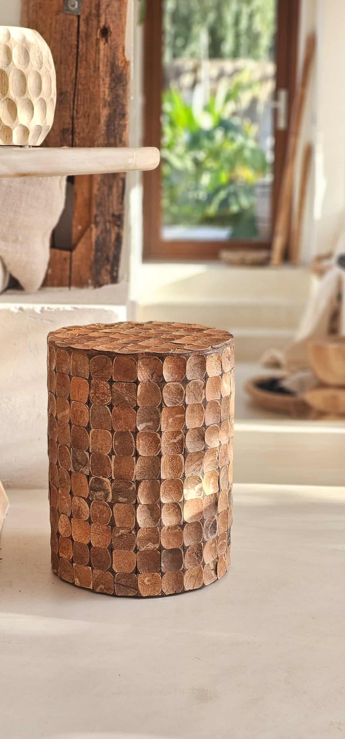 Deze unieke kruk is vervaardigd uit hout en verrijkt met ingelegde kokosdeeltjes waardoor het een warme textuur en organische uitstraling heeft. Deze kruk is niet alleen functioneel maar vormt ook een decoratief statement.