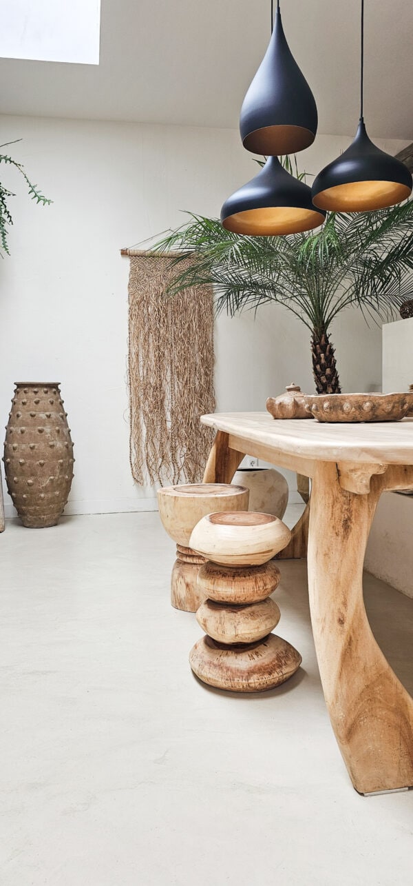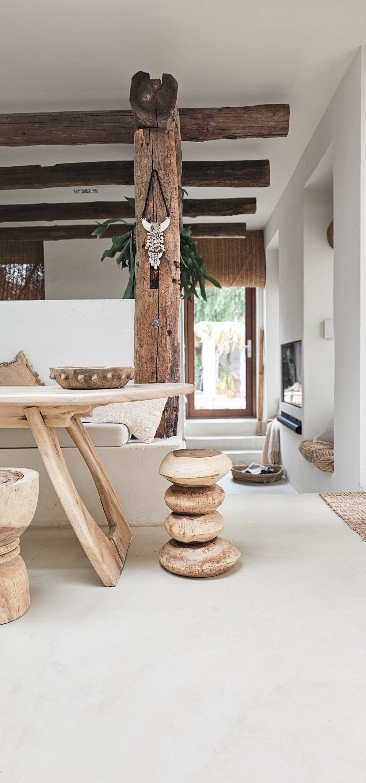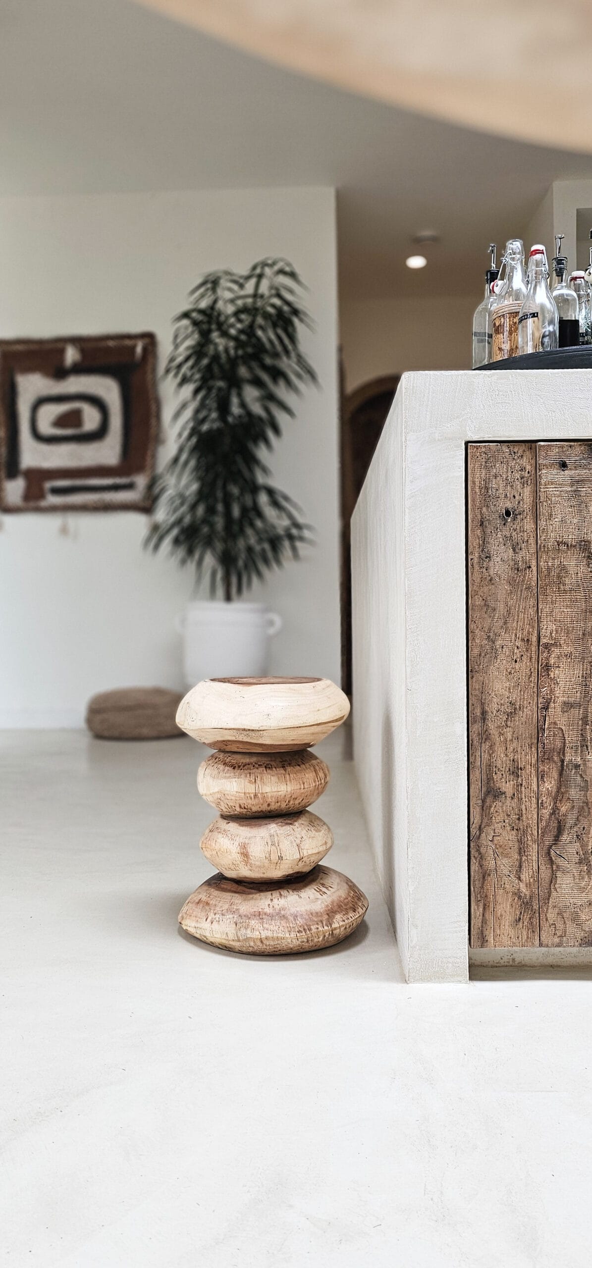 Deze karaktervolle kruk is een prachtig voorbeeld van Javanese ambacht. Het zitgedeelte is opgebouwd uit gestapelde houten schijven, elk met hun eigen unieke structuur en nerven. Door de robuuste afwerking behoudt de kruk zijn natuurlijke uitstraling, waardoor het hout echt tot leven komt. Het minimalistische ontwerp maakt het een veelzijdig meubelstuk: ideaal als zitplek, bijzettafel of sculpturaal accent in je interieur