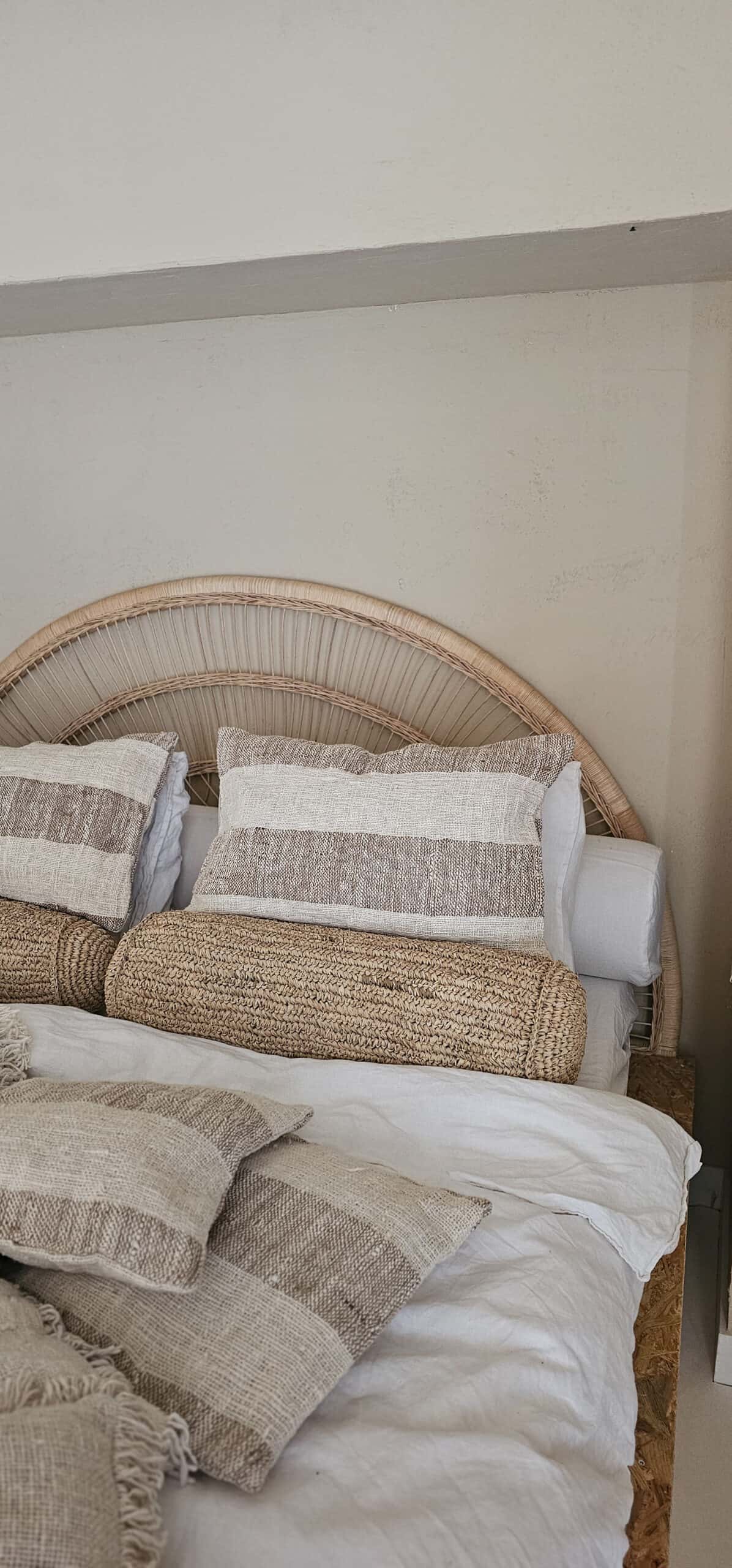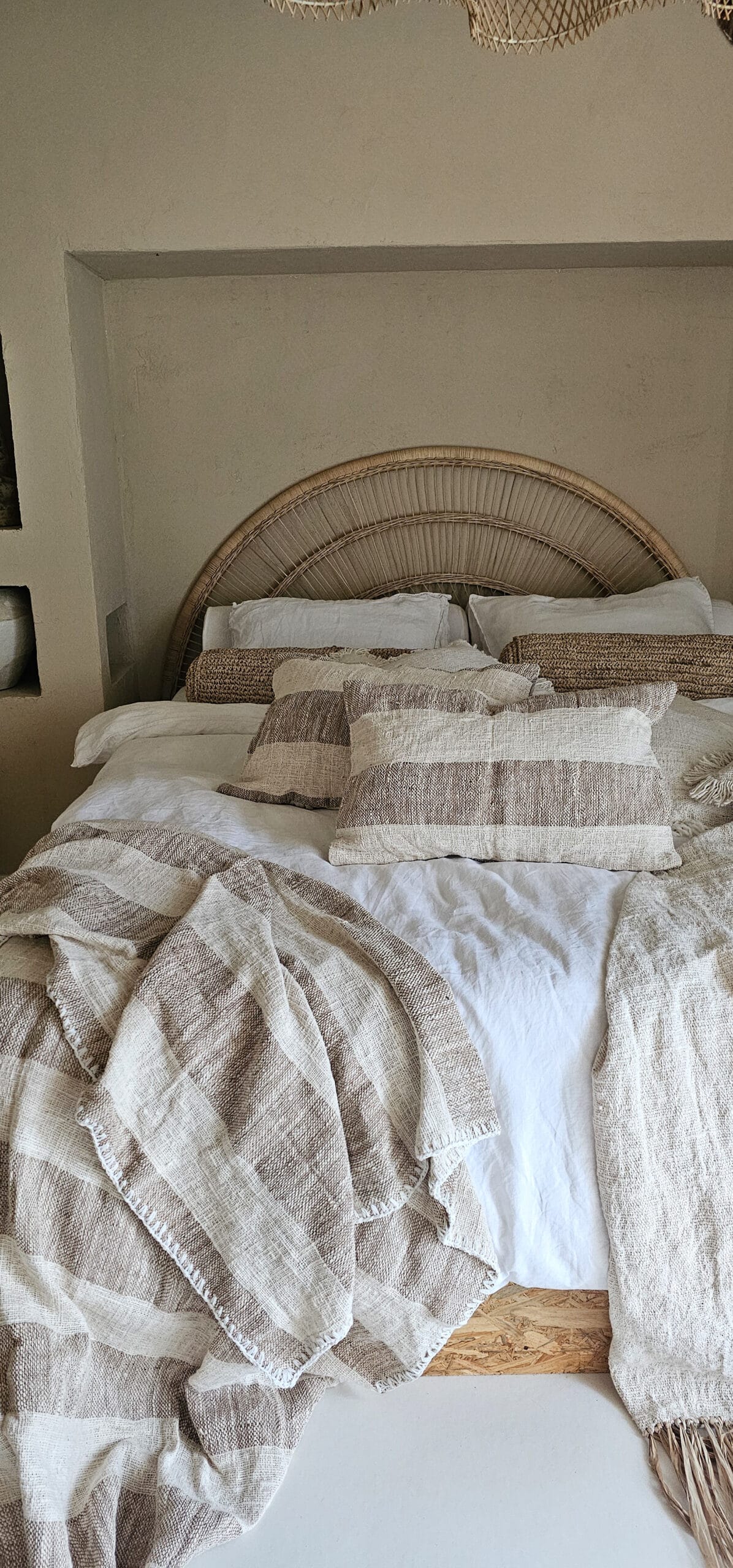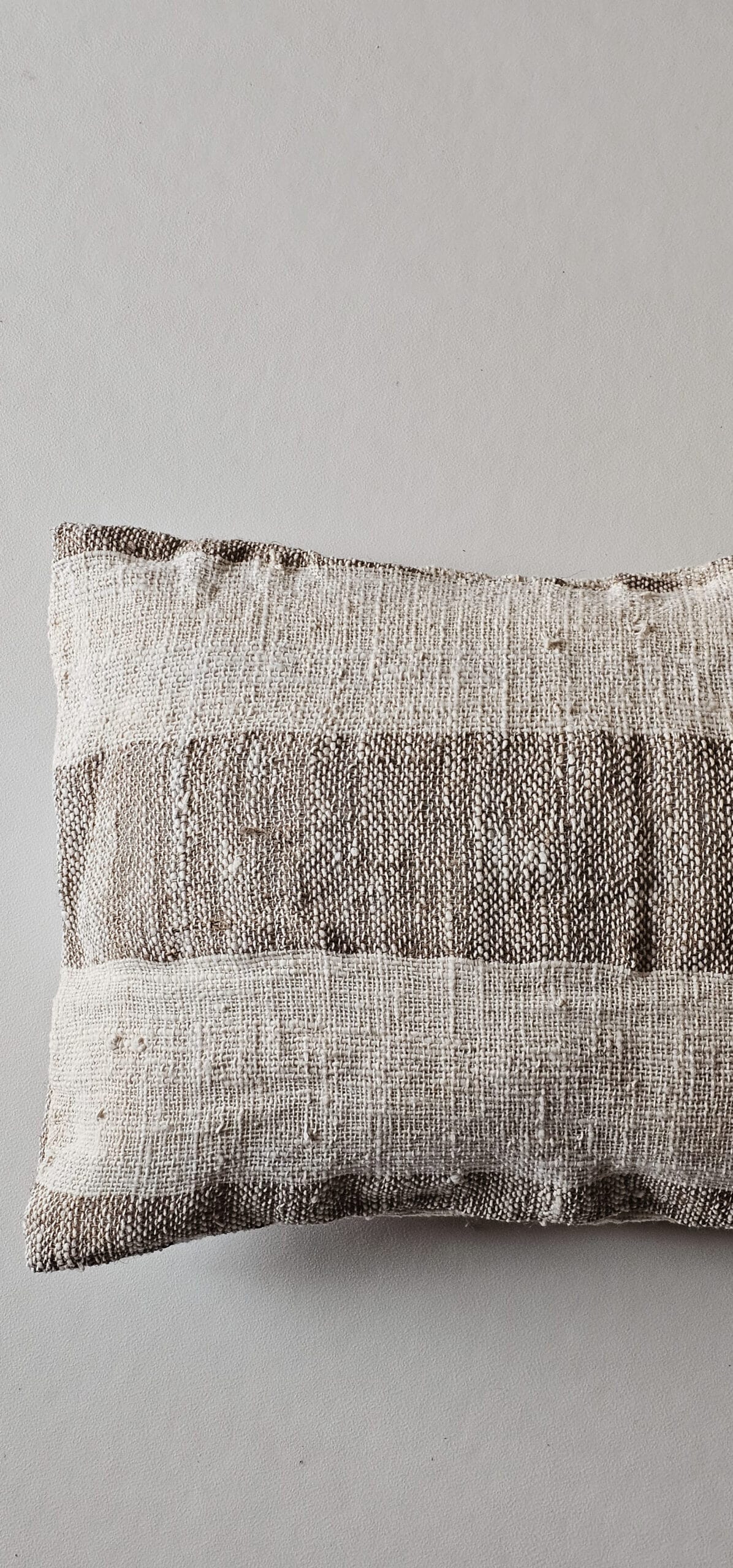 Een prachtig kussen van grof linnen in een bruine – ecru gestreepte kleur.
