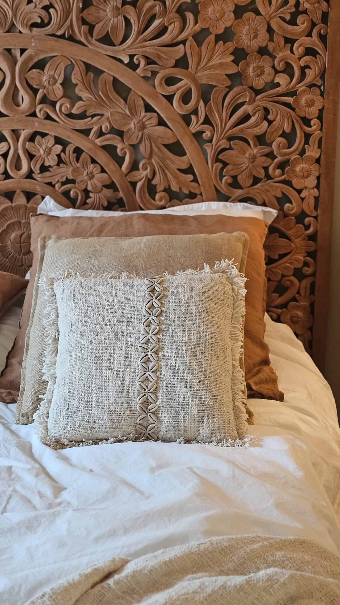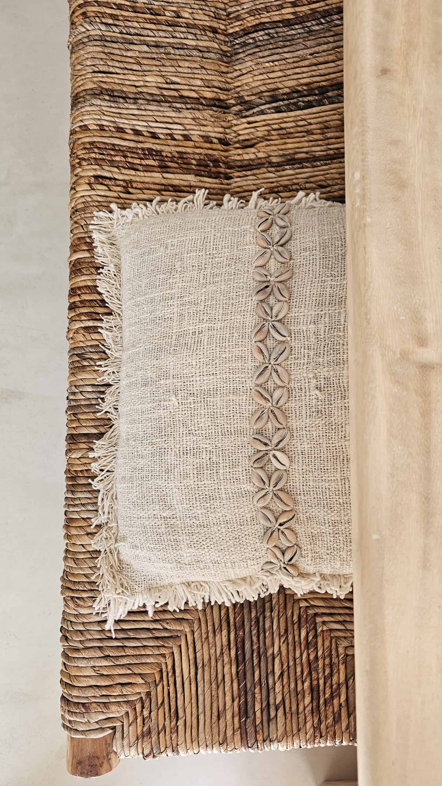 Breng een stukje tropische elegantie in je interieur met dit unieke linnen kussen. Elk kussen is gemaakt van hoogwaardig ademend linnen en afgewerkt met authentieke kauri schelpjes. Pure balinese ambacht. Perfect als accent op je bank fauteuil of bed. Combineert makkelijk door de neutrale kleuren.