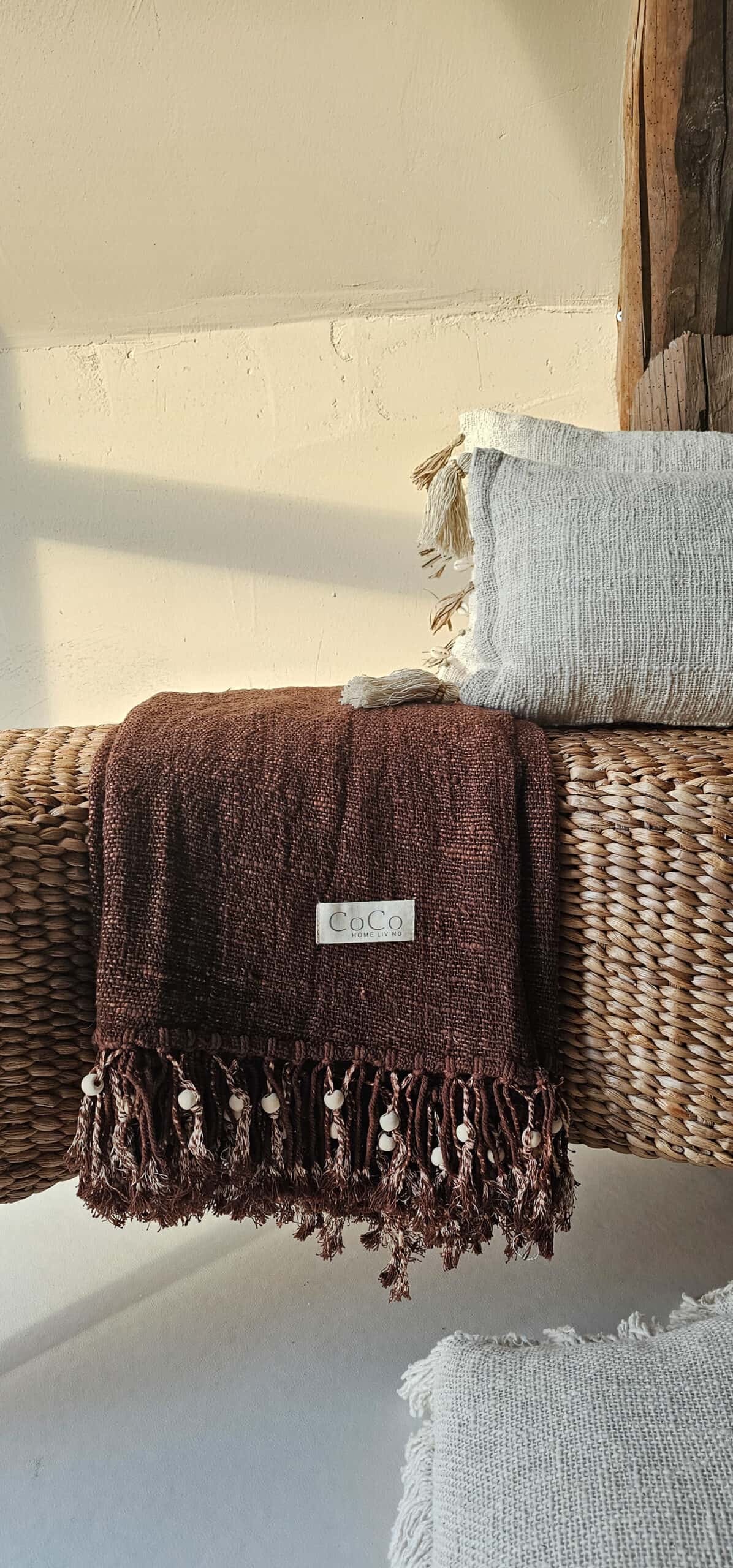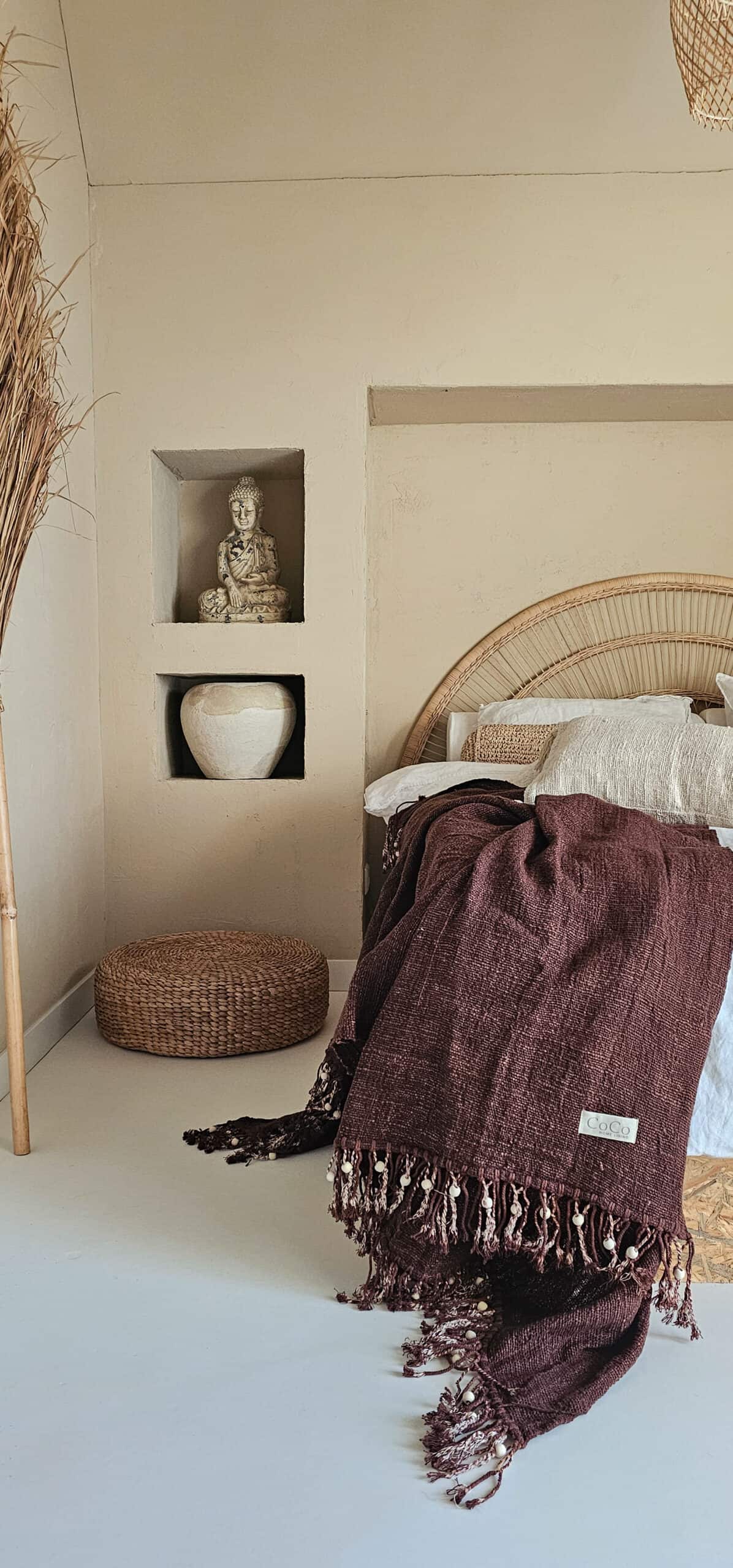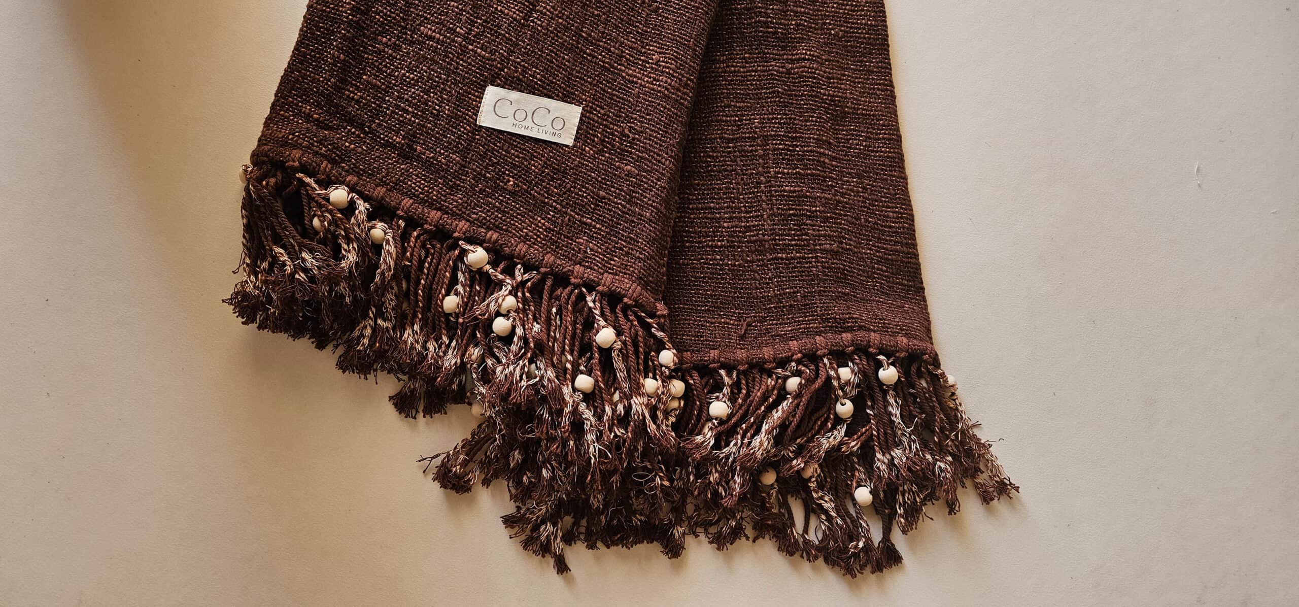 Deze prachtig donkerbruine linnen plaid heeft als accent houten kralen tussen de franjes. Een plaatje om mee te decoreren en heerlijk om onder te liggen. Voelt zacht aan en is zeer soepel. Ook mooi te combineren met de andere linnen plaids en kussens.
