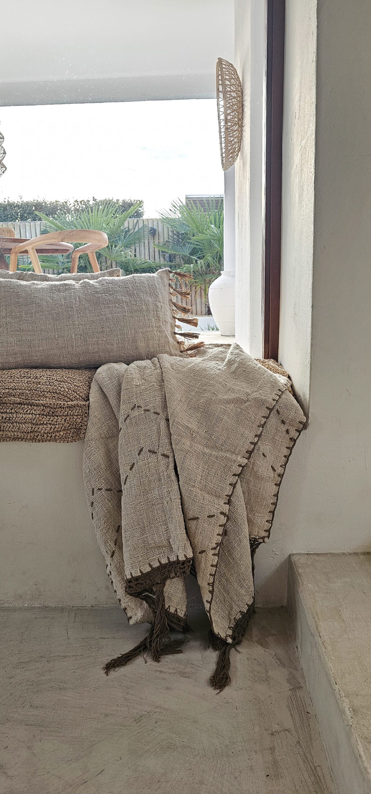Een prachtig plaid van grof linnen met bruine macramé uiteinden met franjes en prachtige bruine stiksels als accent.