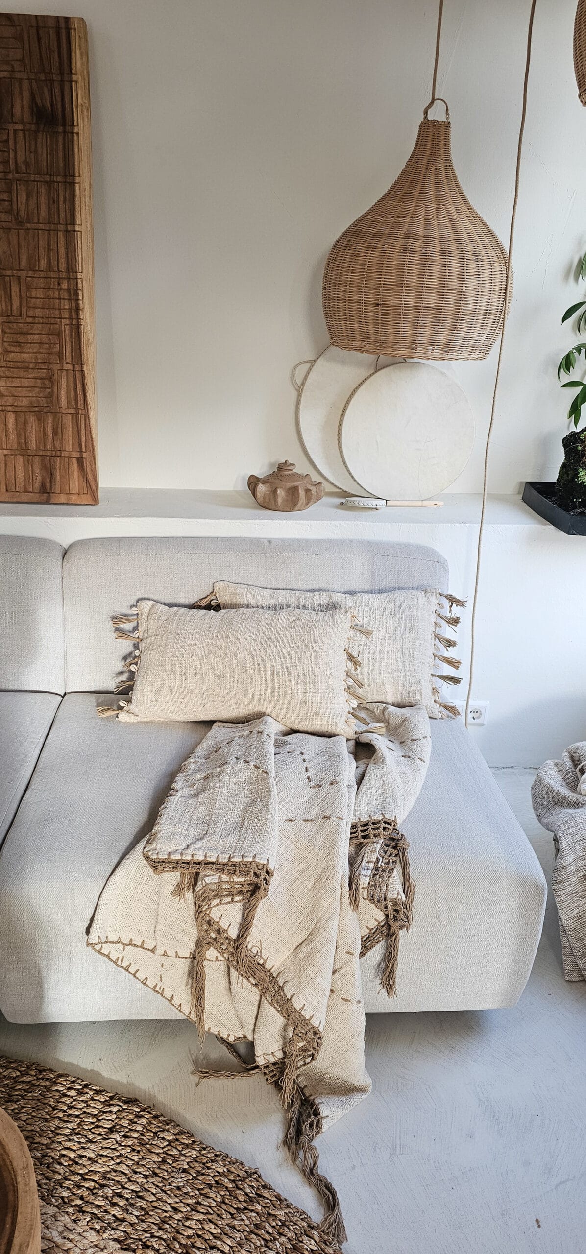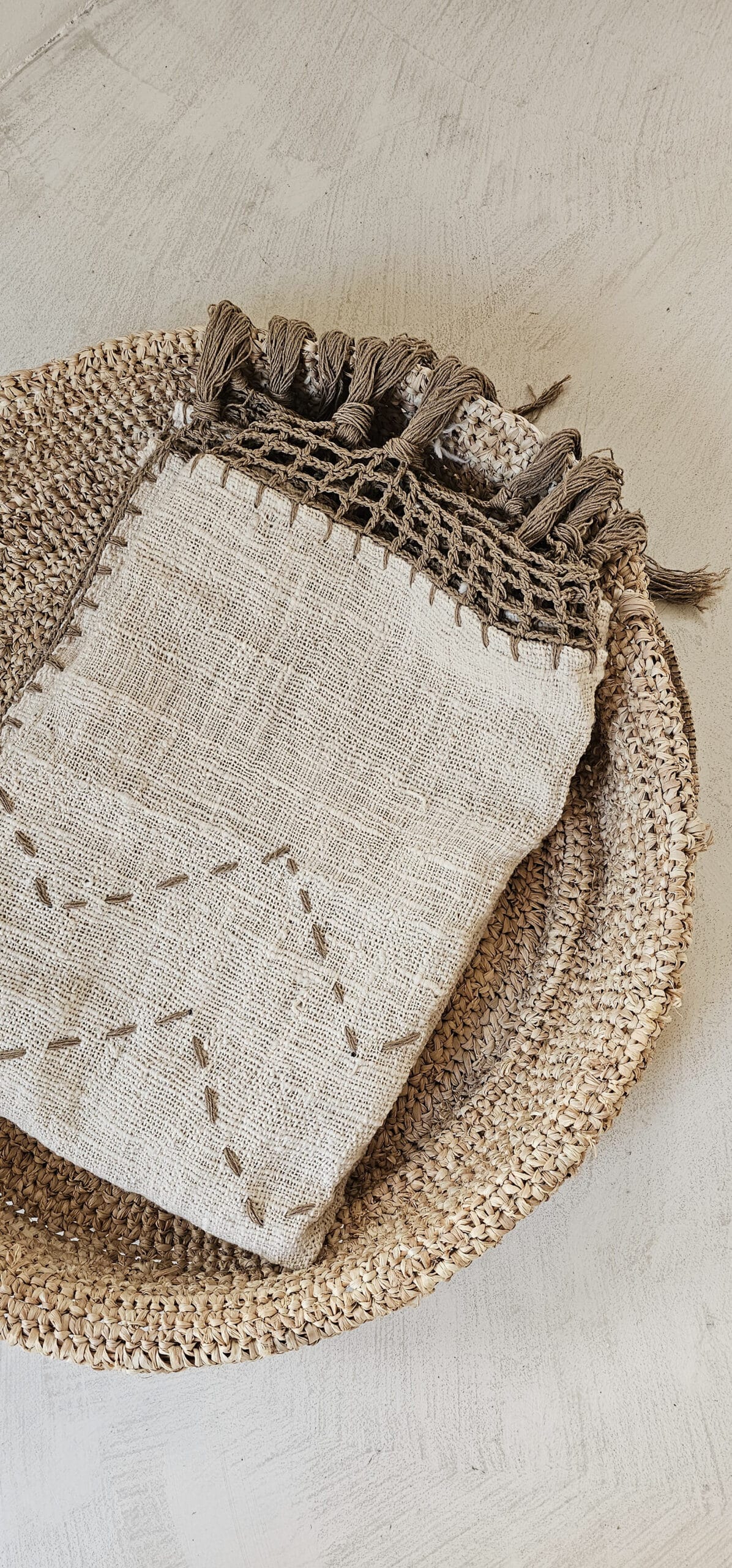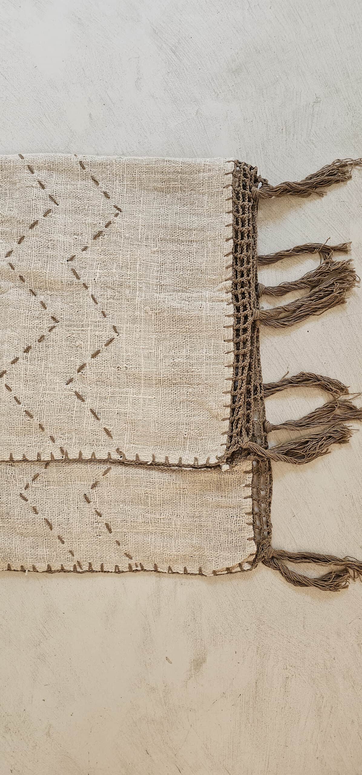 Linnen plaid met bruine macramé en stiksels