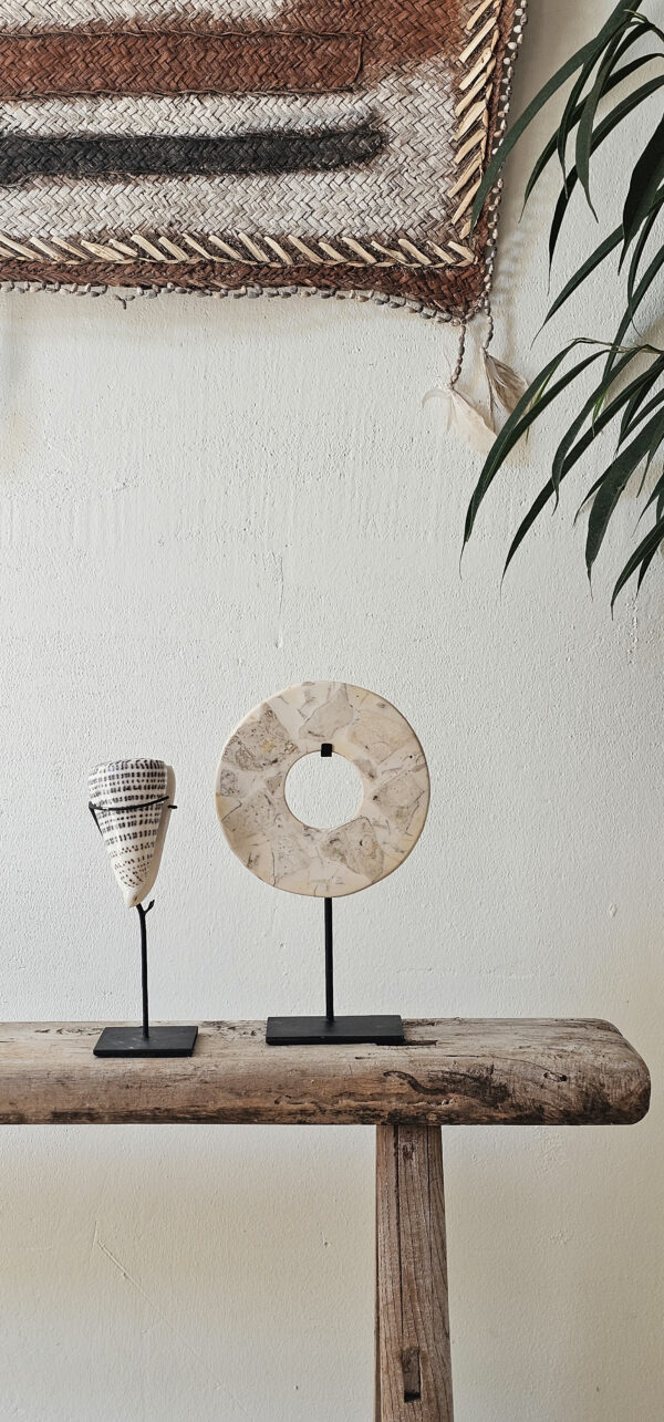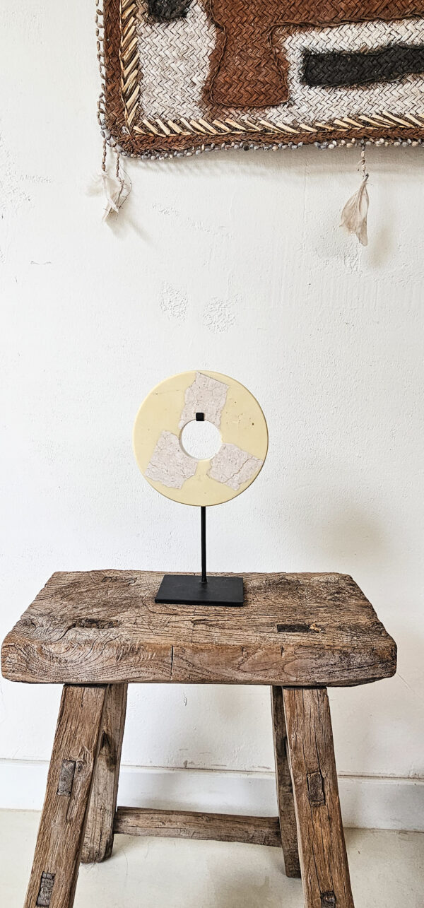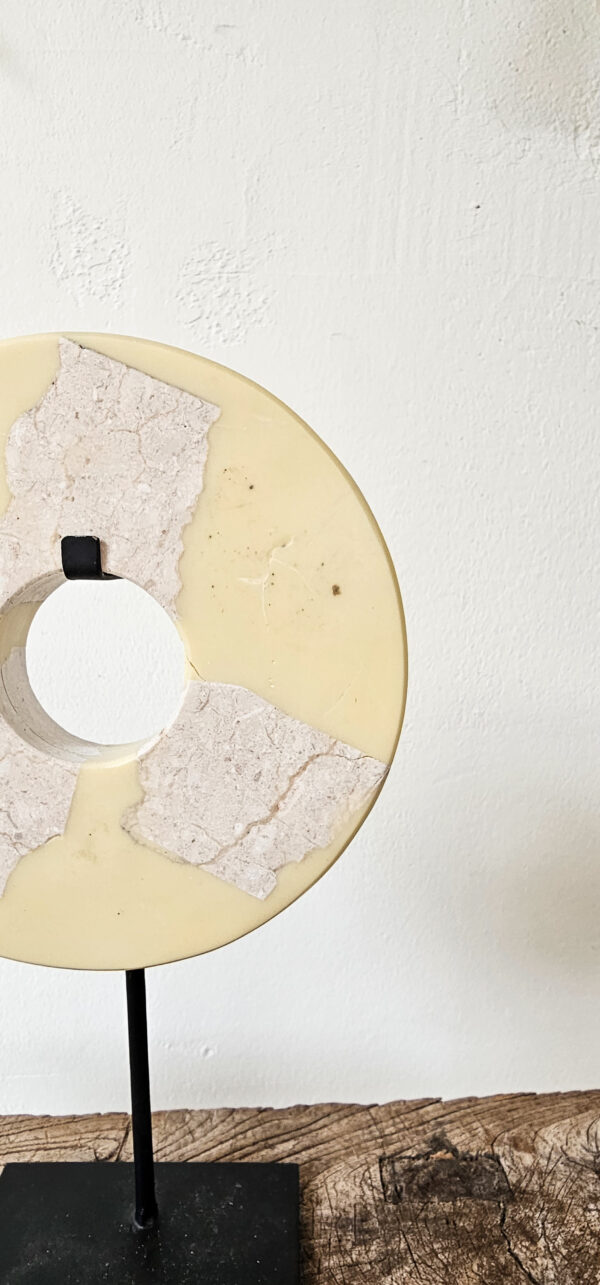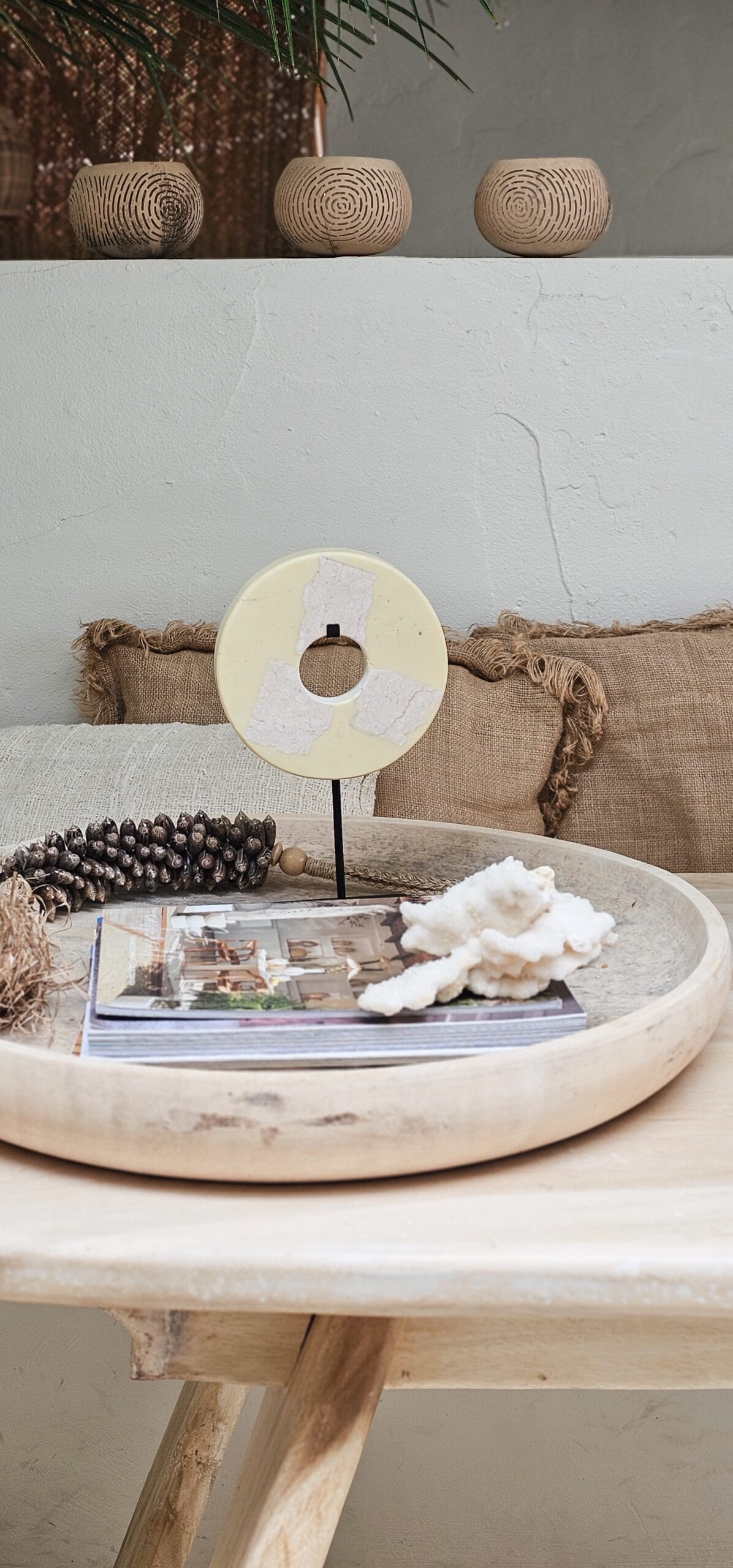 Deze unieke decoratieve schijf is een prachtig voorbeeld van Balinees vakmanschap. Met zijn ronde vorm, centrale uitsparing en organisch geplaatste lichte accenten straalt hij een natuurlijke en spirituele charme uit. De schijf is stevig gemonteerd op een zwarte metalen standaard, waardoor het stuk perfect tot zijn recht komt op een dressoir, vensterbank of bijzettafel. Het is een hardsteen met marmeren harsbewerking.