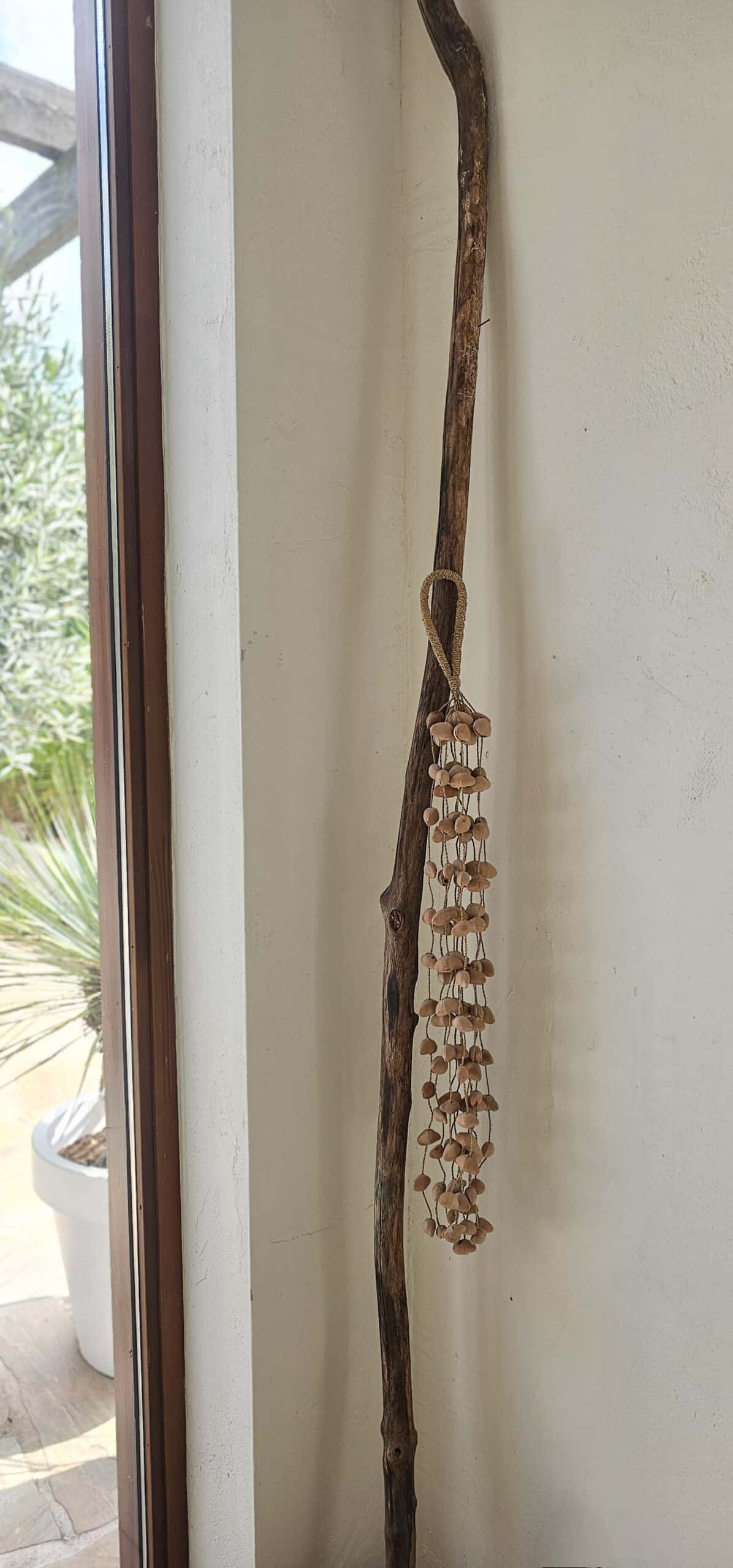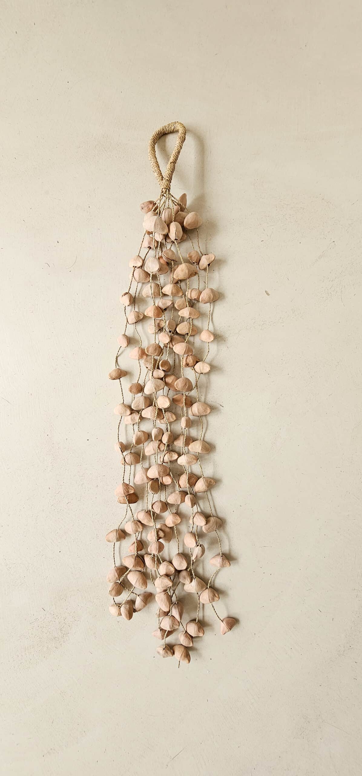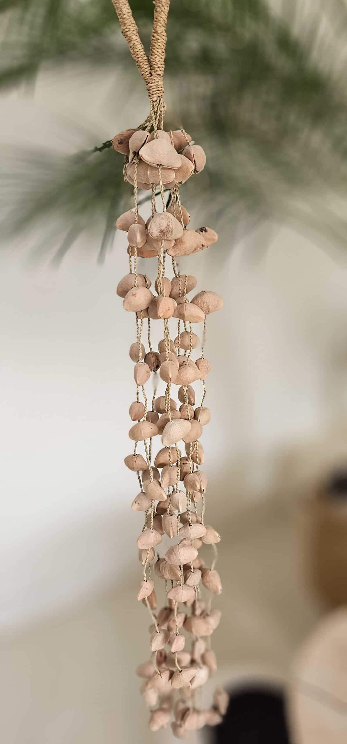Deze rammelaar is gemaakt van gedroogde zaaddozen aan een touw met een lusje om hem op te hangen. De zaaddozen zijn iets kleiner van formaat dan de andere notenshakers wat het geluid iets fijner en lichter klinkt. Mijn persoonlijke favoriet!