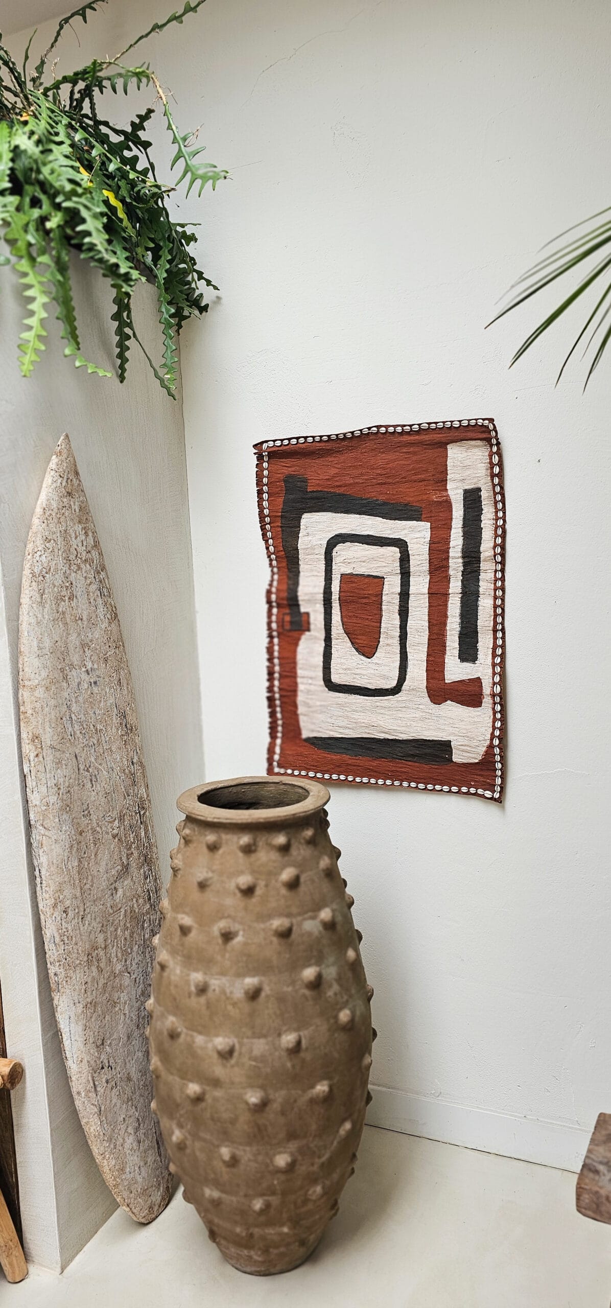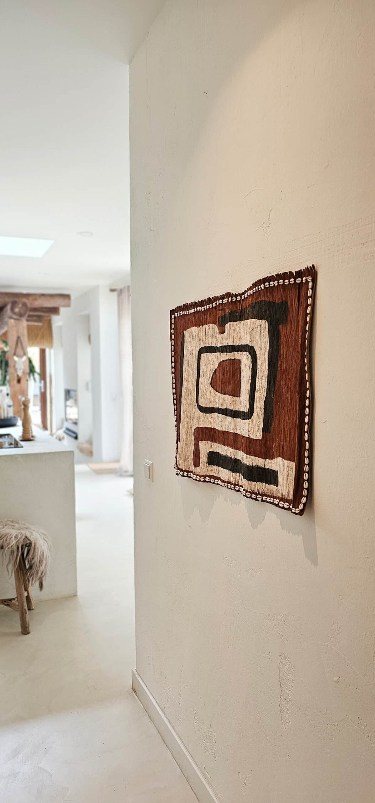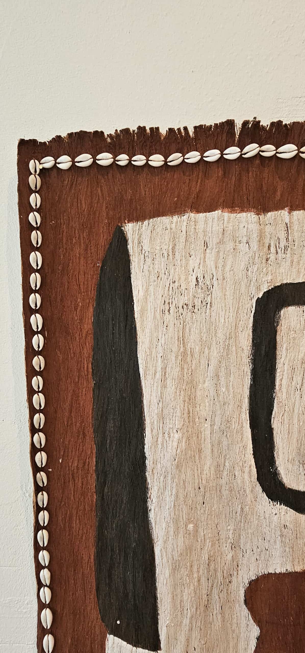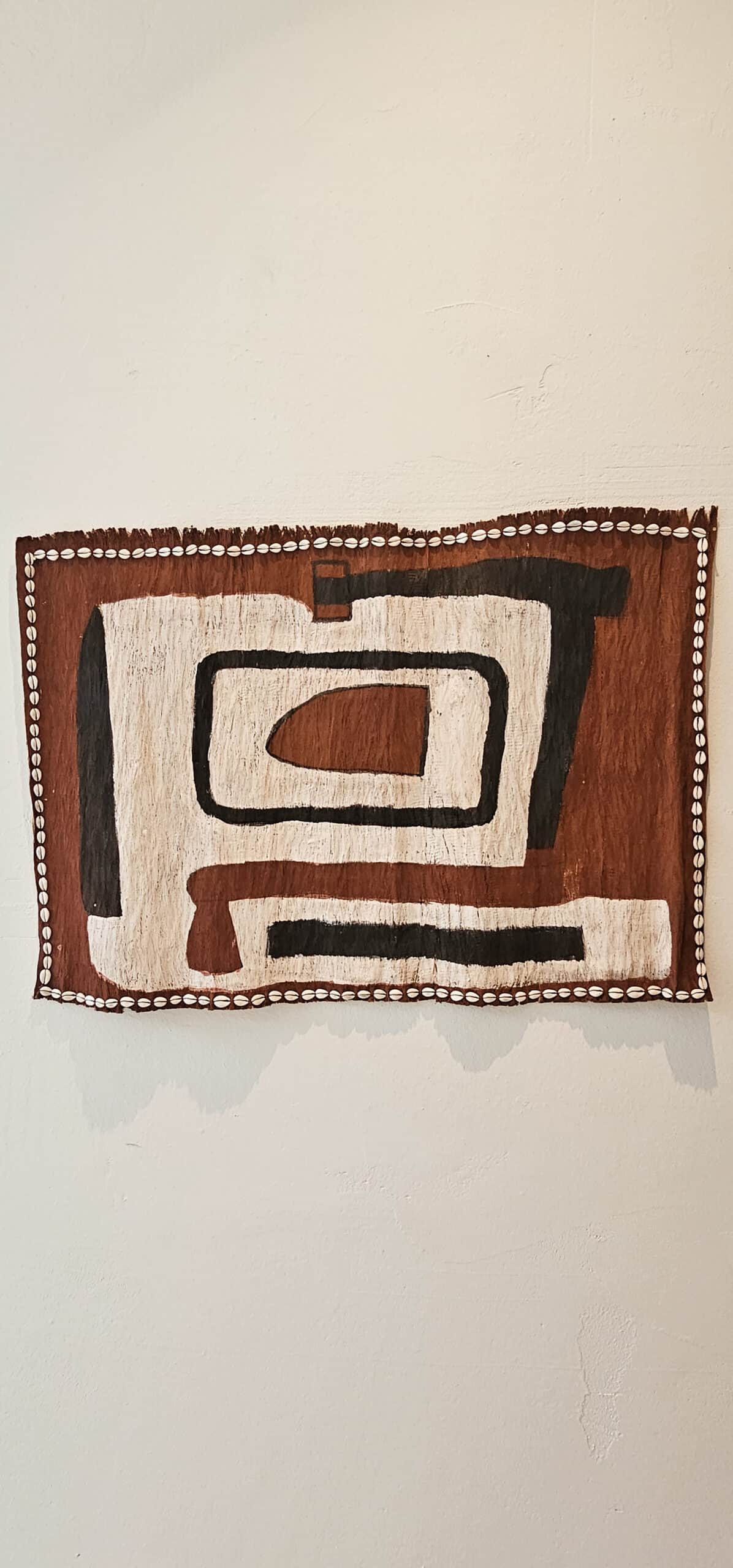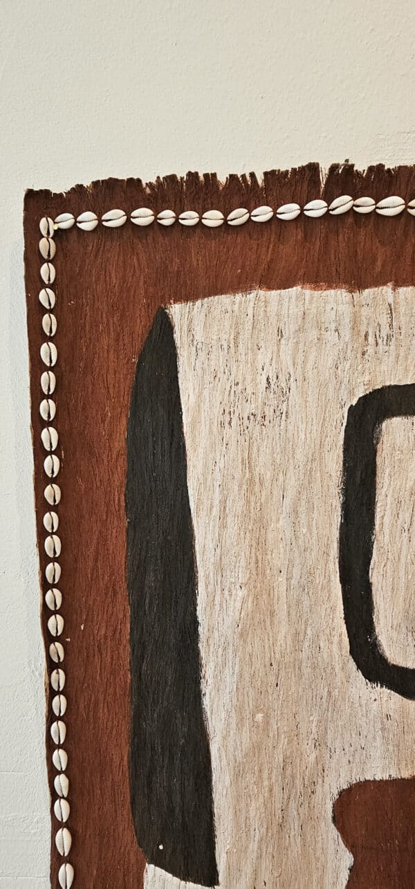 Dit bijzondere wanddoek uit Papua, Indonesië is een harmonieuze samensmelting van cultuur, natuur en vakmanschap. Het rechthoekige doek is rijk versierd met abstracte motieven in diepbruine, witte en zwarte tinten – elk symbool vertelt z’n eigen stil verhaal. De randen zijn omlijst met zorgvuldig geplaatste witte schelpen, als eerbetoon aan de zee en het spirituele leven dat daaruit voortvloeit.