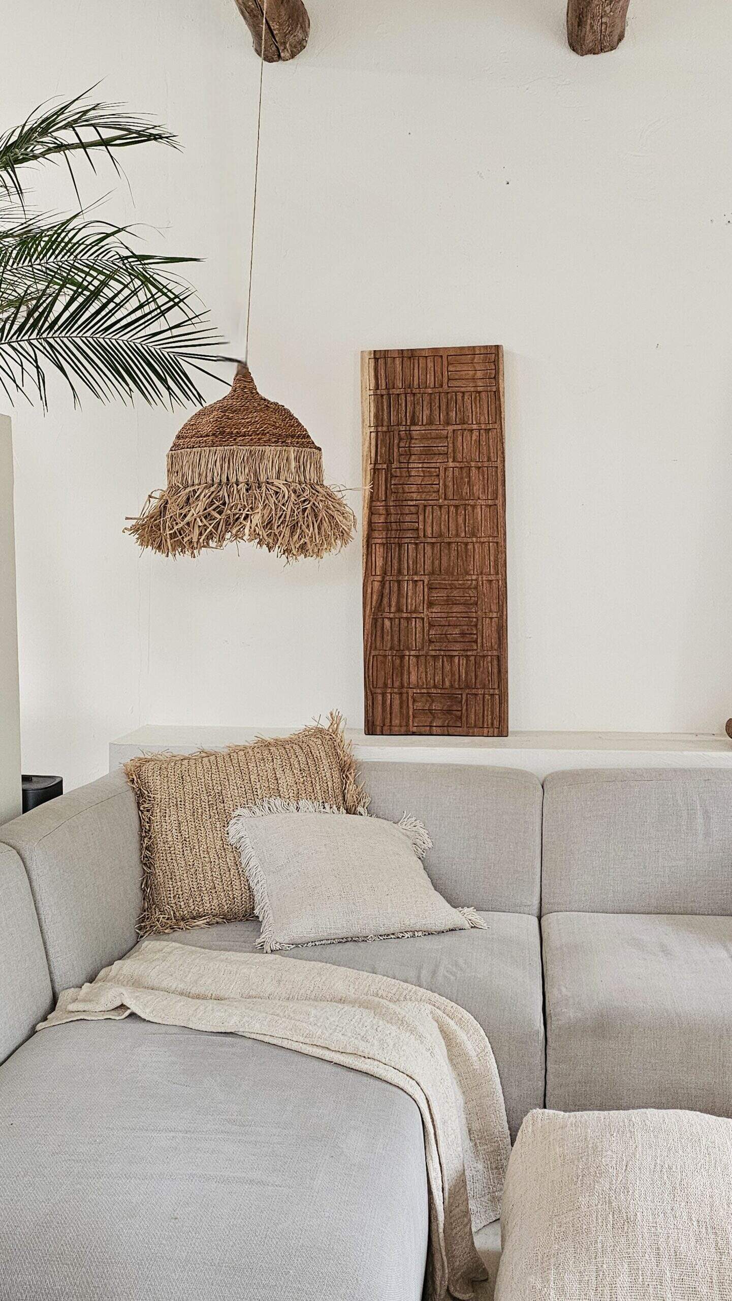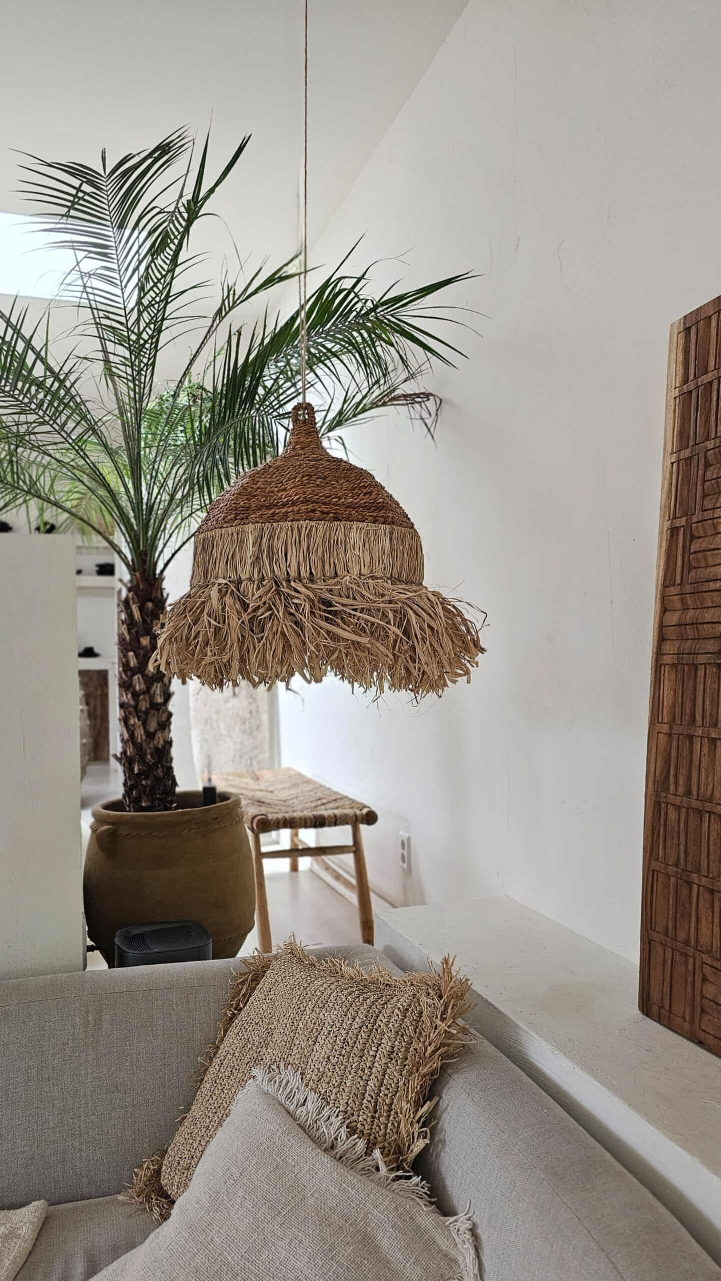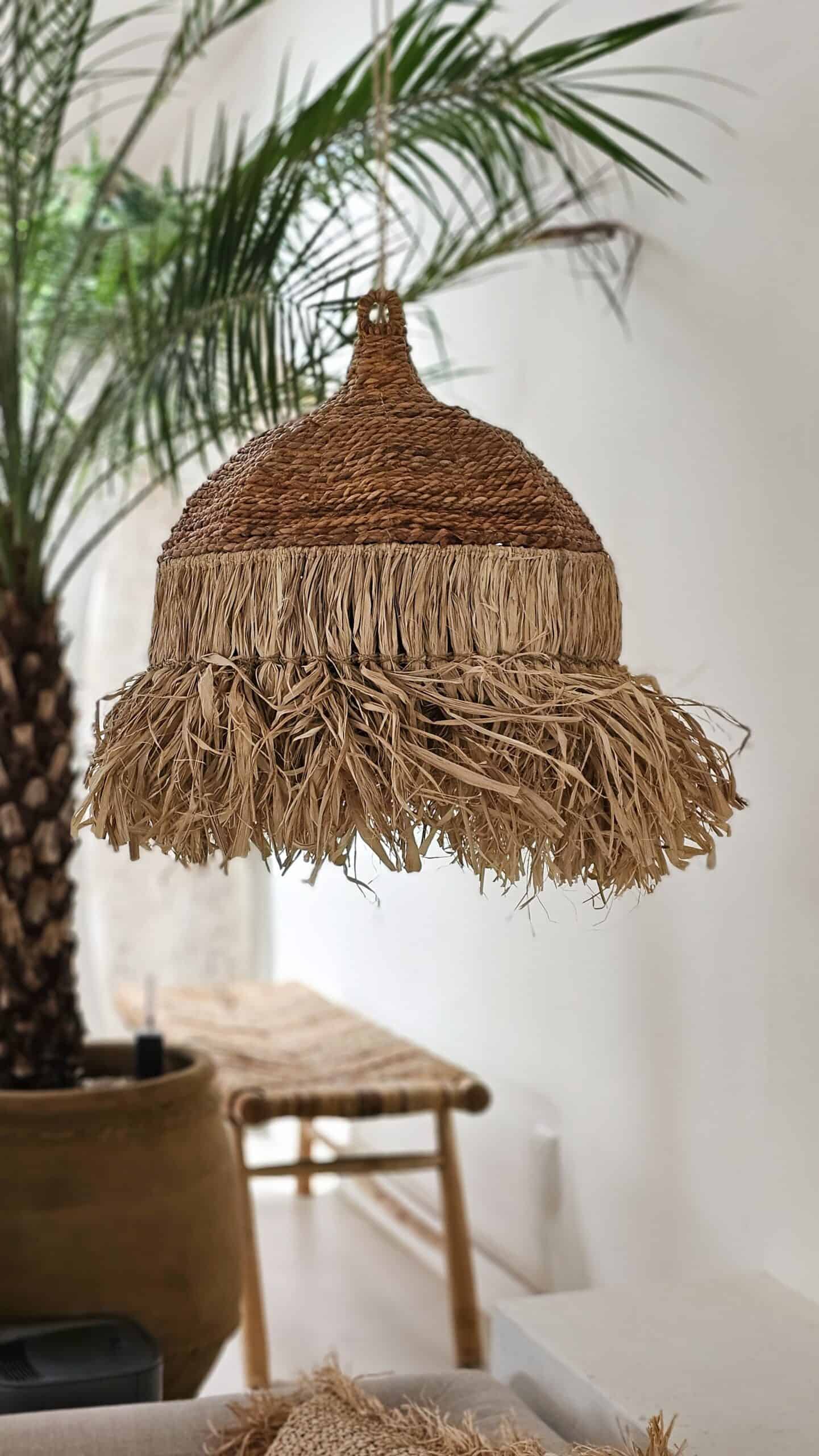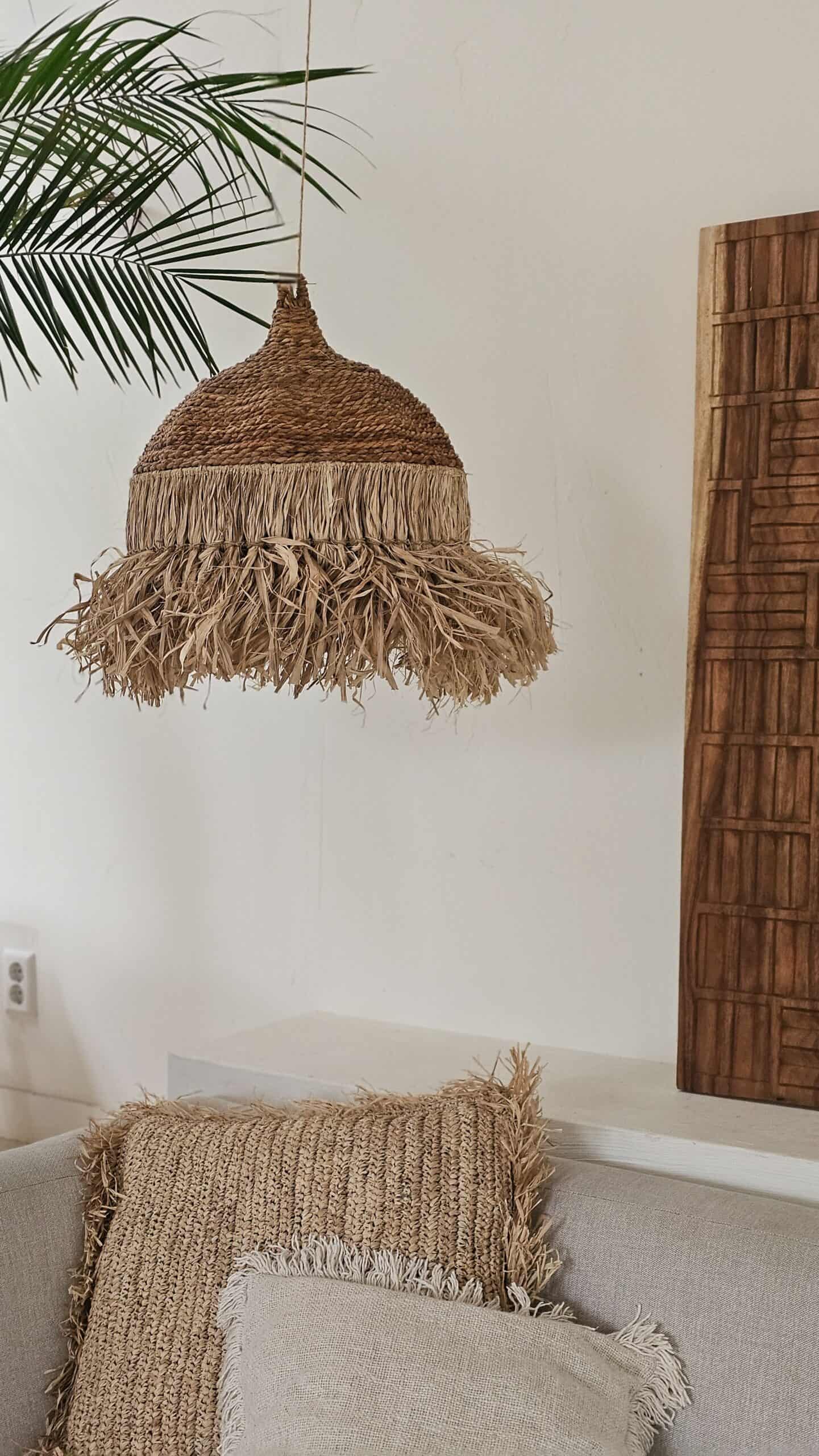 Een prachtige hanglamp uit bali, gemaakt van bananenblad en raffia. Het natuurlijke materiaal geeft de lamp een warme en organische uitstraling, perfect voor een sfeervol en stijlvol interieur. Een speelse en toch rustieke lamp die de ruimte een extra dimensie geeft.