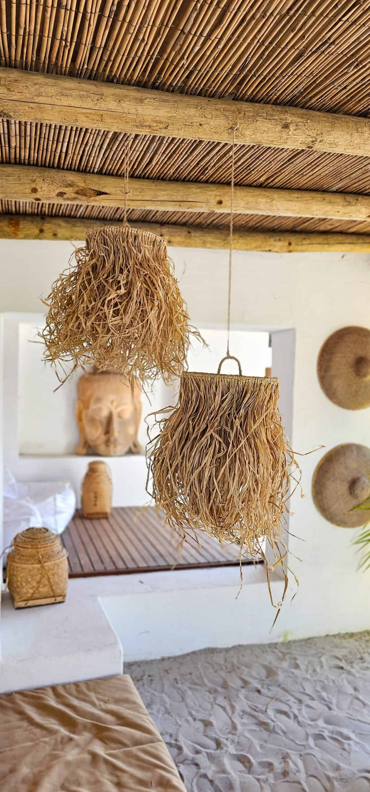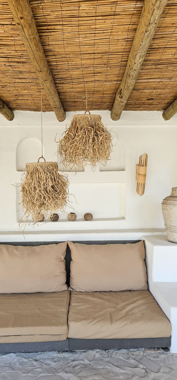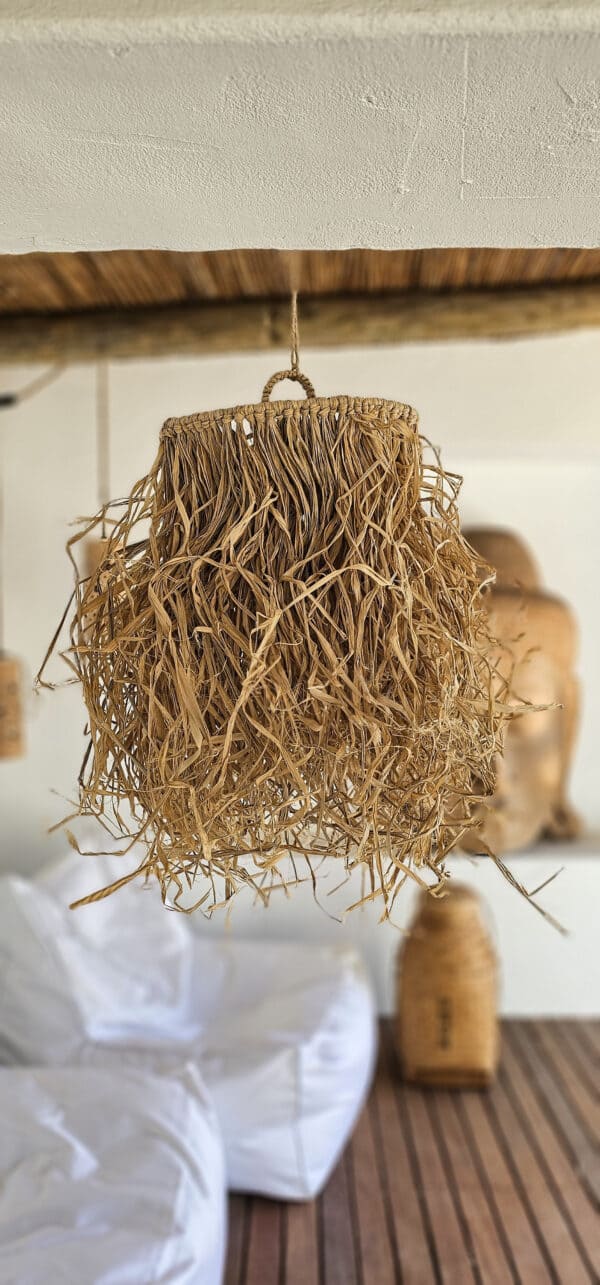 Deze unieke lamp is met de hand gemaakt en voorzien van raffia stroken, wat zorgt voor een warme en gezellige uitstraling. Het gebruik van natuurlijke materialen zoals raffia geeft de lamp een bohemian en beachy sfeer, perfect voor een woonkamer, slaapkamer of eetkamer en zelfs buiten onder een overkapping.