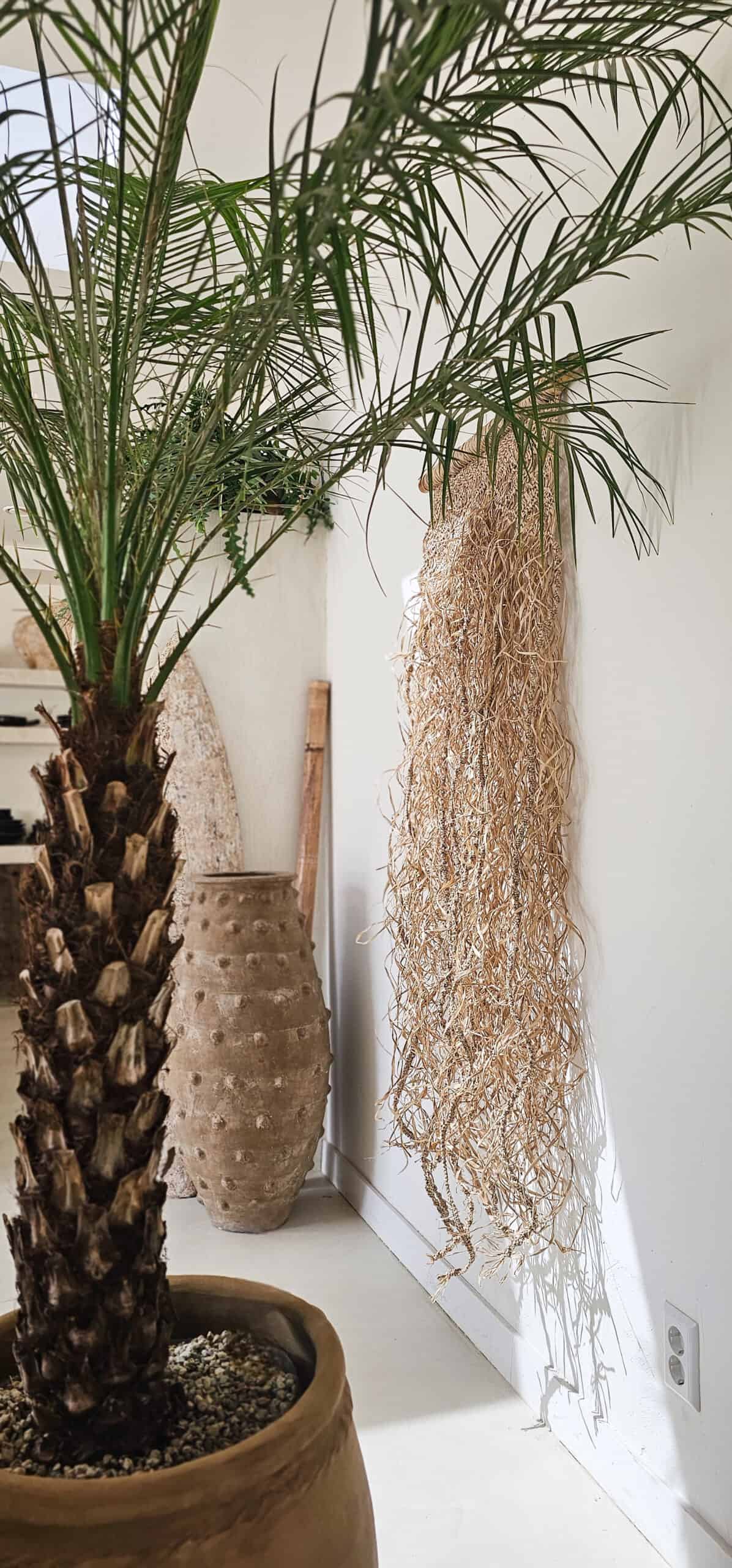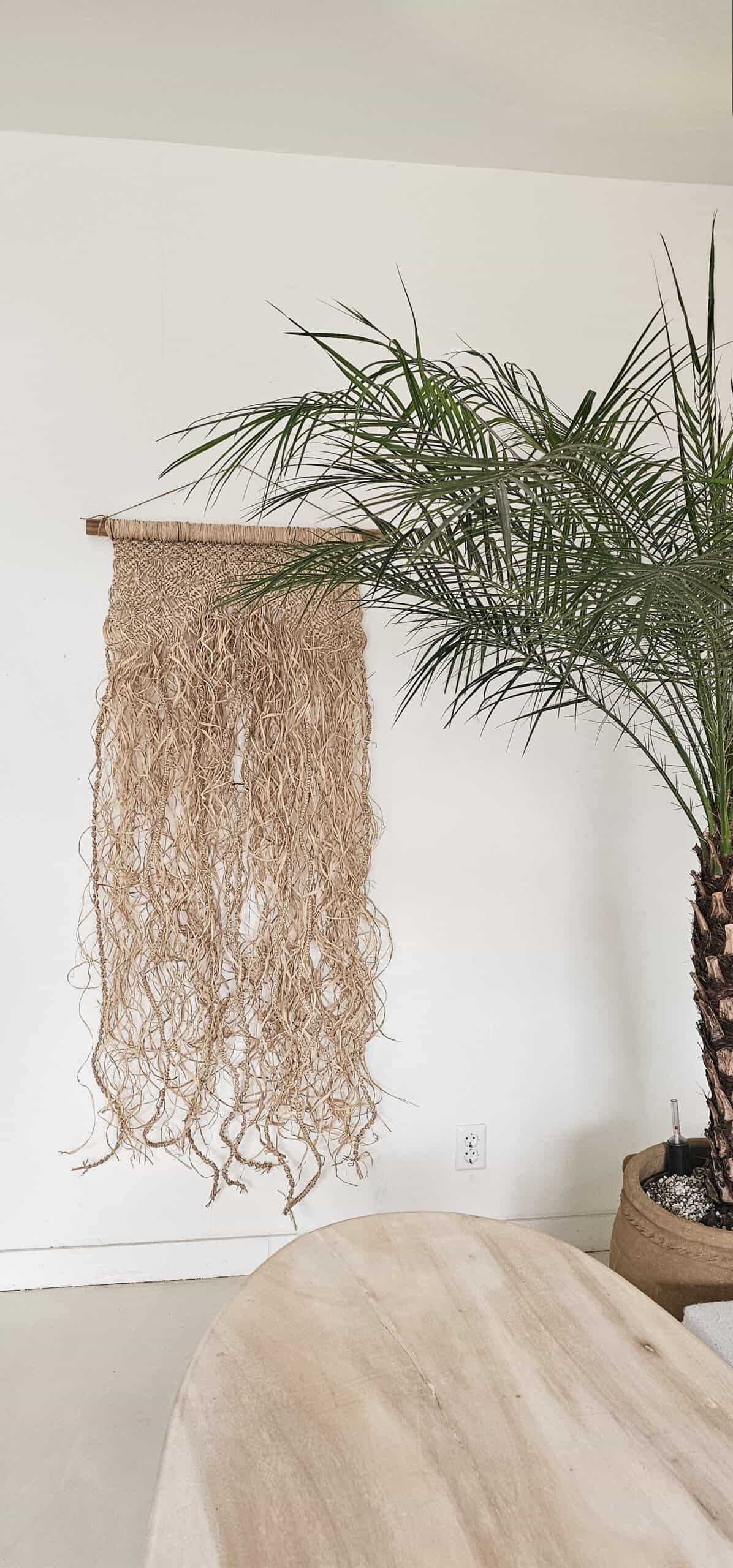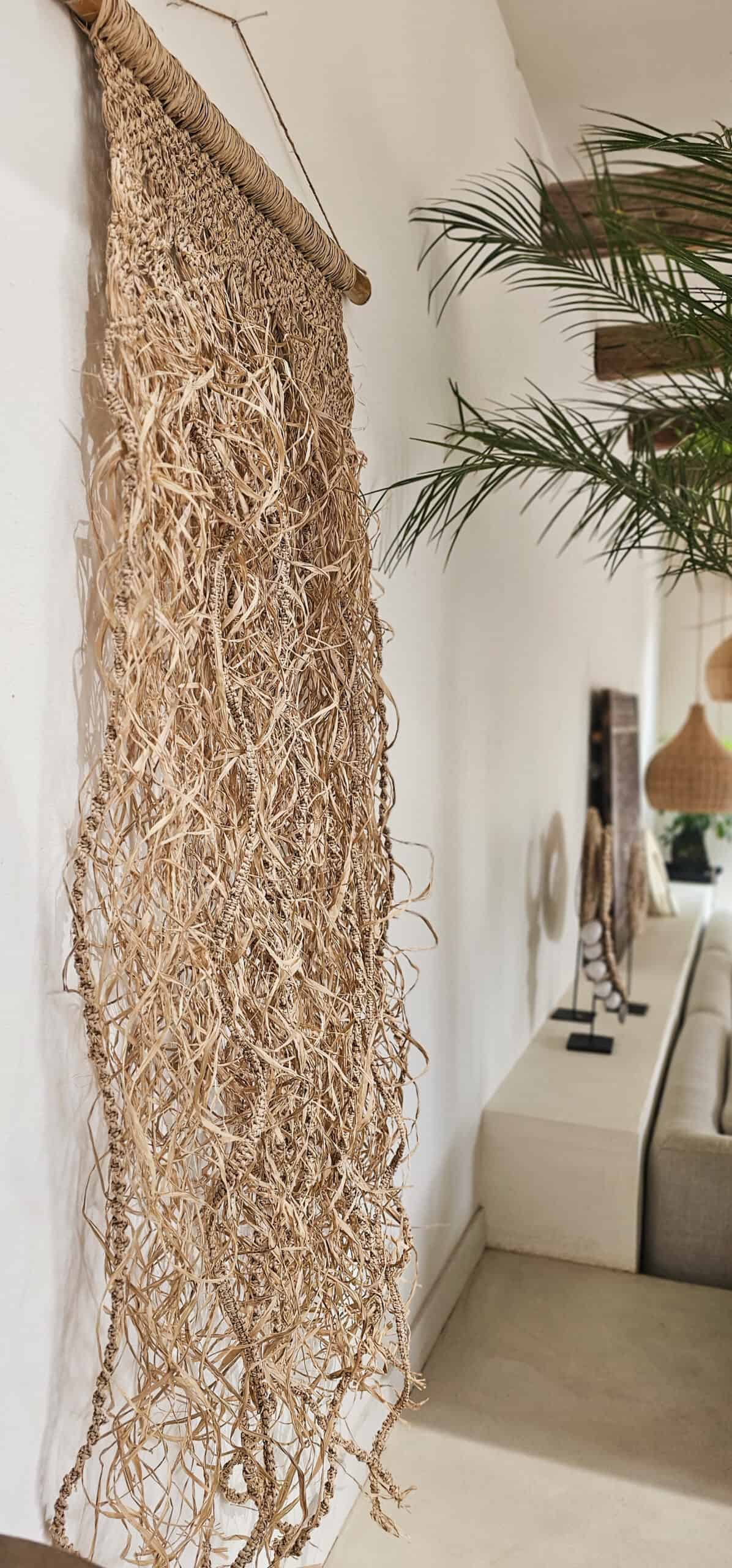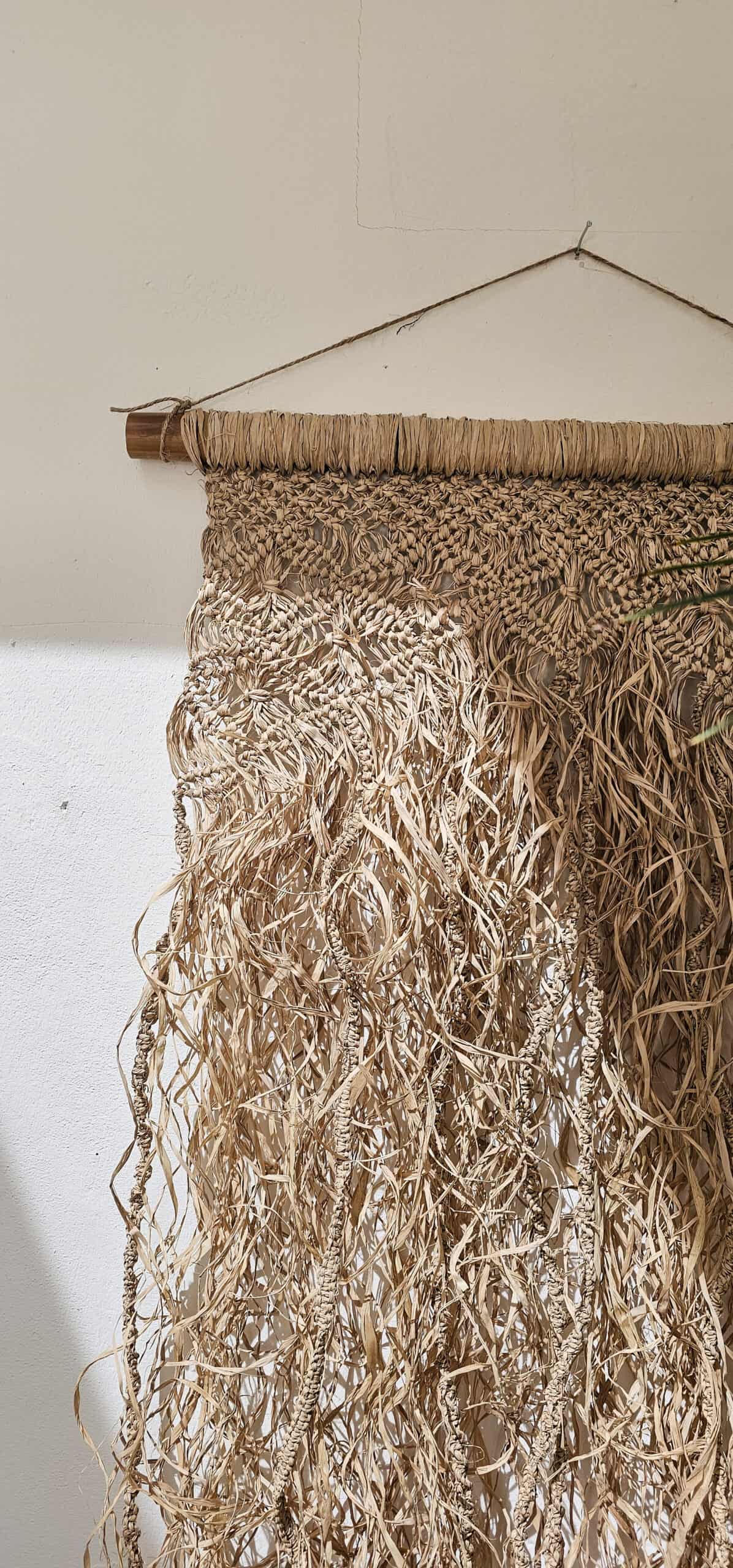 Een prachtig wandkleed gemaakt van raffia, waarin verfijnde macramé-technieken zijn verwerkt. Dit decoratieve stuk voegt een natuurlijke en bohemian uitstraling toe aan je interieur. De combinatie van grof geweven raffia en gedetailleerde macramé-knooptechnieken zorgt voor een uniek en speels effect, perfect om een warme en stijlvolle sfeer te creëren. Elegant door z’n lange strings. Ideaal als statement piece in de woonkamer, slaapkamer of een gezellige hoek in huis.