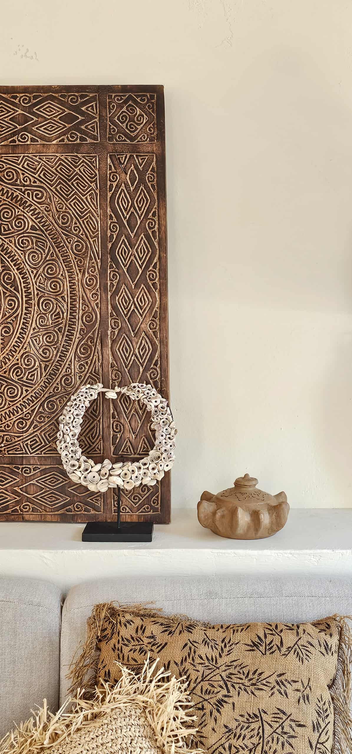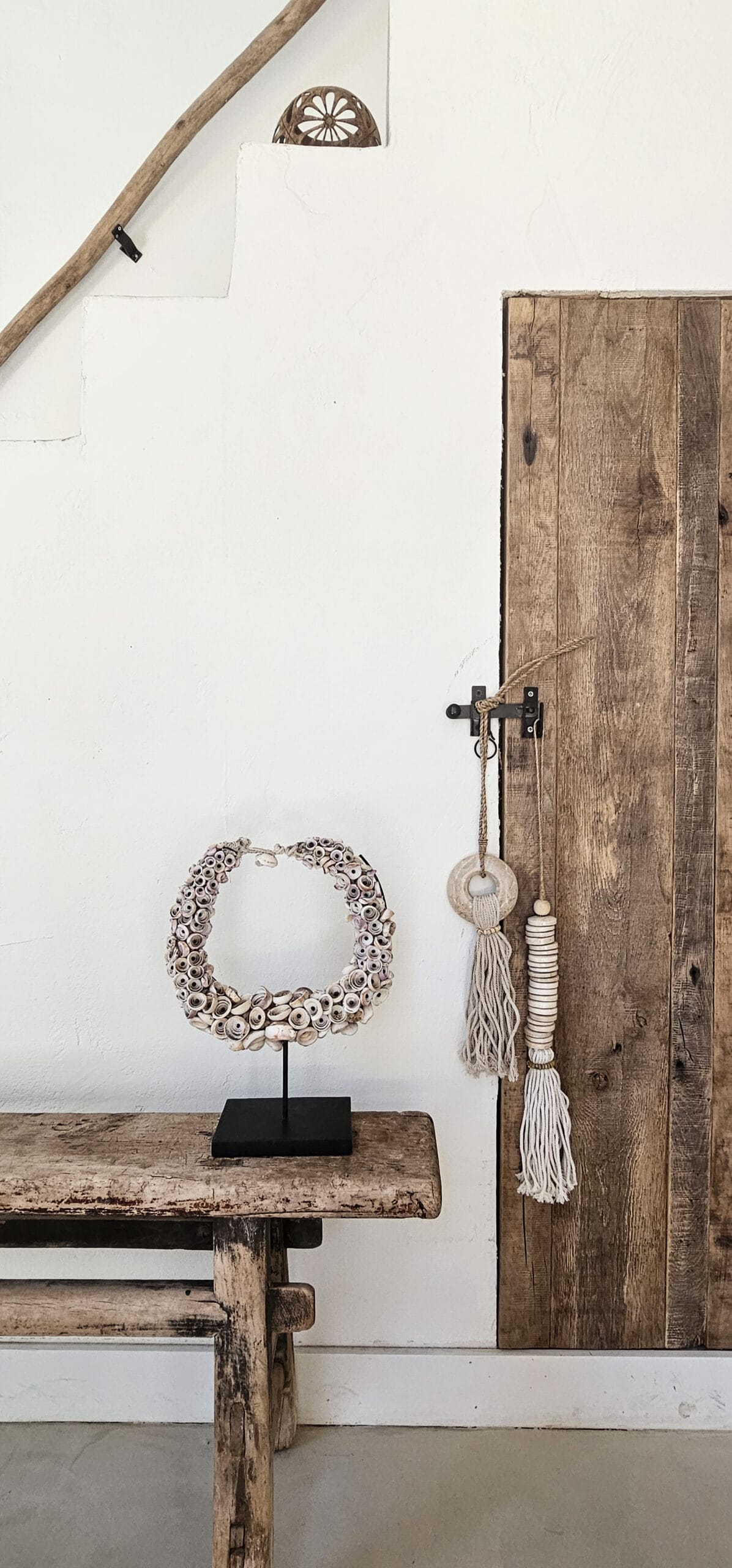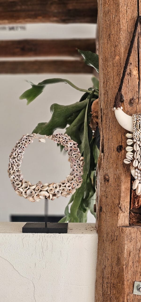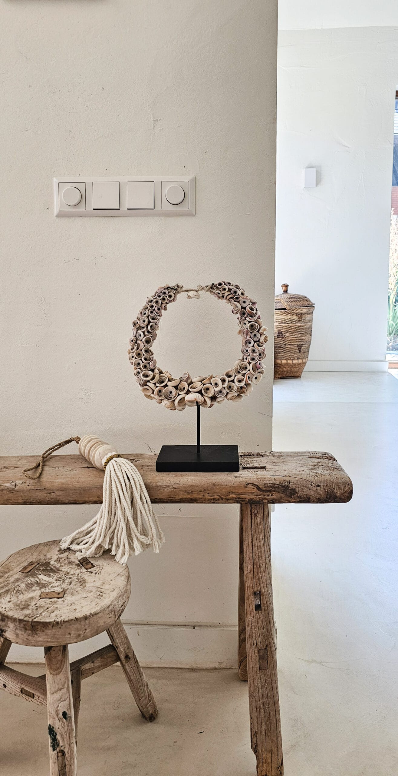 Gemaakt van zorgvuldig uitgekozen kleine schelpjes, die in een harmonieuze cirkel zijn gerangschikt, straalt dit decoratieve item een natuurlijke charme en tropische elegantie uit.