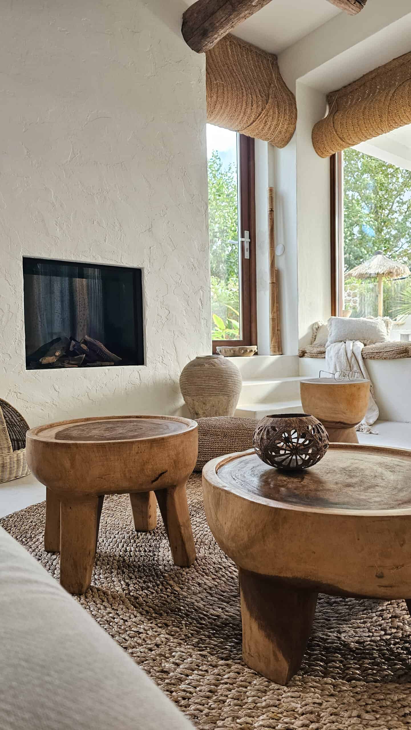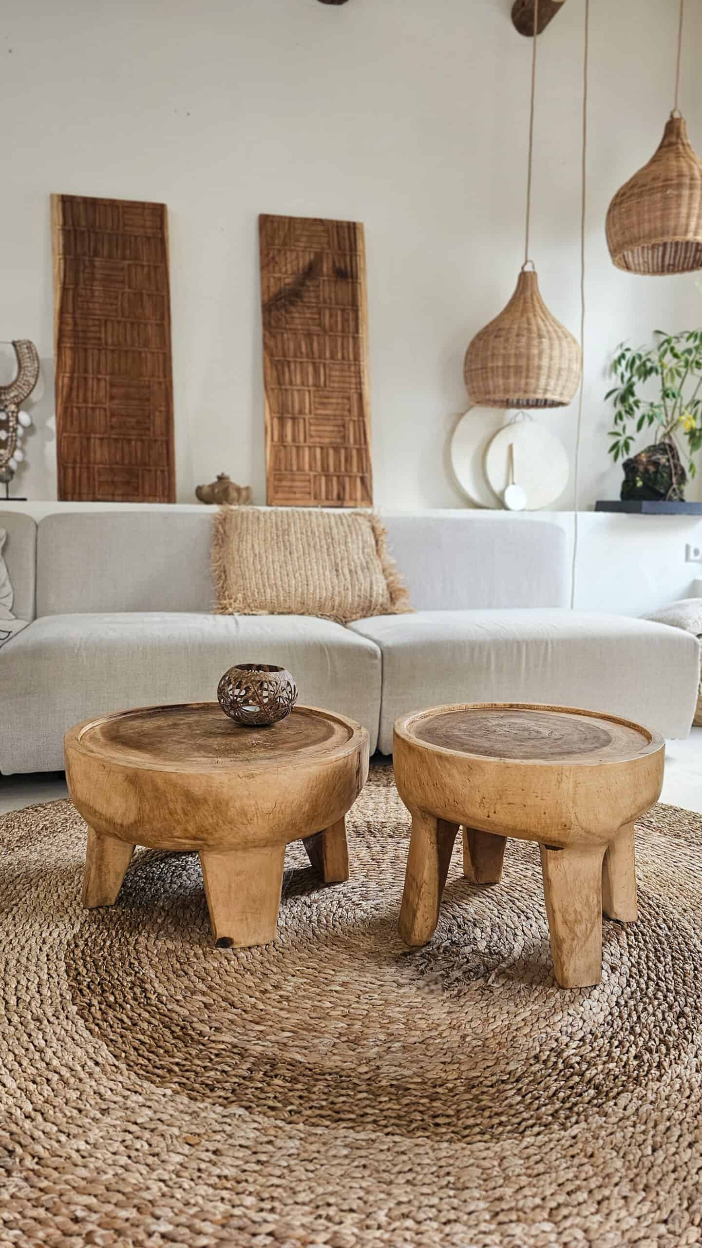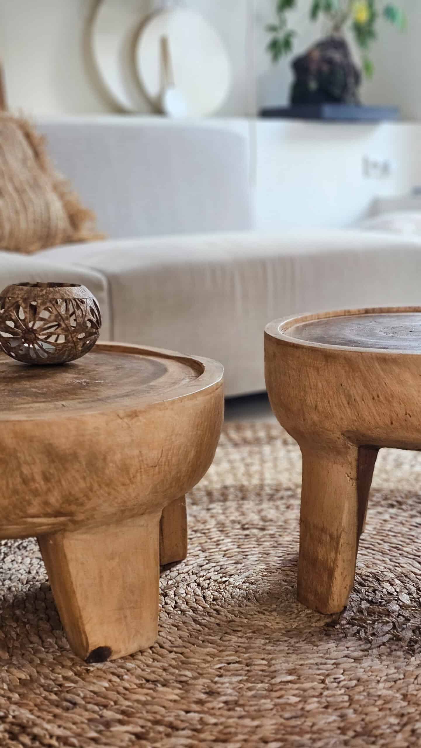 Deze tafeltjes zijn uit één stuk gemaakt en daarom prachtige puur natuur exemplaren. Qua hoogte zit ongeveer 5 cm verschil. Het kleinere tafeltje is wat hoger dan de bredere tafel waardoor ze prachtig staan bij elkaar! Echt een geweldig stel samen!