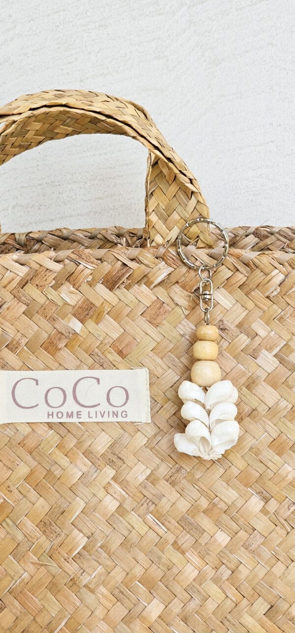 Superleuke sleutelhangers. Voor aan je sleutelbos maar ook leuk om aan je tas te hangen. Deze is met witte schelpjes.