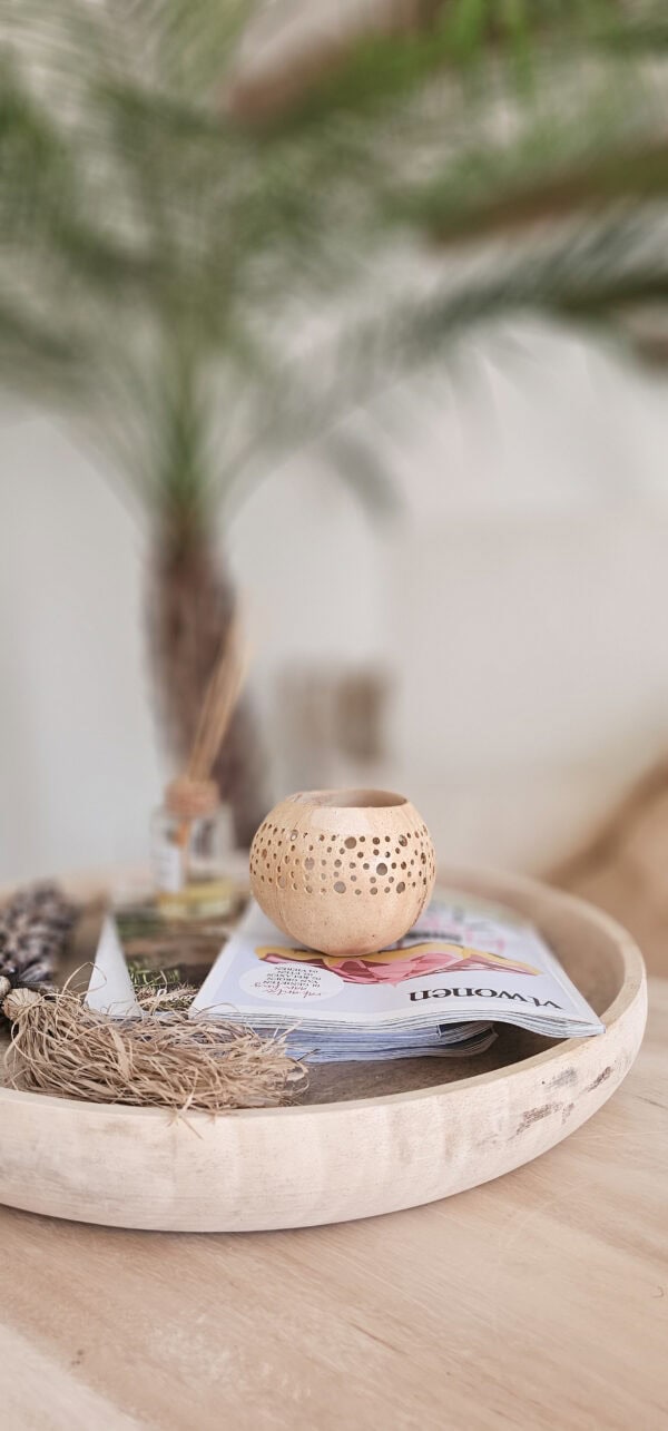 Een uniek kokos bakje met schubben, waarin een geurloze kaars is verwerkt. Dit natuurlijke en decoratieve stuk straalt warmte en authenticiteit uit, dankzij het bijzondere patroon van de stippen het organische karakter van de kokosnoot. Ideaal voor sfeervolle verlichting in verschillende ruimtes, zoals de woonkamer, badkamer of terras. De neutrale uitstraling maakt het gemakkelijk te combineren met diverse interieurstijlen, van bohemian tot rustiek.