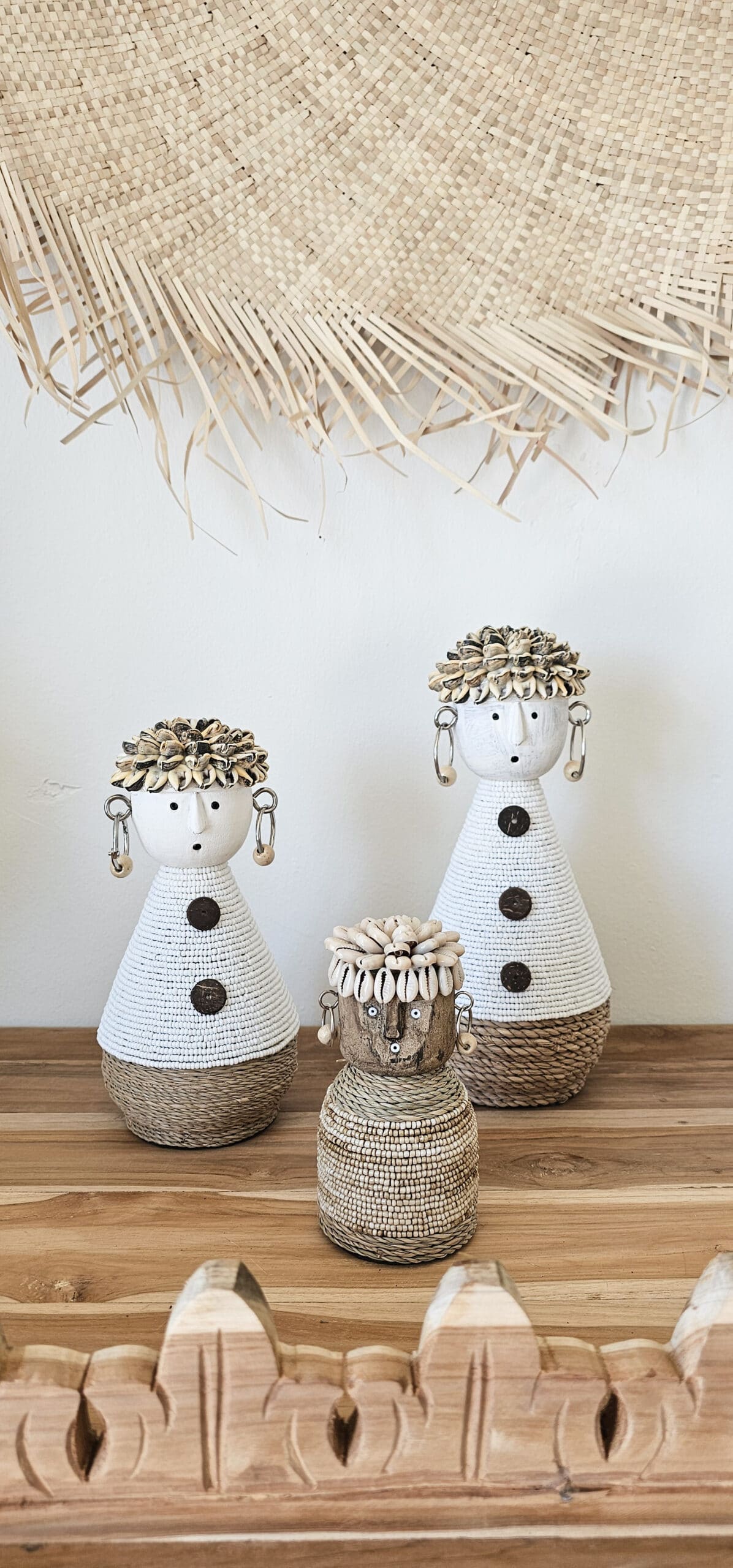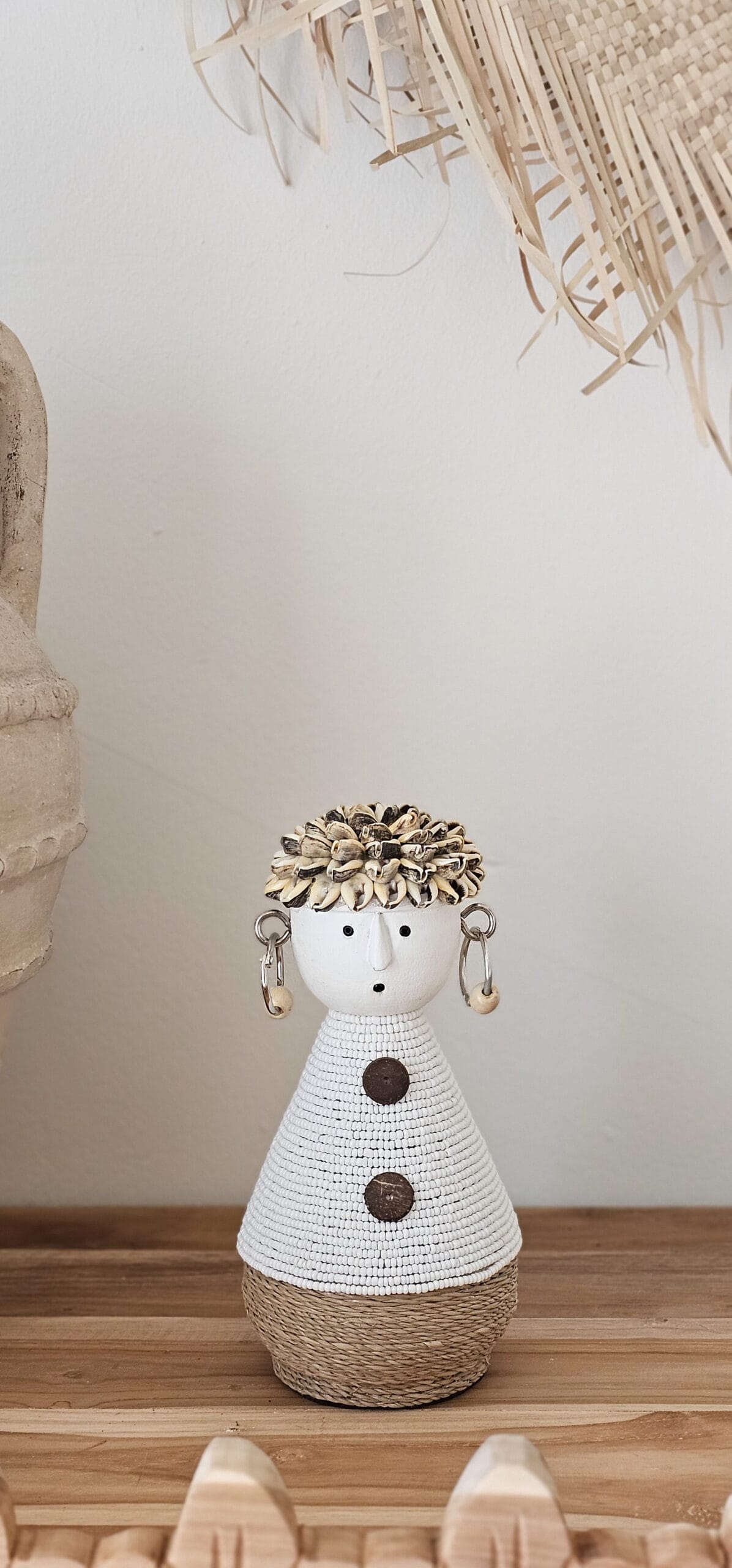 Breng charme in huis met onze prachtige houten beeldjes. Met de hand gemaakt en bewerkt met witte kraaltjes, speelse kauri schelpen en touw. Met dit beeldje haal je iets unieks in huis en creëer je een etnische sfeer in huis.