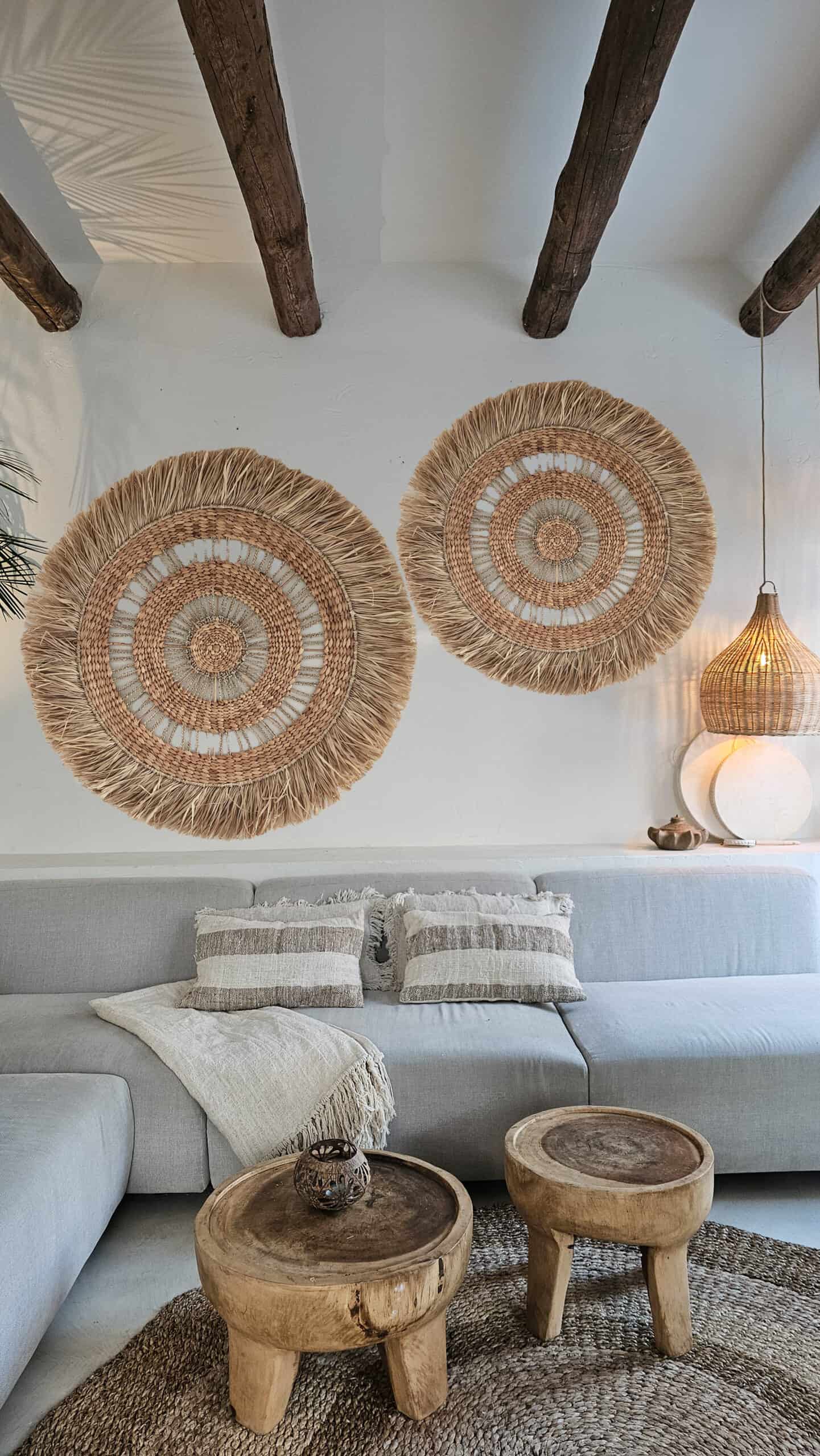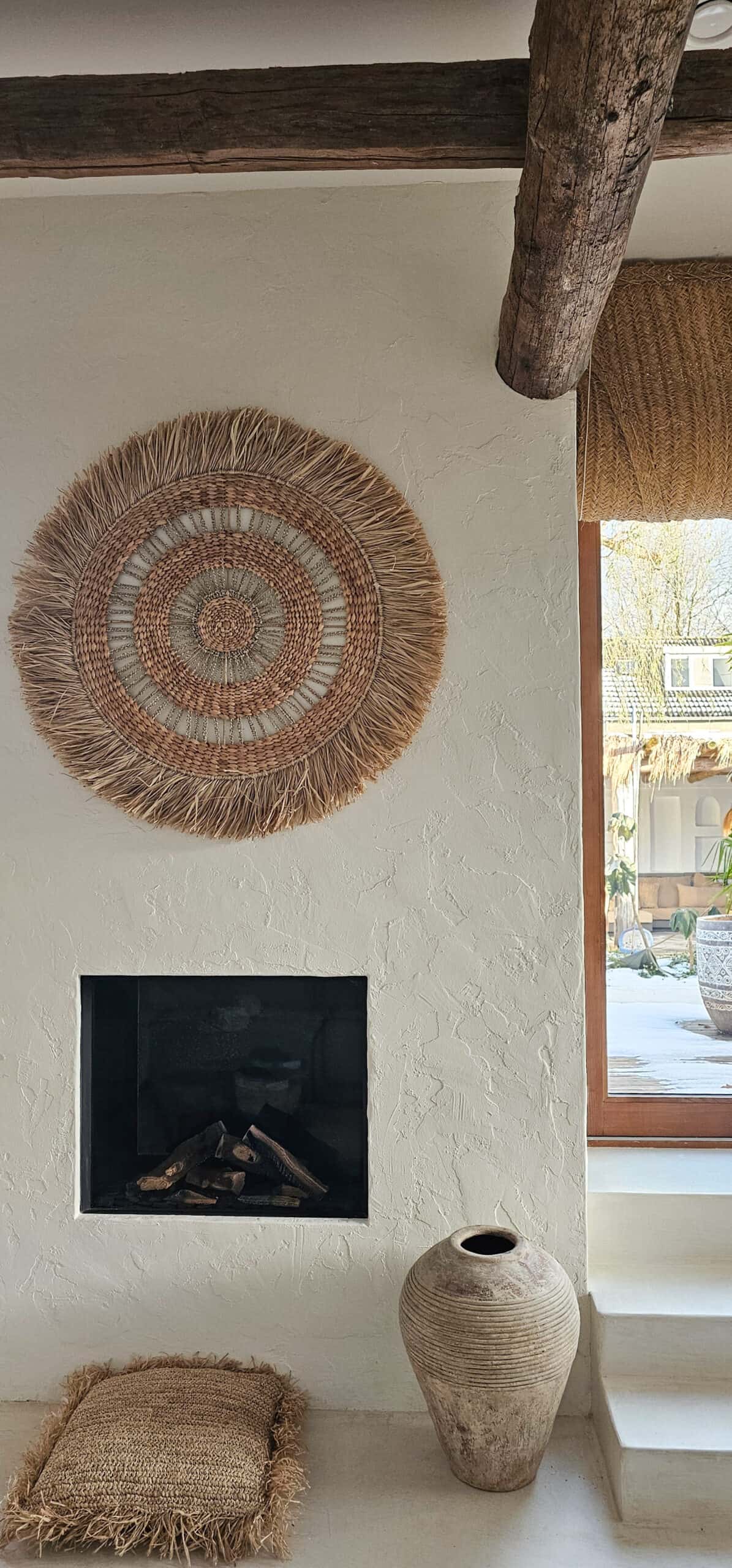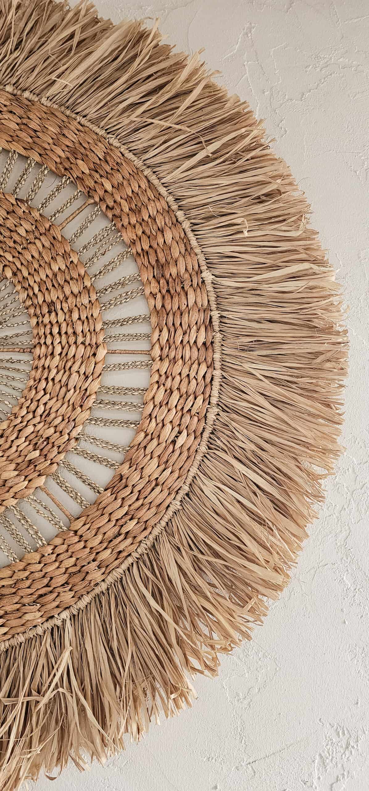 Een organische uitstraling die past in een aardse interieurstijl. De buitenrand is afgewerkt met raffia wat een speels effect geeft.