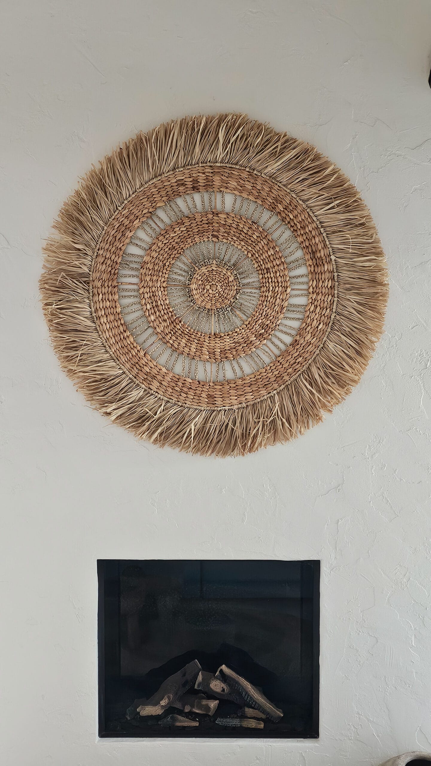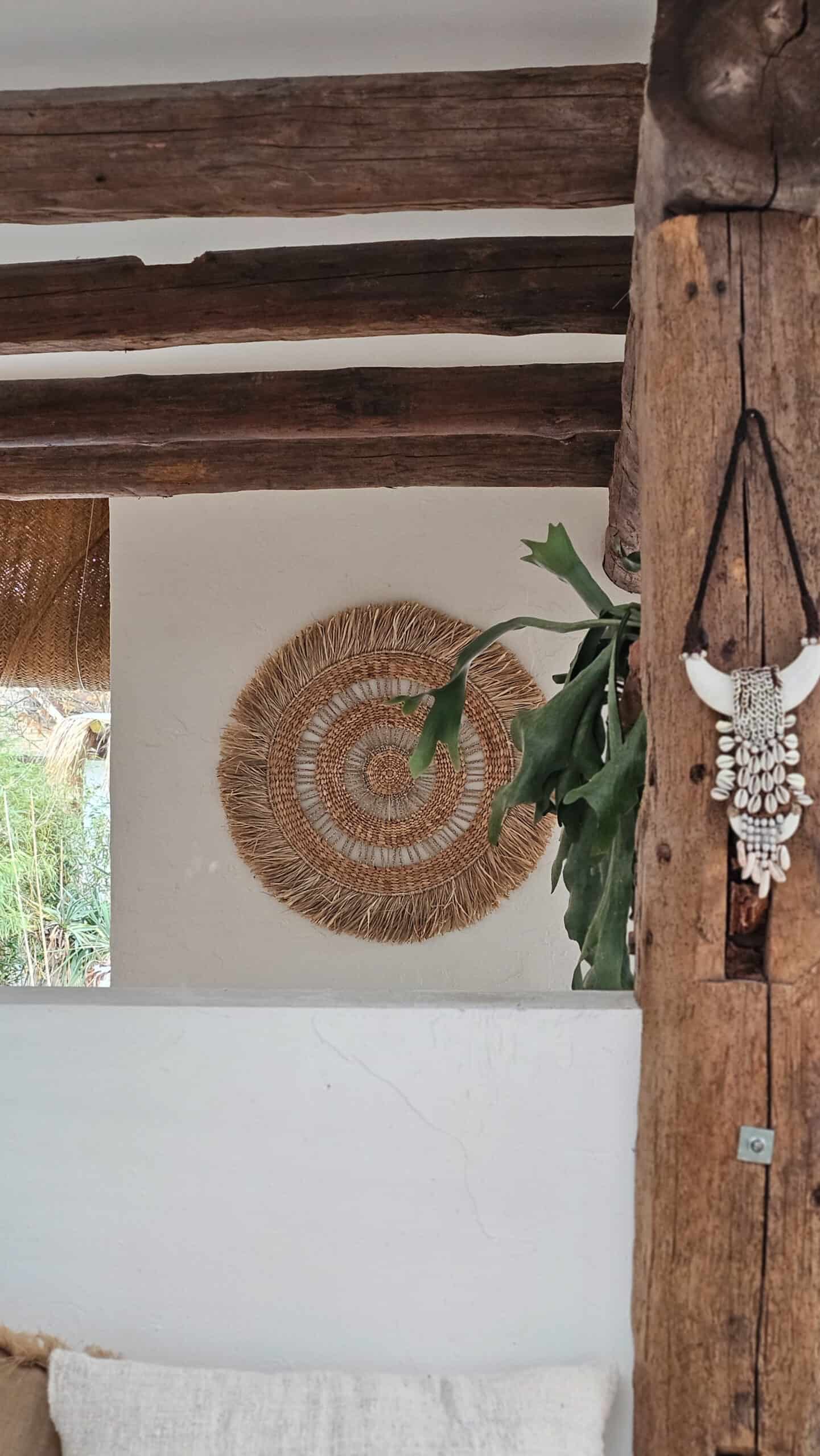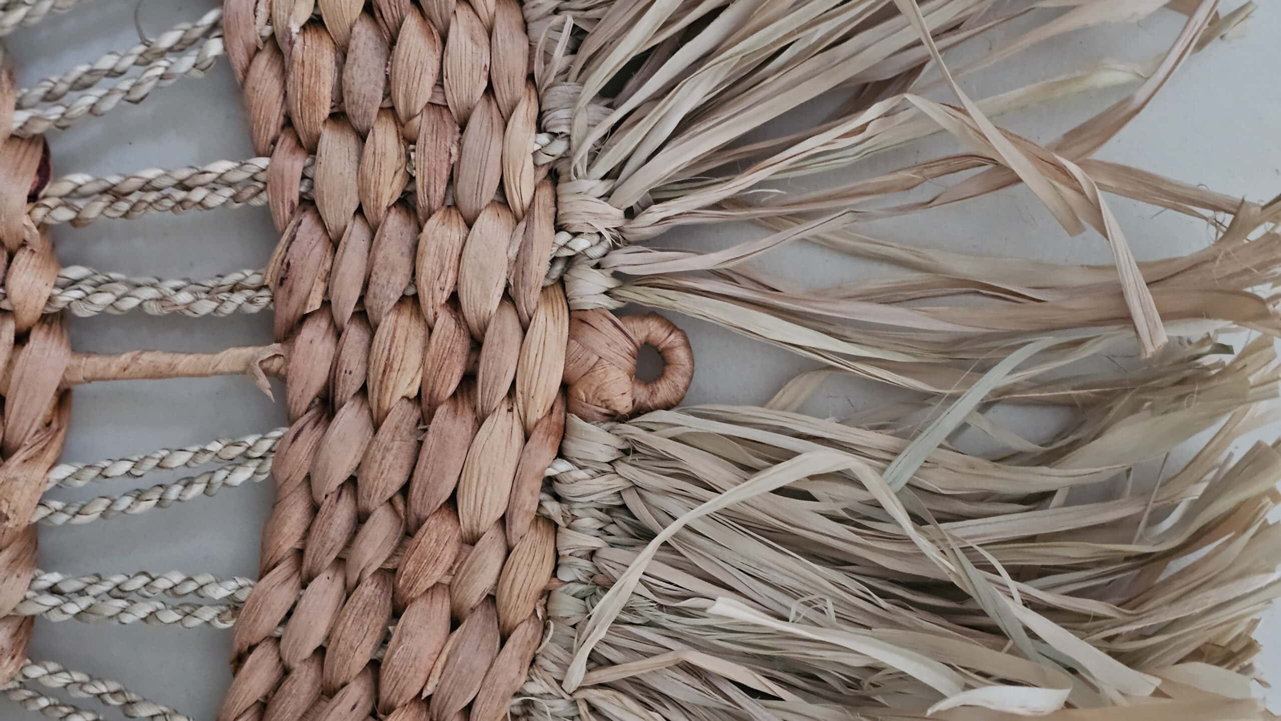 Breng natuurlijke textuur en rustieke charme in je huis met deze met de hand vervaardigt uit waterhyacint, touw en raffia wanddecoratie.