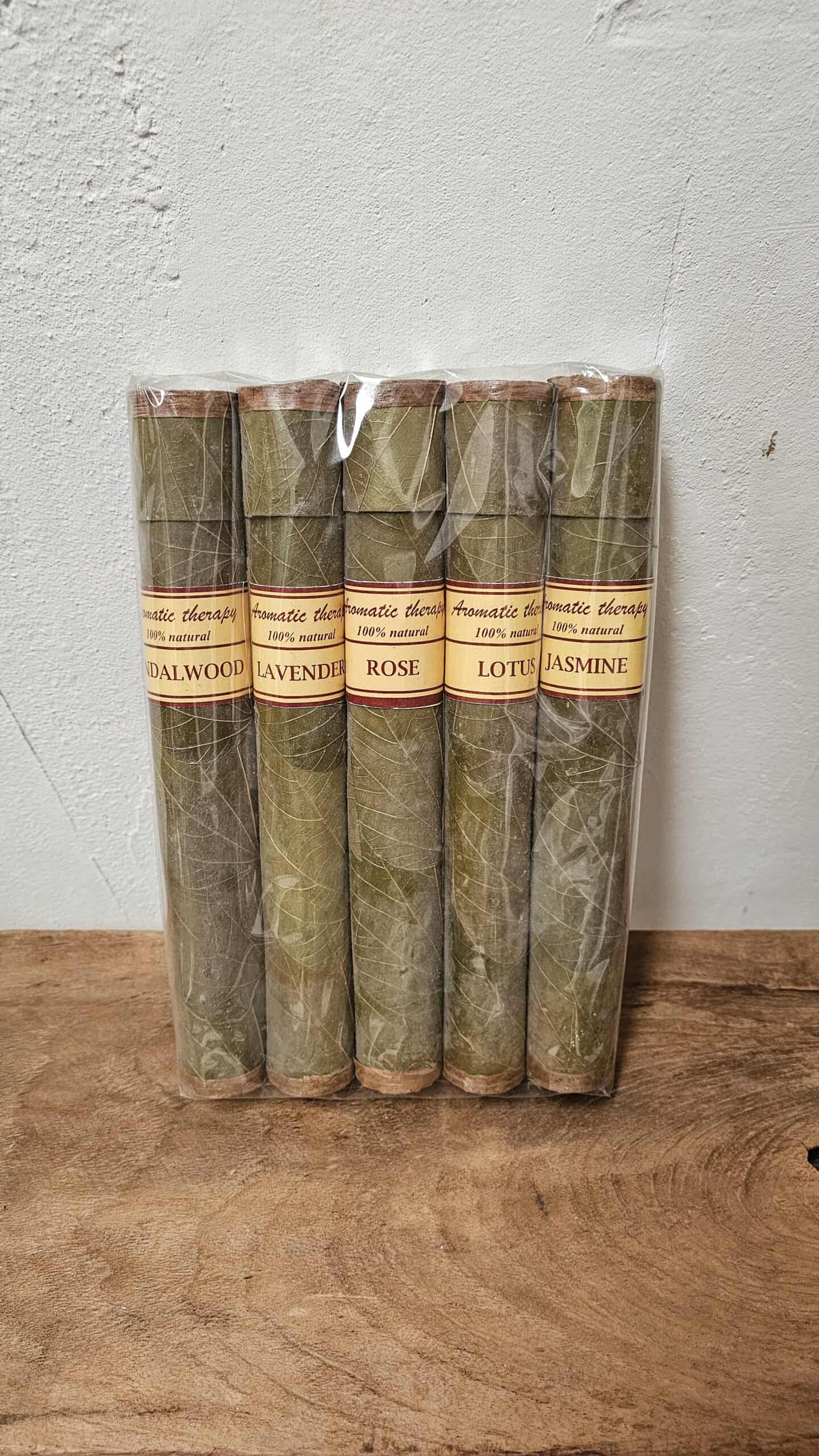 Het is een set van 5 verschillende geuren in superleuke naturel kokers gemaakt van bananenblad. Hoe leuk is dat? We hebben groene of beige kokers. Mocht je een voorkeur hebben zet dit dan bij de opmerkingen bij het bestellen.